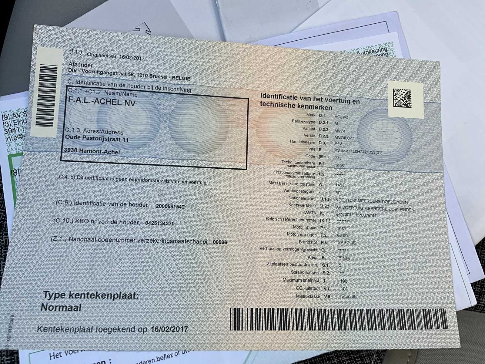 Aanwezig : kentekenbewijs deel I en II, gelijkvormigheidsattest en keuringsbewijs geldig tot 16/02/2026. Nee Kenteken: 1RSC588 Merk: Volvo Model: V40 Bouwjaar: 2017 Chassisnummer: YV1MV74L0H2421233 Afgelezen kilometerstand: 314867km Cilinderinhoud: 1969cc Vermogen (kW): 88kW Brandstof: Gasolie Datum eerste inschrijving: 16/02/2017 Aantal zitplaatsen: 5 Nationaliteit documenten: Belgisch Aantal deuren: 5 Aantal sleutels: 1 CO2-uitstoot NEDC: 101 Emissieklasse: Euro 6b Kentekenpapieren compleet?: true Boorddocumenten aanwezig?: true Onderhoudshistorie: Aanwezig Startinformatie: Rijdt