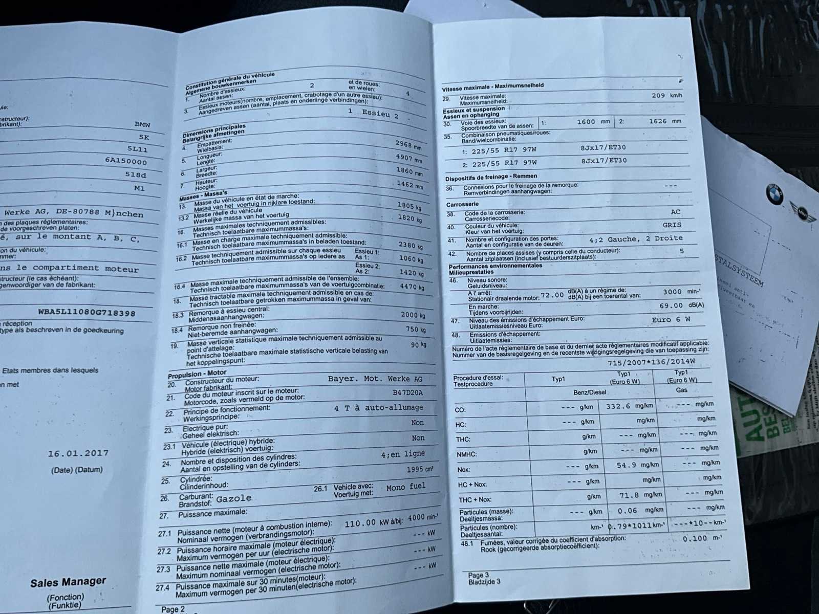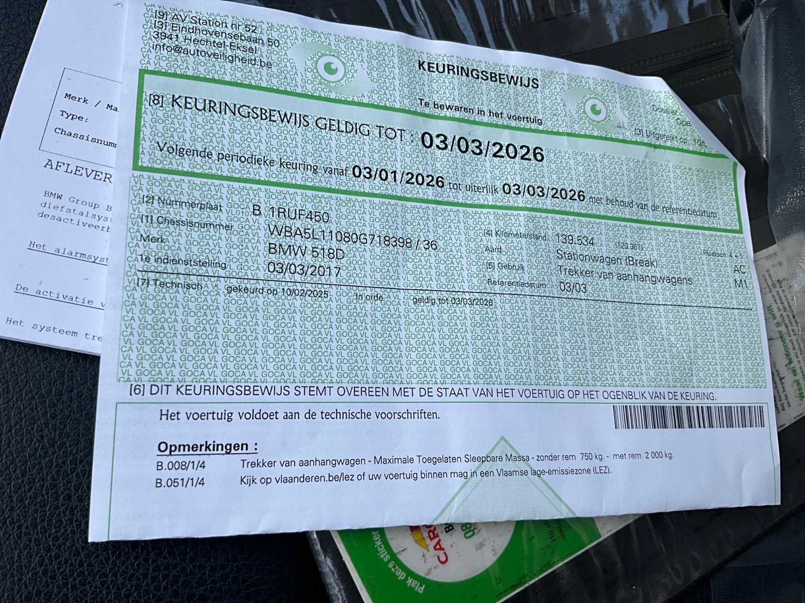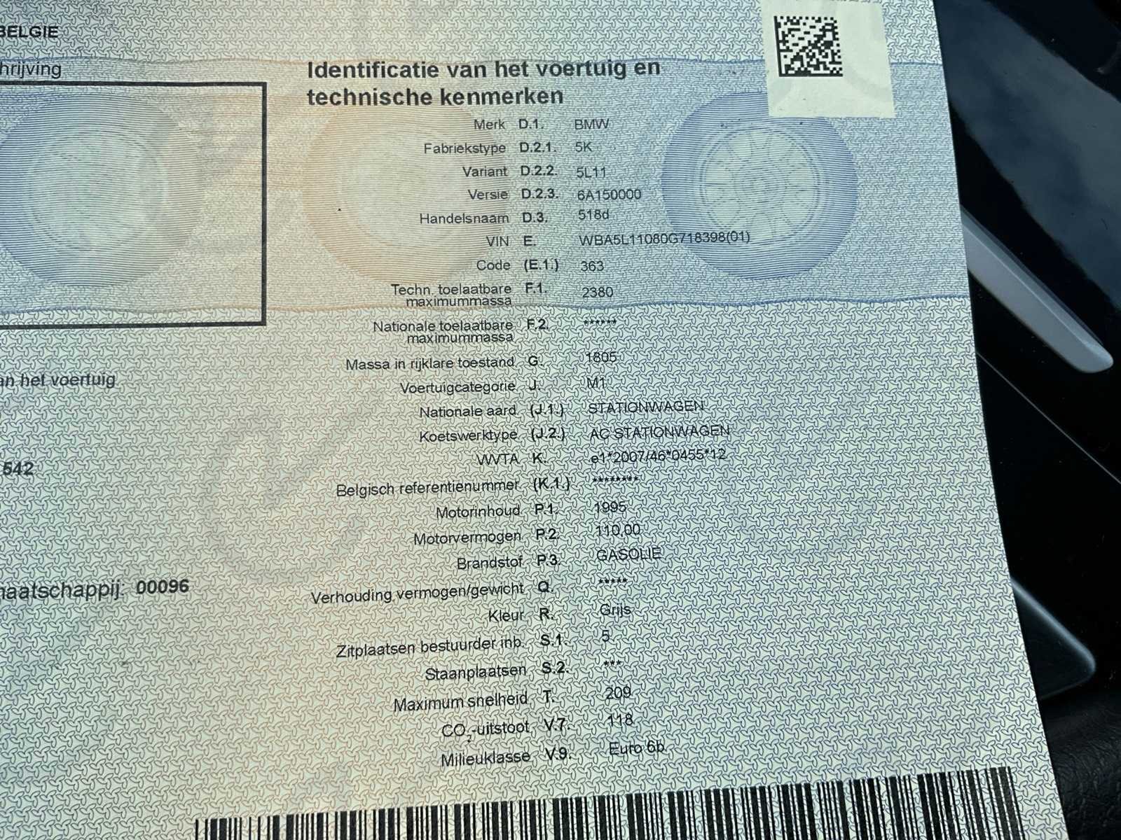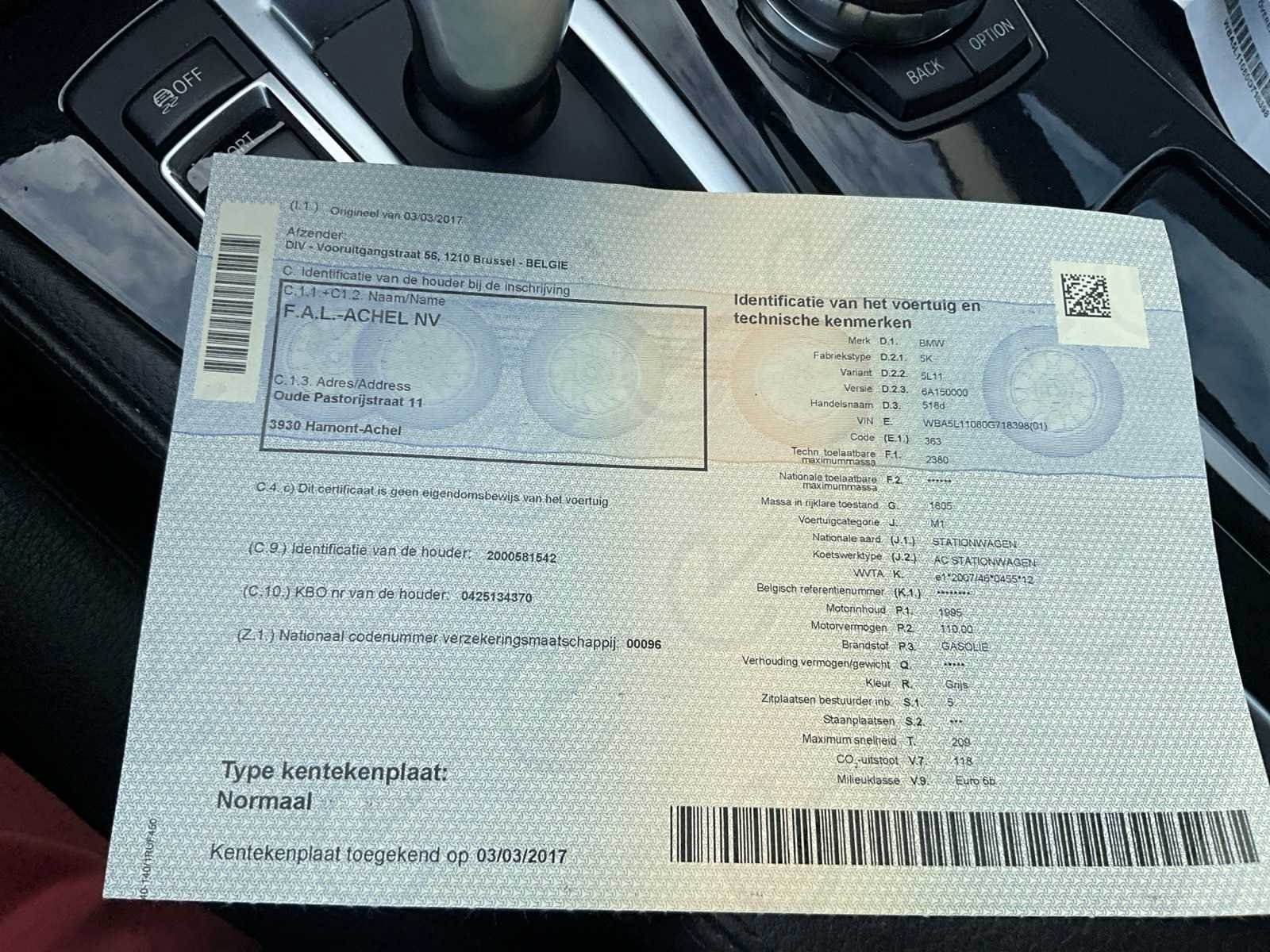 Aanwezig : kentekenbewijs deel I en II, gelijkvormigheidsattest en keuringsbewijs geldig tot 03/03/2026. Voorzien van trekhaak. Nee Kenteken: 1RUF450 Merk: BMW Model: 518d Bouwjaar: 2017 Chassisnummer: WBA5L11080G718398 Afgelezen kilometerstand: 153198km Cilinderinhoud: 1995cc Vermogen (kW): 110kW Brandstof: Gasolie Datum eerste inschrijving: 03/03/2017 Aantal zitplaatsen: 5 Nationaliteit documenten: Belgisch Aantal deuren: 5 Aantal sleutels: 2 CO2-uitstoot NEDC: 118 Emissieklasse: Euro 6b Kentekenpapieren compleet?: true Boorddocumenten aanwezig?: true Startinformatie: Rijdt
