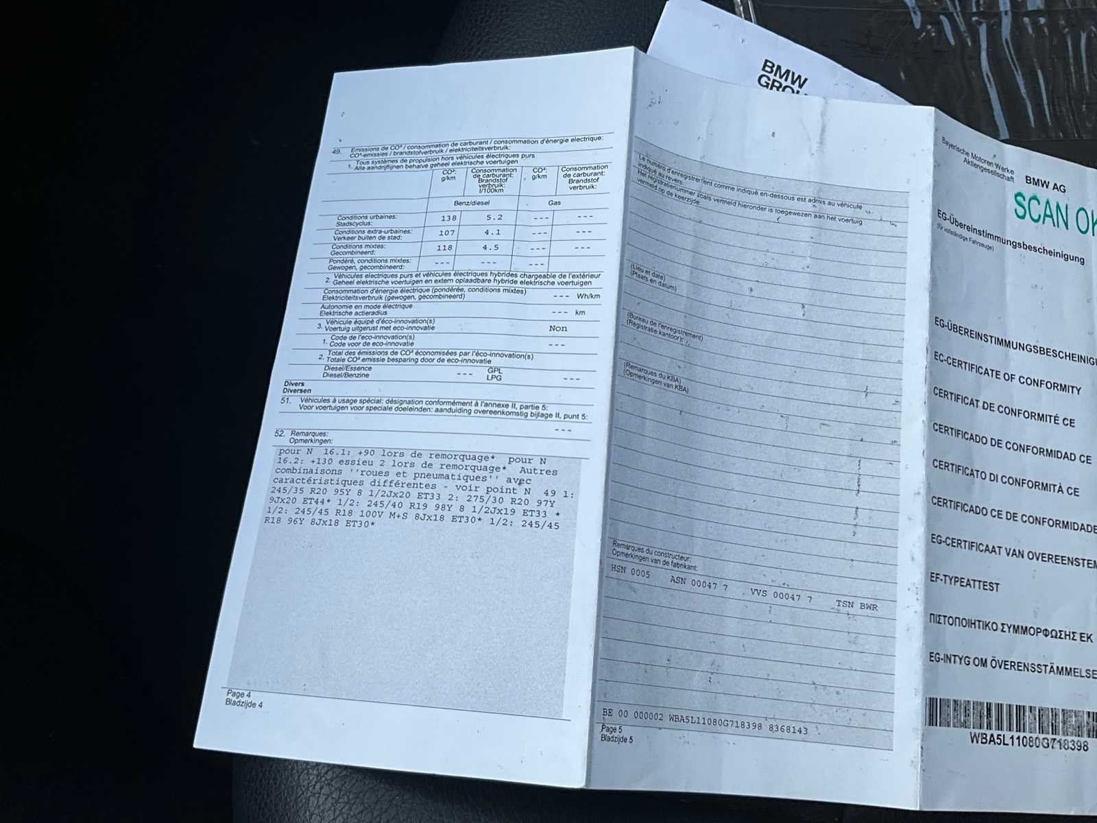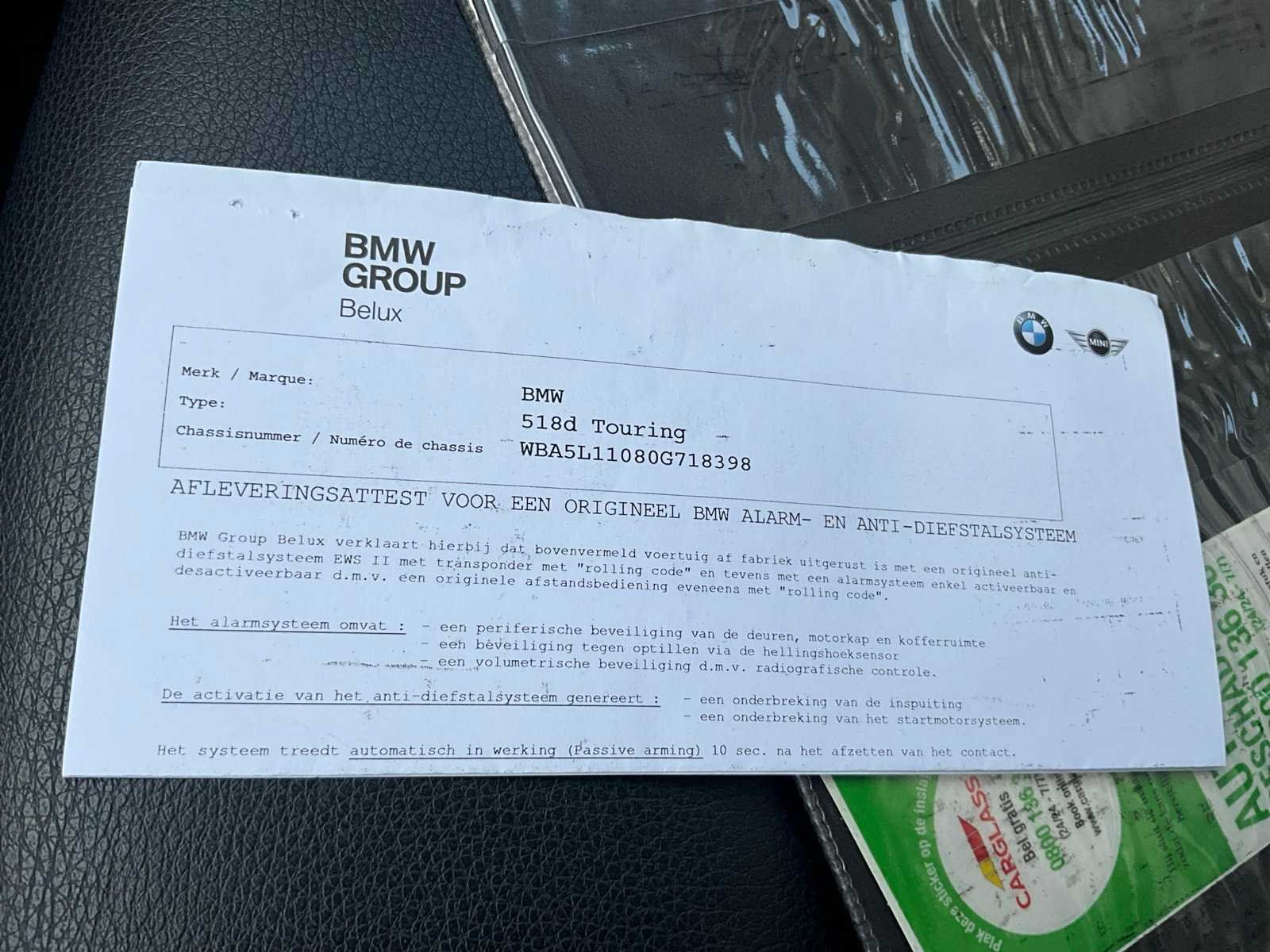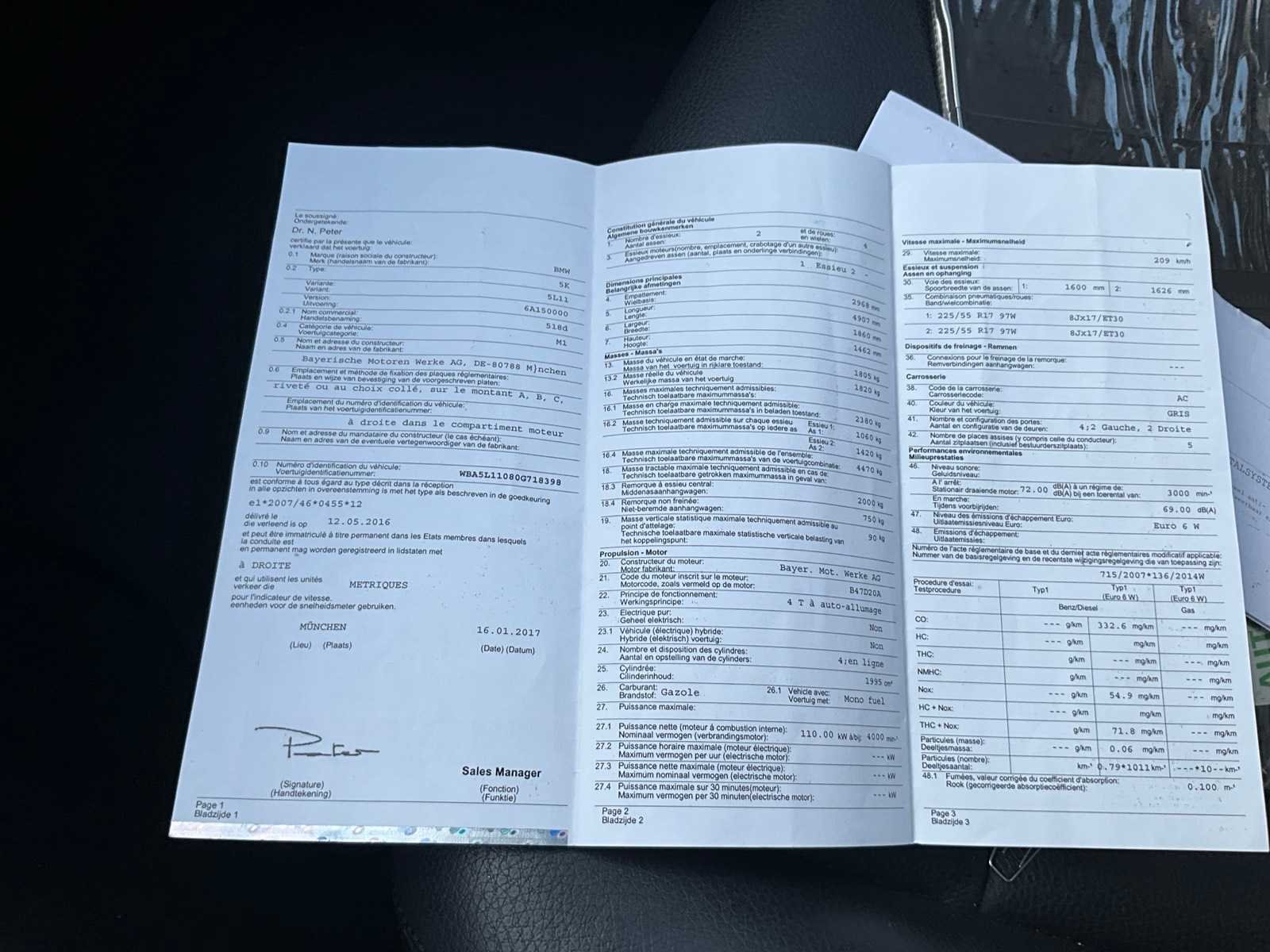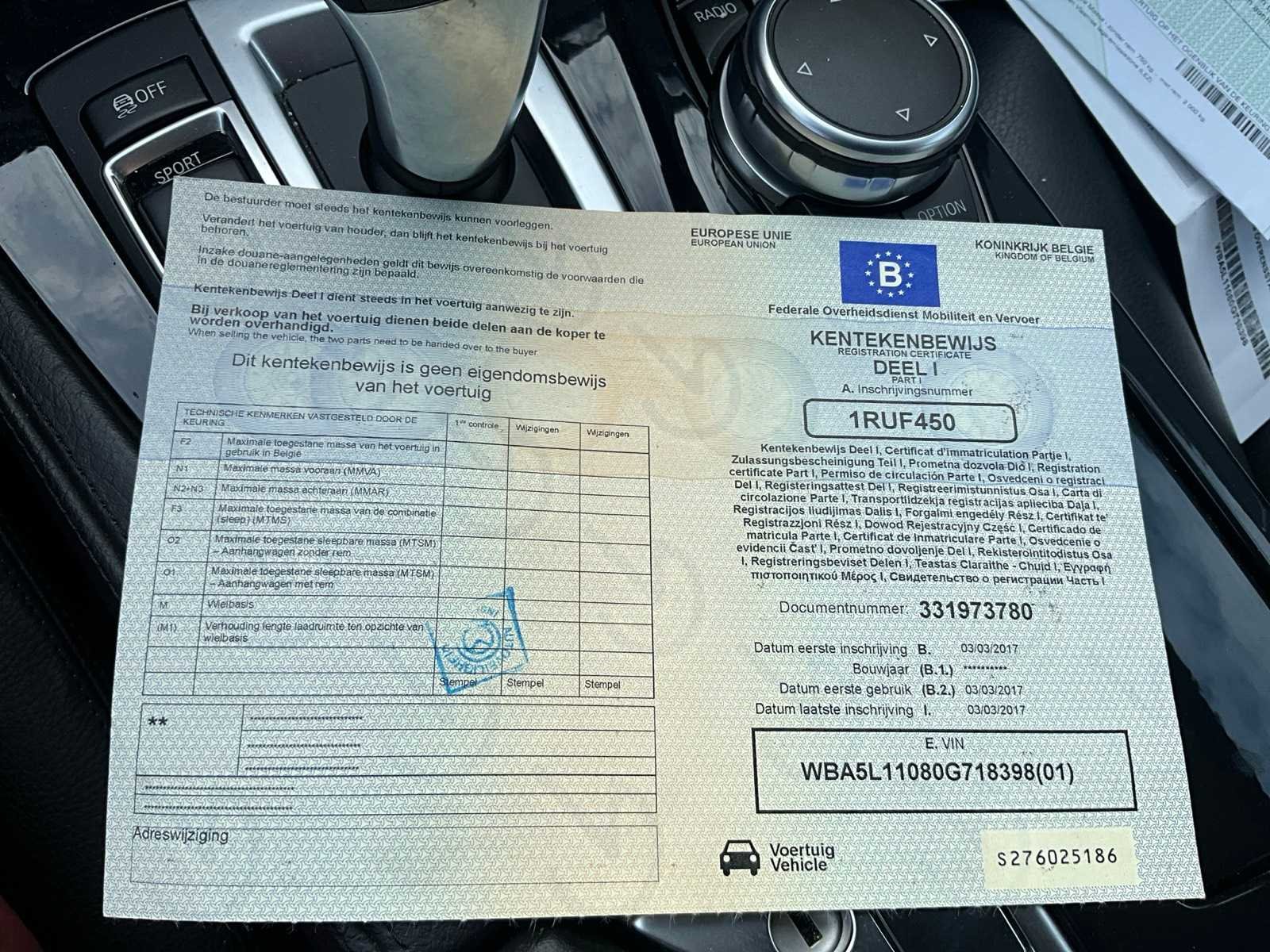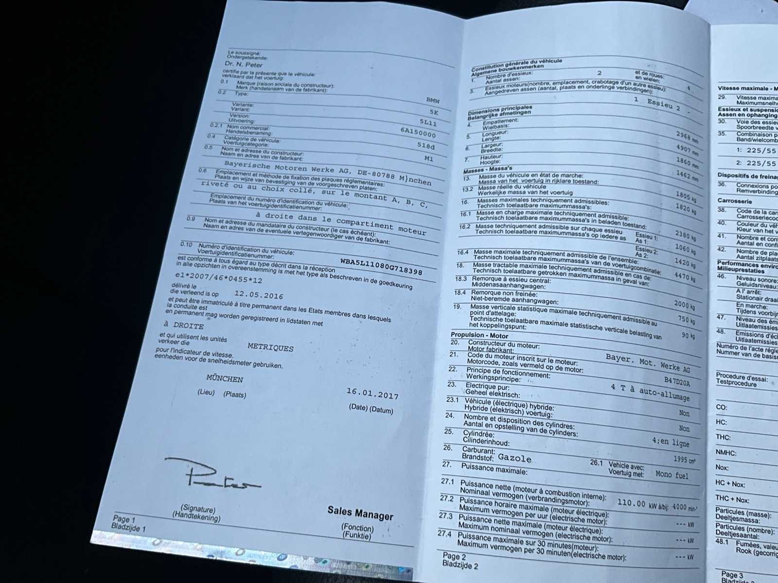 Aanwezig : kentekenbewijs deel I en II, gelijkvormigheidsattest en keuringsbewijs geldig tot 03/03/2026. Voorzien van trekhaak. Nee Kenteken: 1RUF450 Merk: BMW Model: 518d Bouwjaar: 2017 Chassisnummer: WBA5L11080G718398 Afgelezen kilometerstand: 153198km Cilinderinhoud: 1995cc Vermogen (kW): 110kW Brandstof: Gasolie Datum eerste inschrijving: 03/03/2017 Aantal zitplaatsen: 5 Nationaliteit documenten: Belgisch Aantal deuren: 5 Aantal sleutels: 2 CO2-uitstoot NEDC: 118 Emissieklasse: Euro 6b Kentekenpapieren compleet?: true Boorddocumenten aanwezig?: true Startinformatie: Rijdt