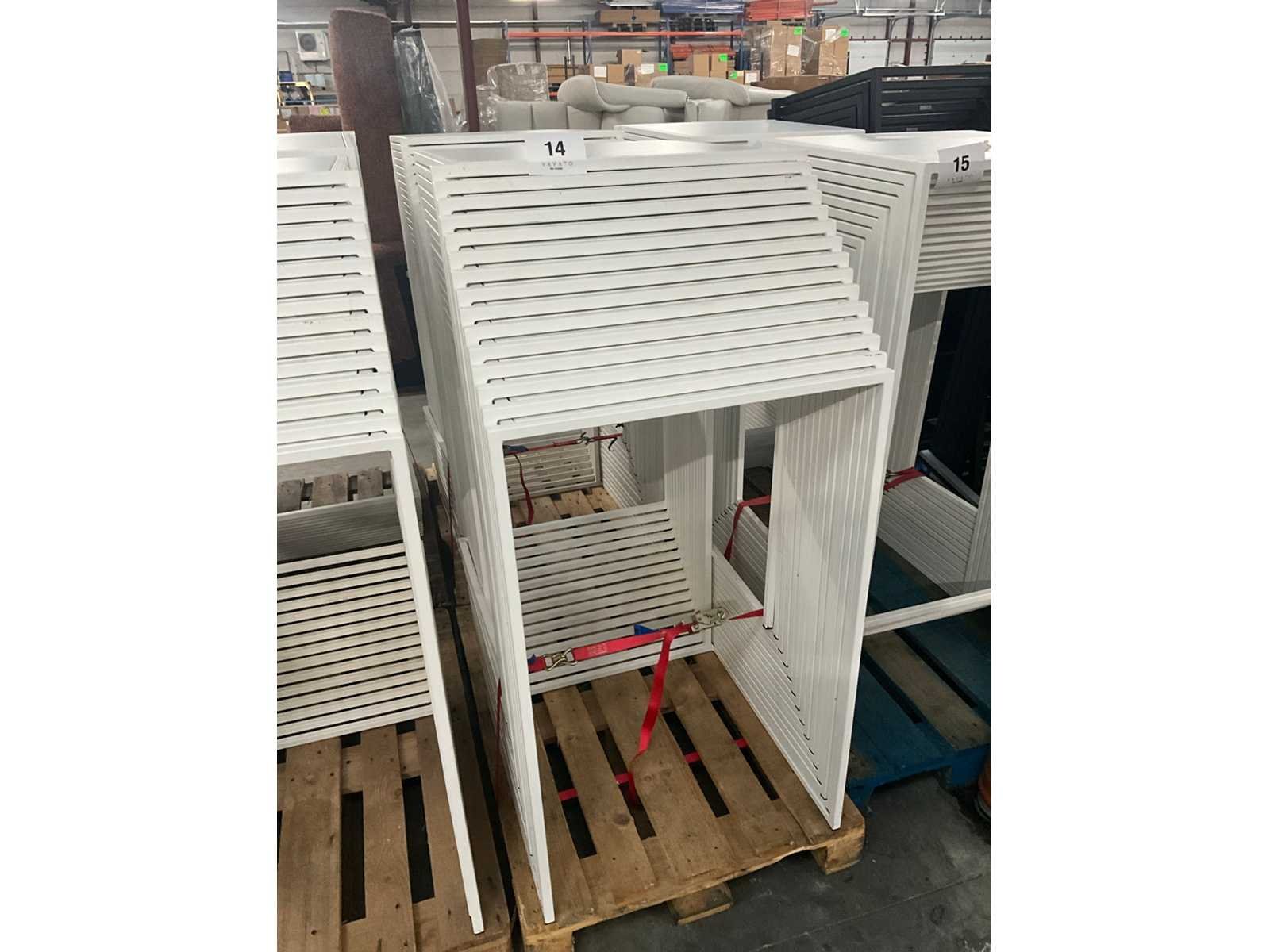 Stapelbaar, op pallet Nee Kleur: Wit Lengte: 70cm Breedte: 70cm Hoogte: 109cm Materiaal: Metaal