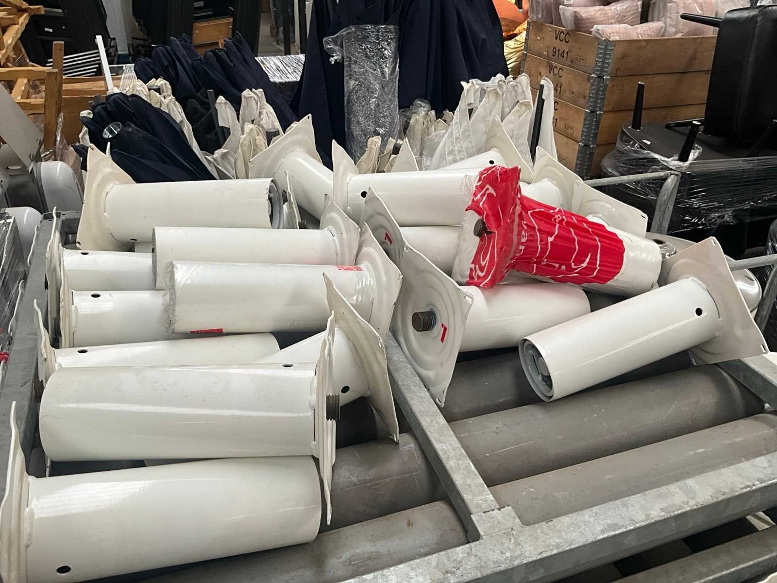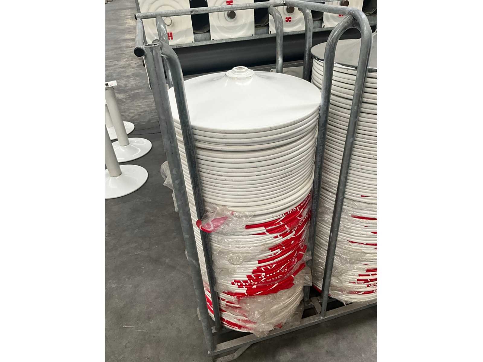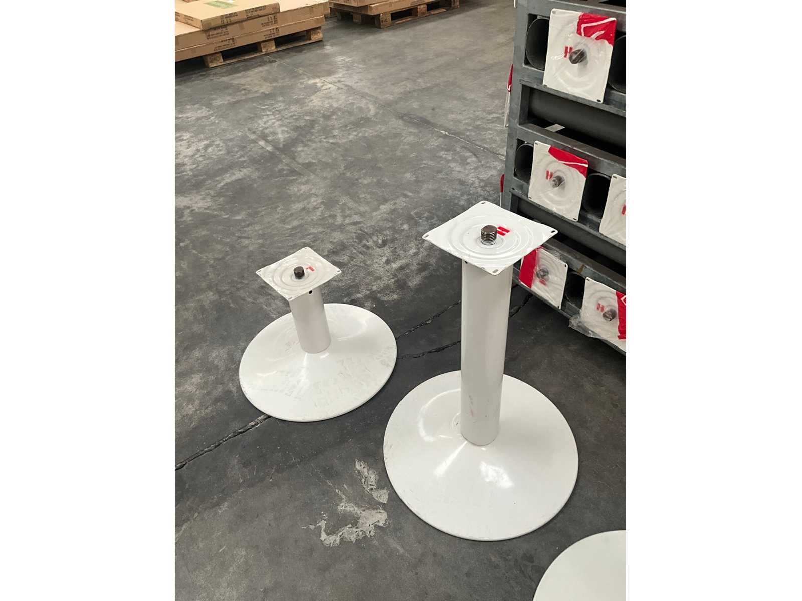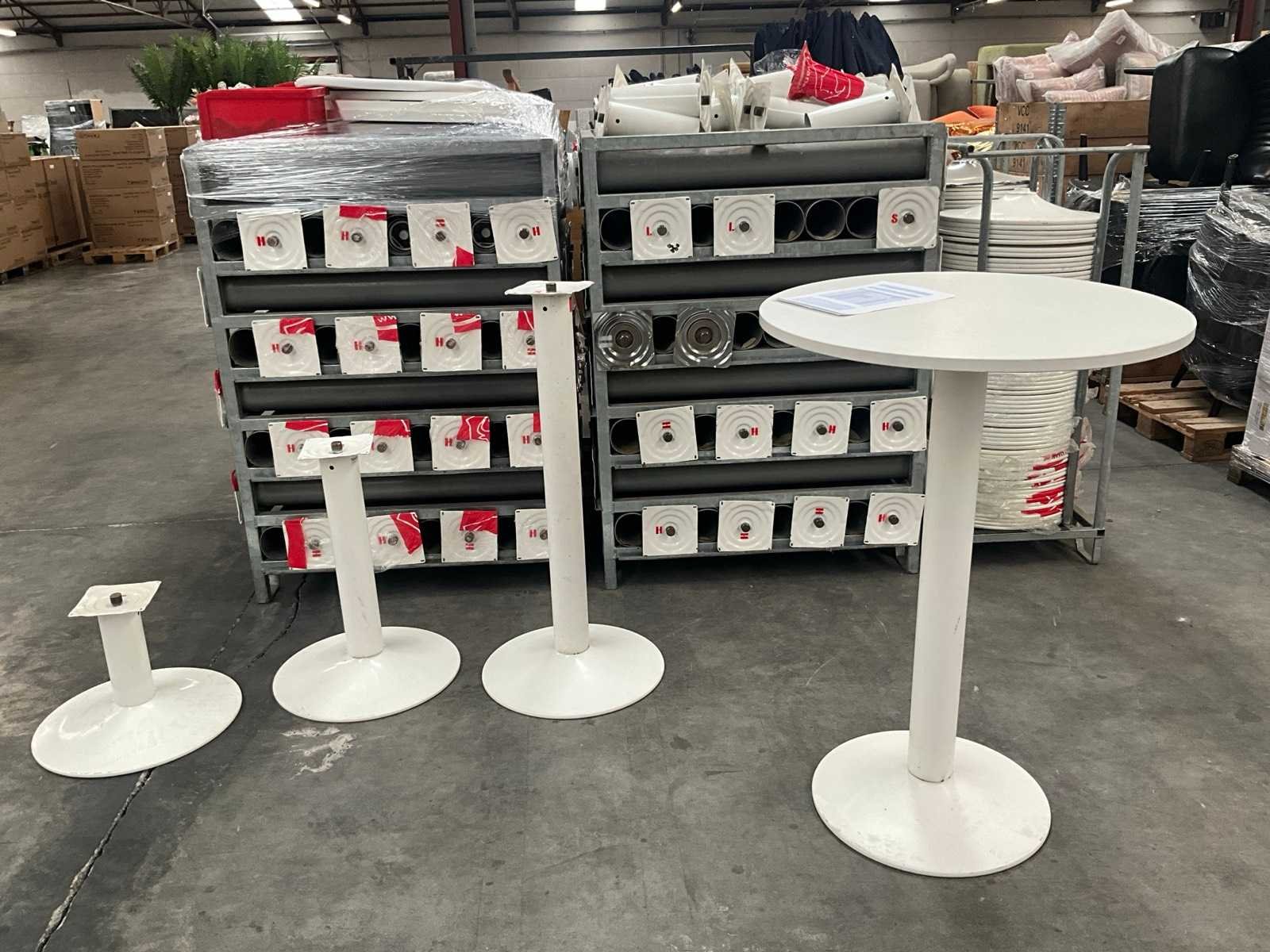Waaronder met hoogtes 35, 70 en 114cm, compleet met circa 30x bevestiging voor tafelblad en 6 diverse tafelbladen met dia van 60 tot 80 cm, liggende in 3x metalen bok met afmetingen: waaronder 1x 115x60x149cm en 2x 110x110x150cm Nee Materiaal: Metaal