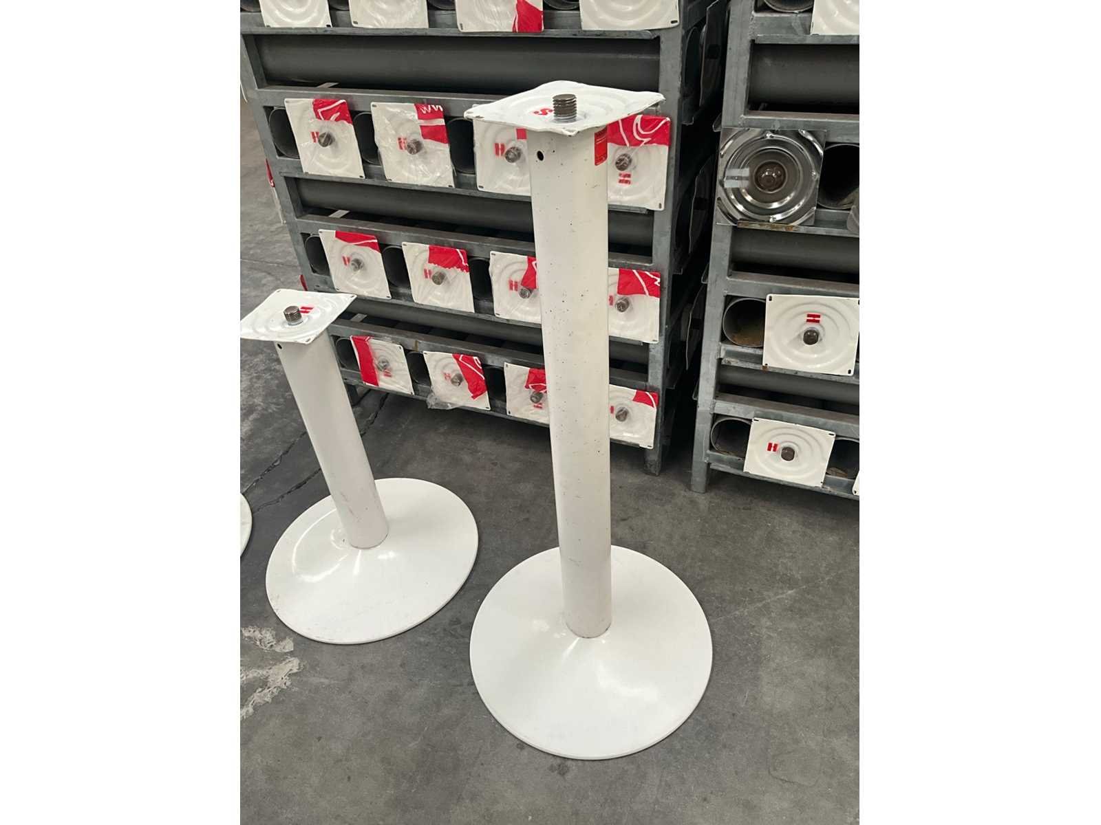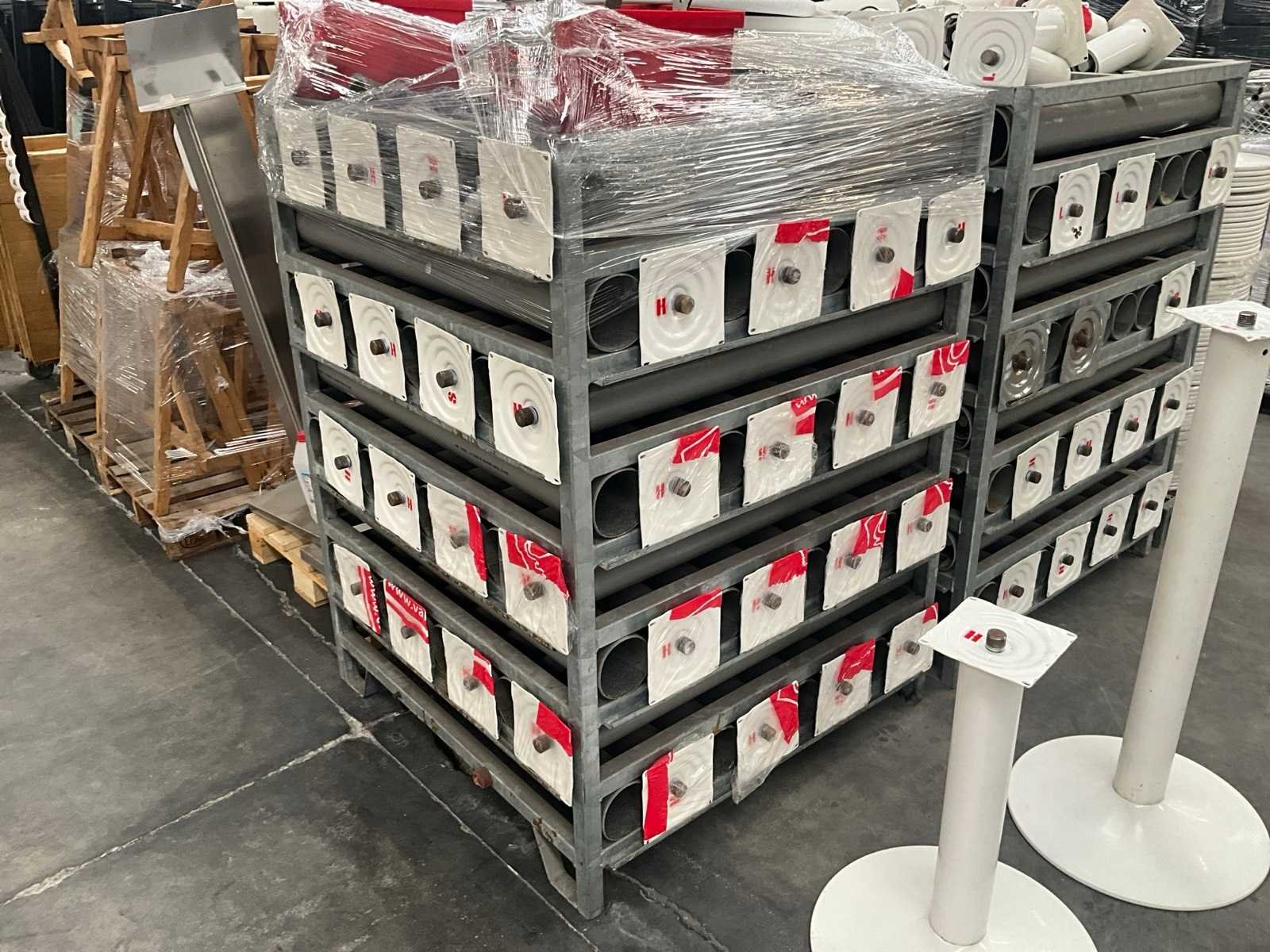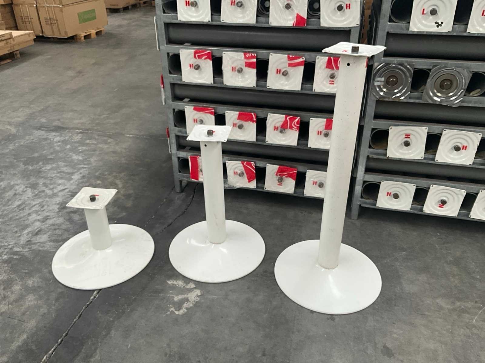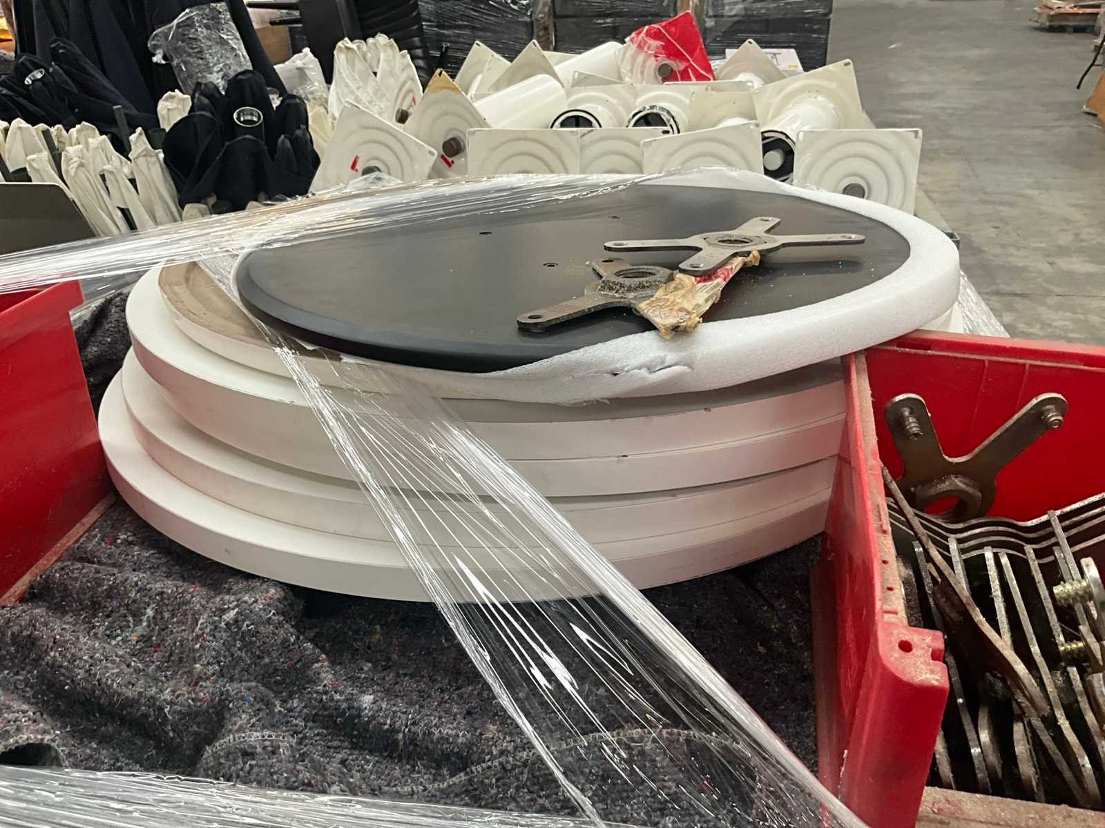 Waaronder met hoogtes 35, 70 en 114cm, compleet met circa 30x bevestiging voor tafelblad en 6 diverse tafelbladen met dia van 60 tot 80 cm, liggende in 3x metalen bok met afmetingen: waaronder 1x 115x60x149cm en 2x 110x110x150cm Nee Materiaal: Metaal