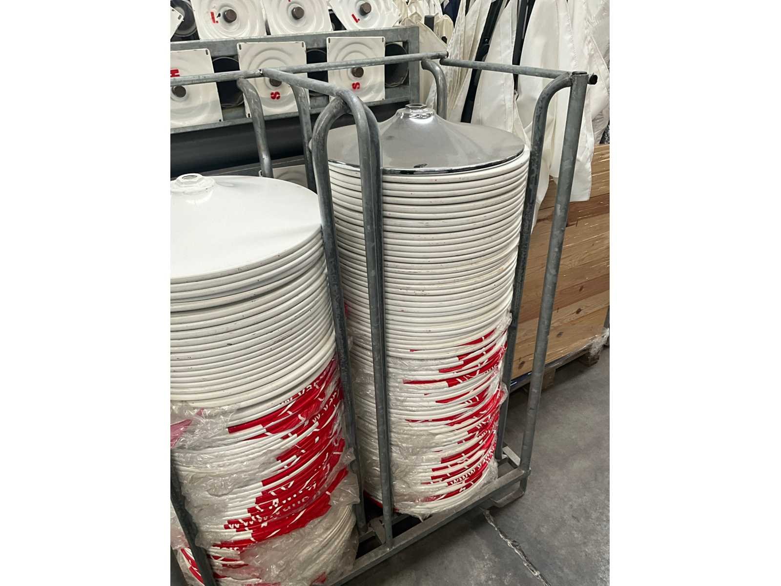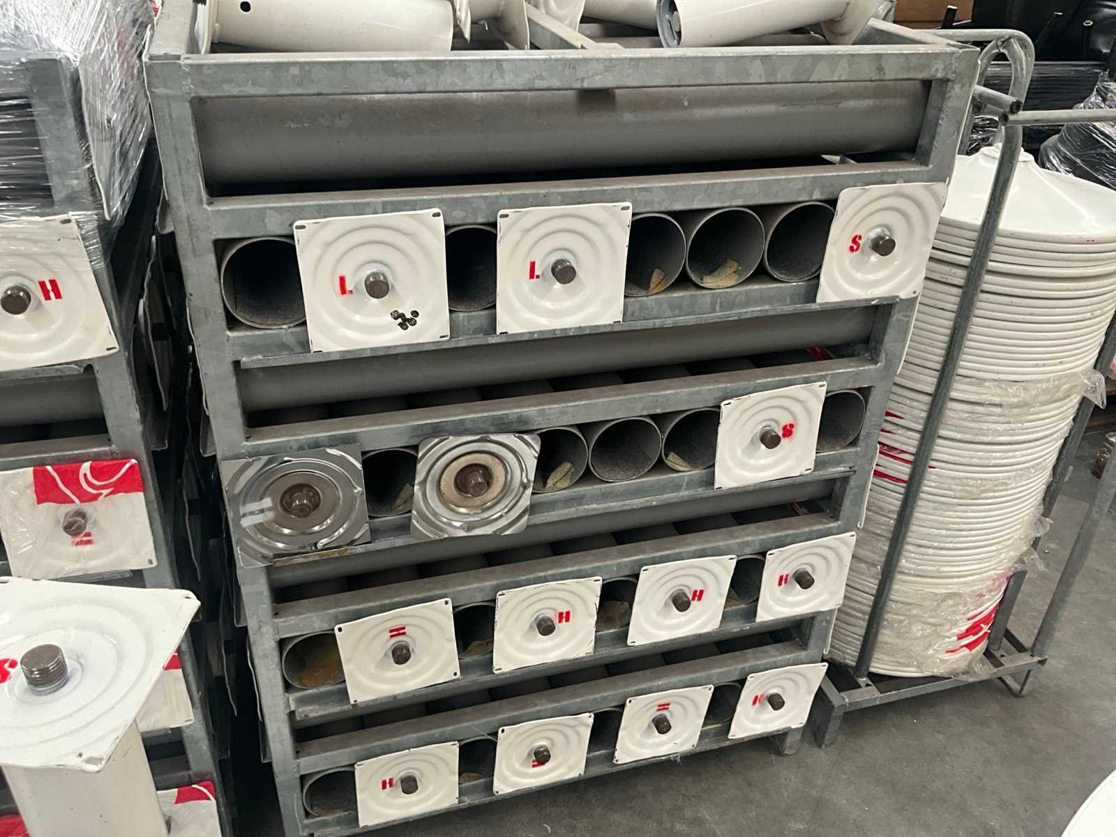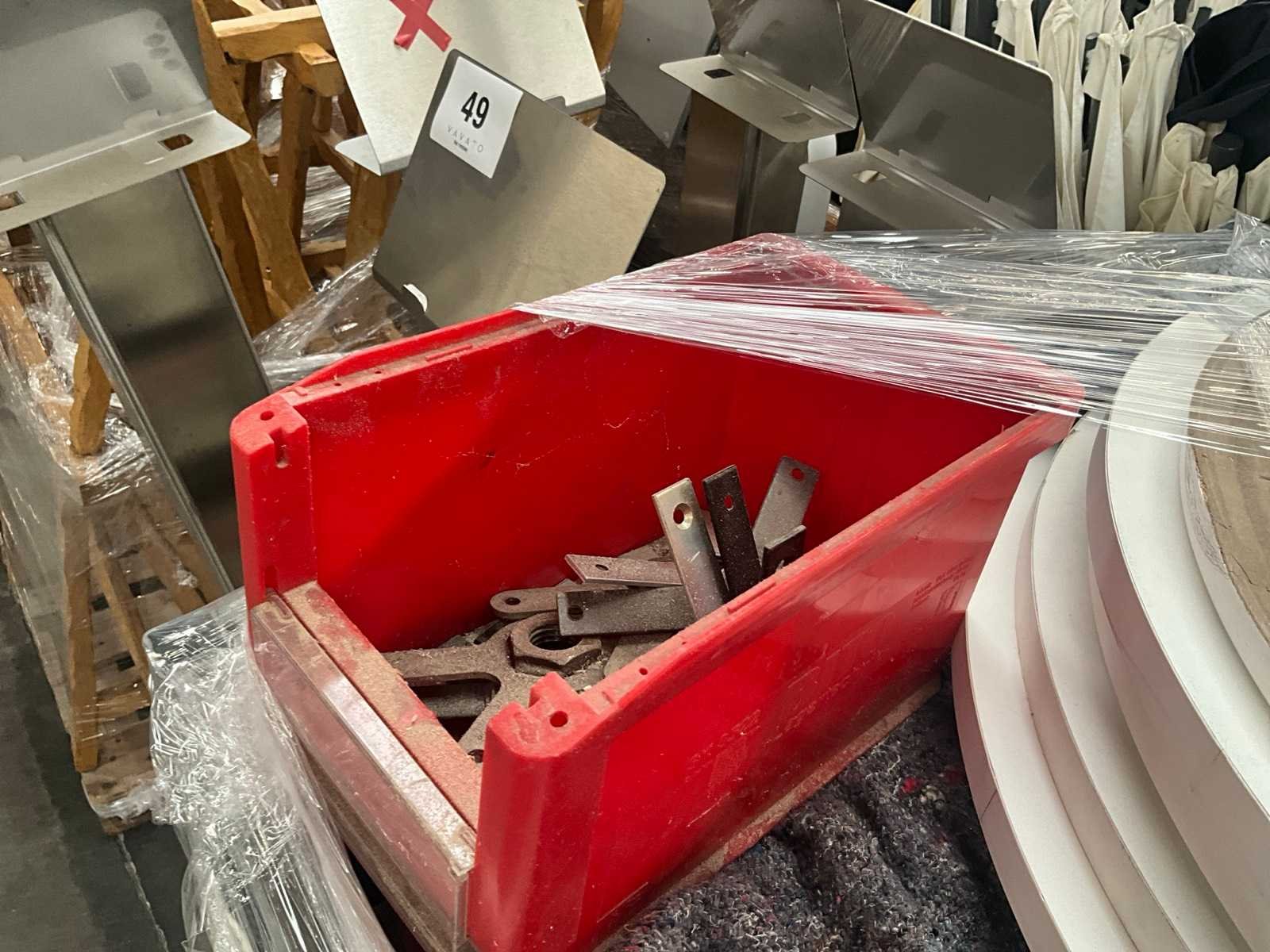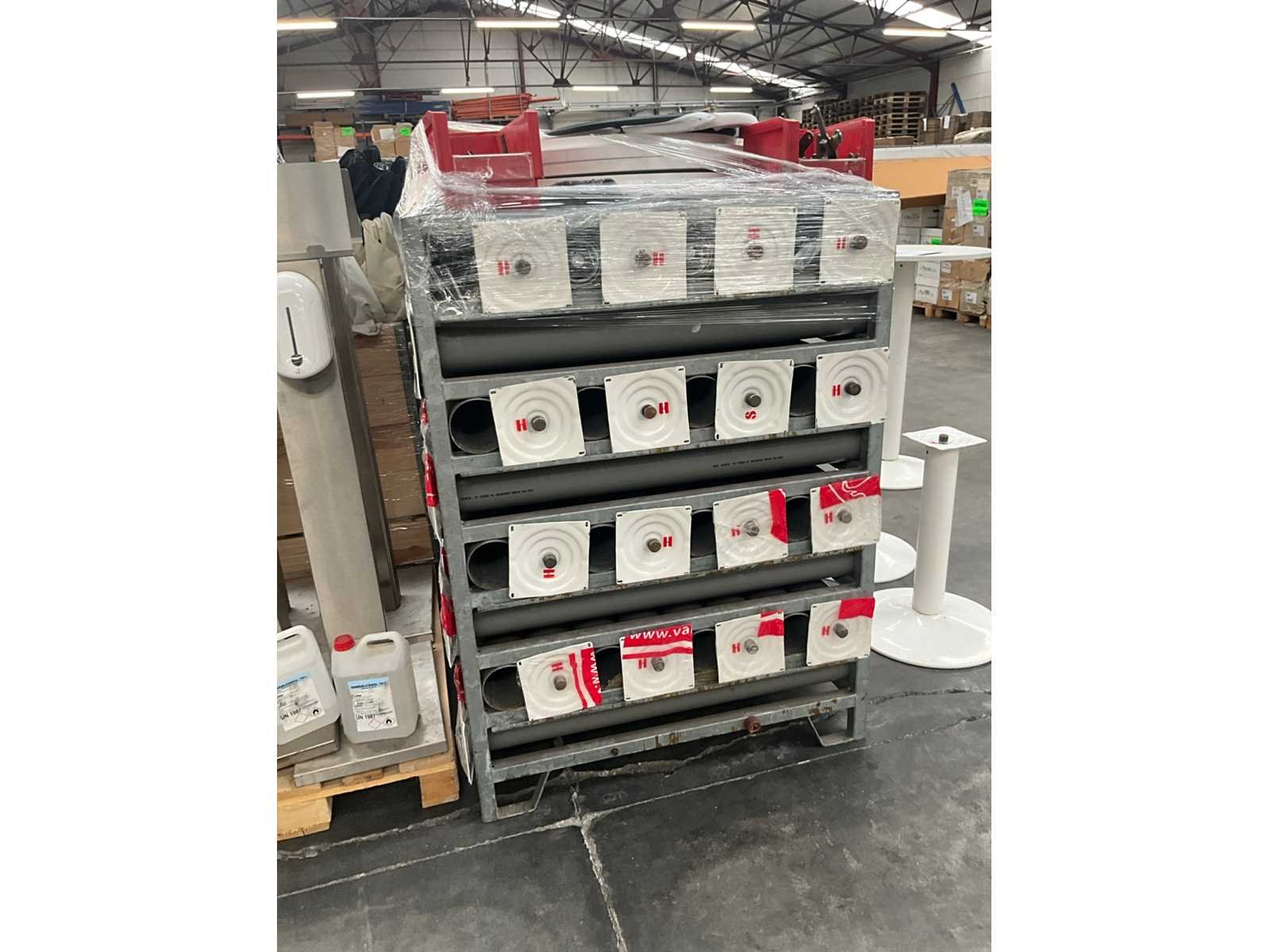 Waaronder met hoogtes 35, 70 en 114cm, compleet met circa 30x bevestiging voor tafelblad en 6 diverse tafelbladen met dia van 60 tot 80 cm, liggende in 3x metalen bok met afmetingen: waaronder 1x 115x60x149cm en 2x 110x110x150cm Nee Materiaal: Metaal