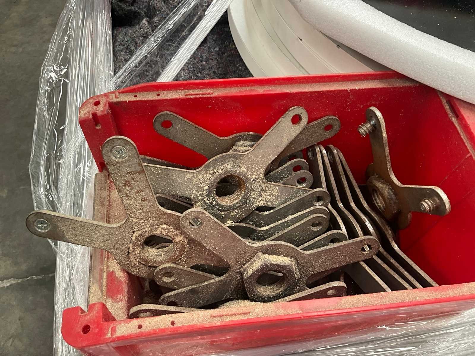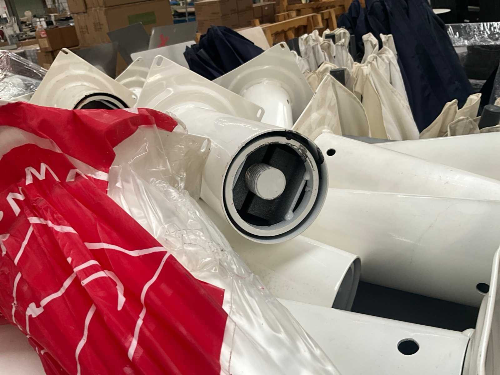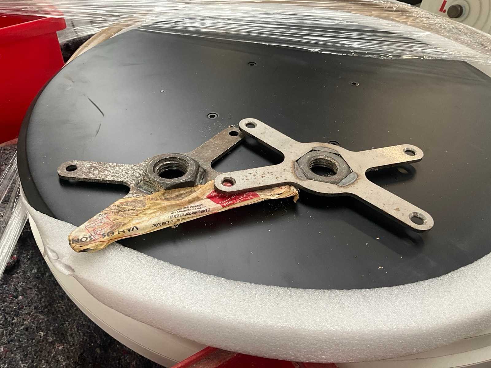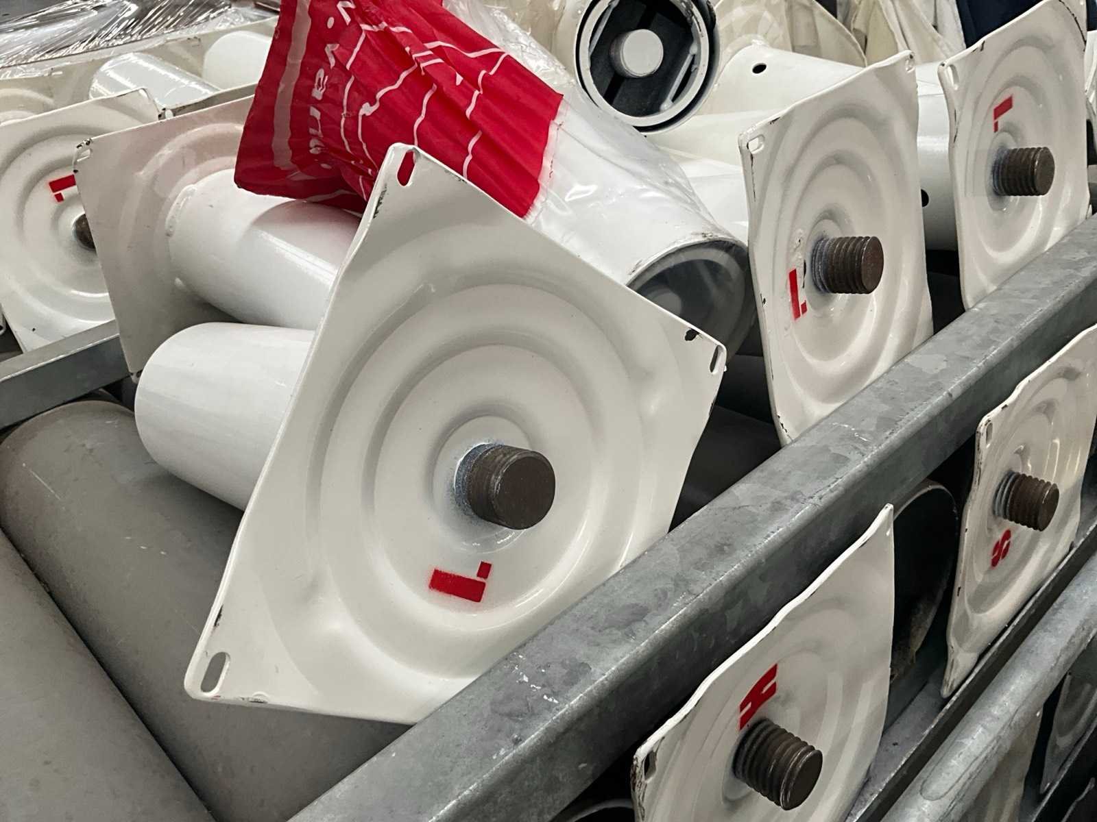 Waaronder met hoogtes 35, 70 en 114cm, compleet met circa 30x bevestiging voor tafelblad en 6 diverse tafelbladen met dia van 60 tot 80 cm, liggende in 3x metalen bok met afmetingen: waaronder 1x 115x60x149cm en 2x 110x110x150cm Nee Materiaal: Metaal