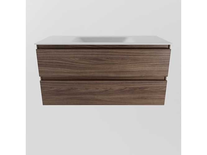 Badkamermeubel met solid surface (kunststeen) wastafel 100cm, zonder kraangat, 2 lades, toplaag kast eiken (alleen meubel en wastafel inbegrepen) No Kleur: mocha Lengte: 100cm Breedte: 45cm Hoogte: 50cm Materiaal: oak