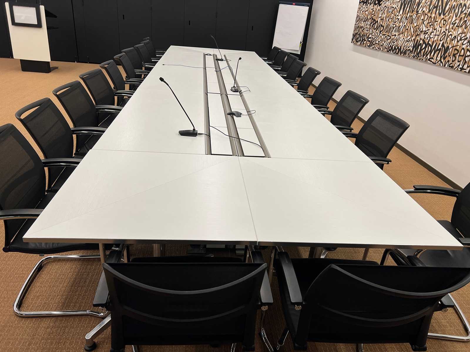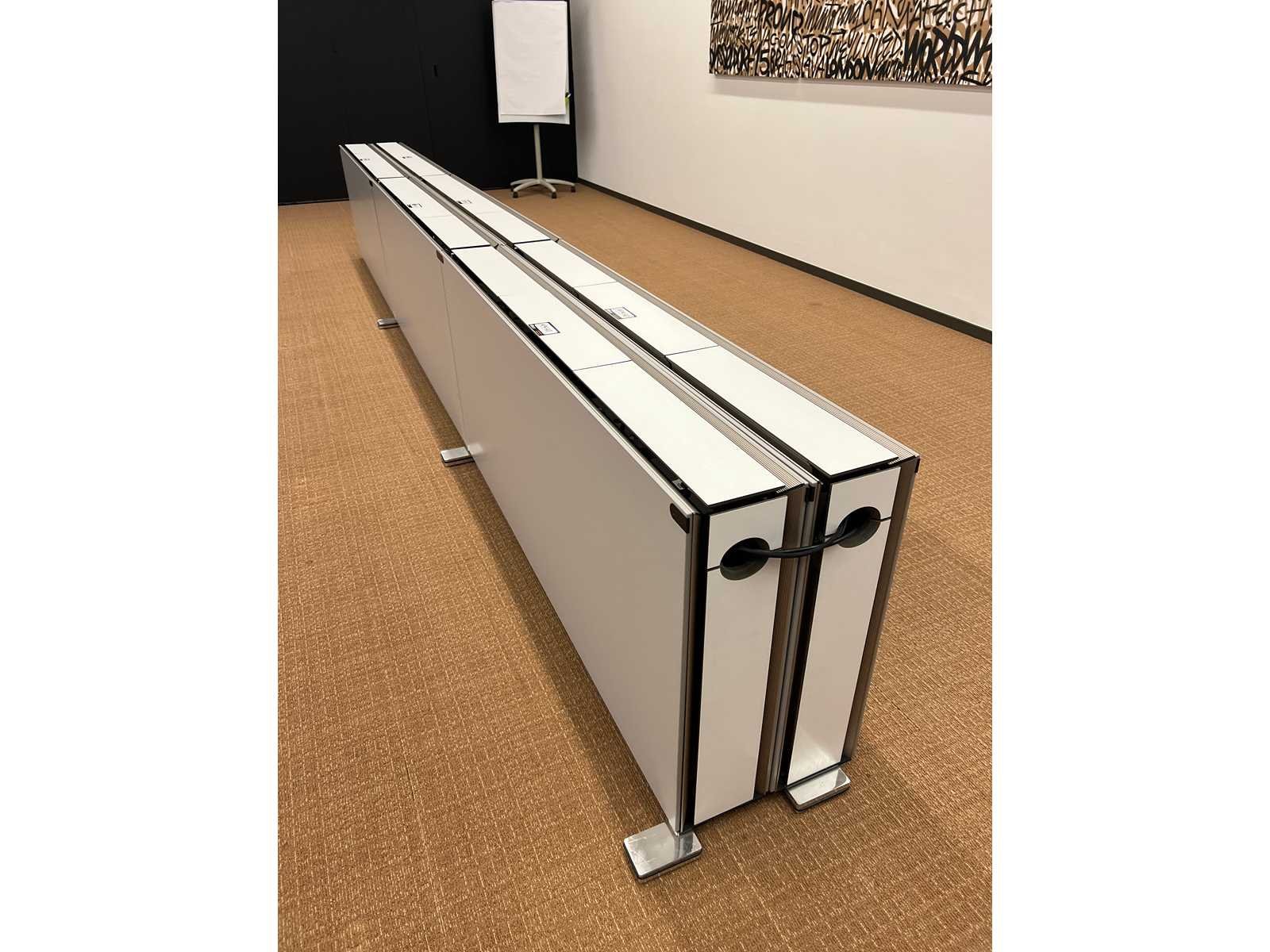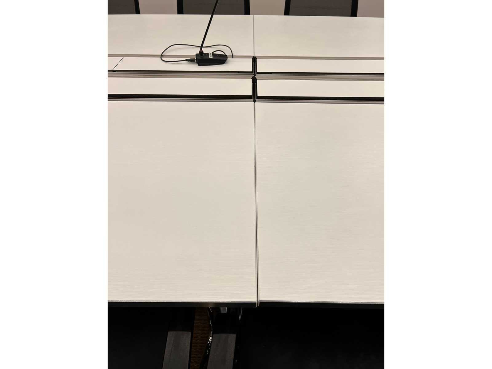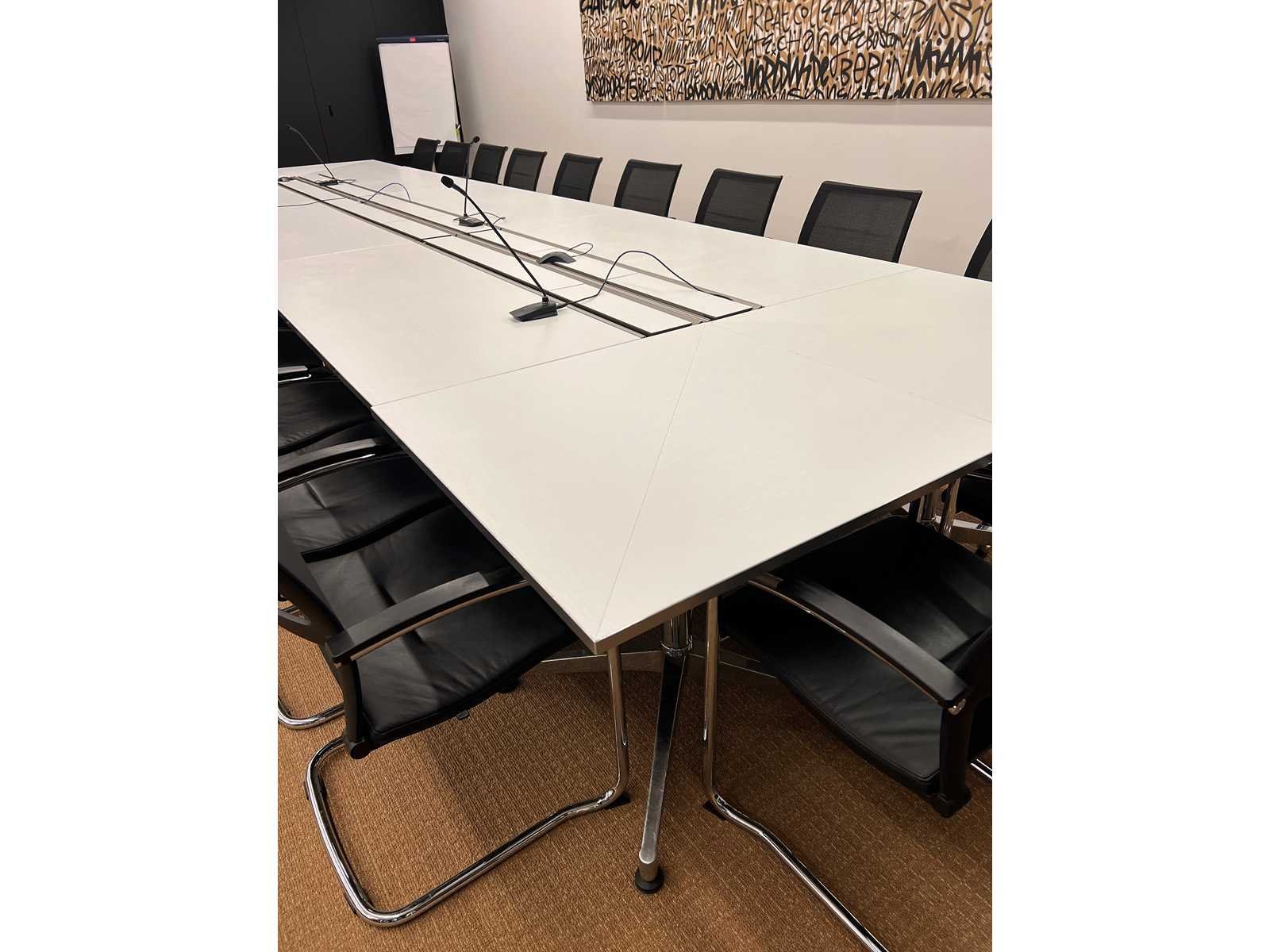 Modulaire vergadertafel, uitgevoerd in wit generfd MDF met aluminium rand en onderstel. De tafel is verrijdbaar en opklapbaar, wat flexibiliteit biedt bij het inrichten van vergaderruimtes. Voorzien van geïntegreerd speakersysteem en elektro-/internetaansluitingen. (L565 x B170 x H74 cm) Gebruikssporen mogelijk Nee Type: Modulaire Vergadertafel Kleur: Wit Gewicht: 150kg Lengte: 565cm Breedte: 170cm Hoogte: 74cm
