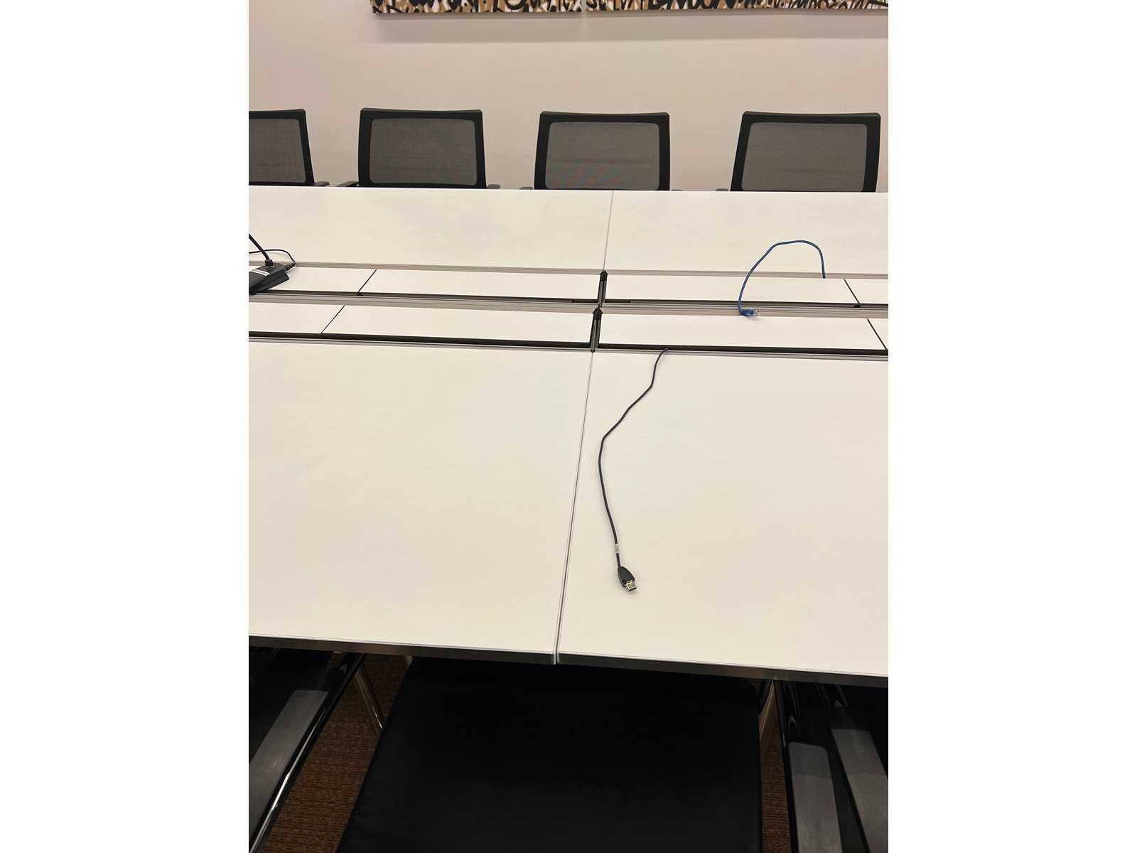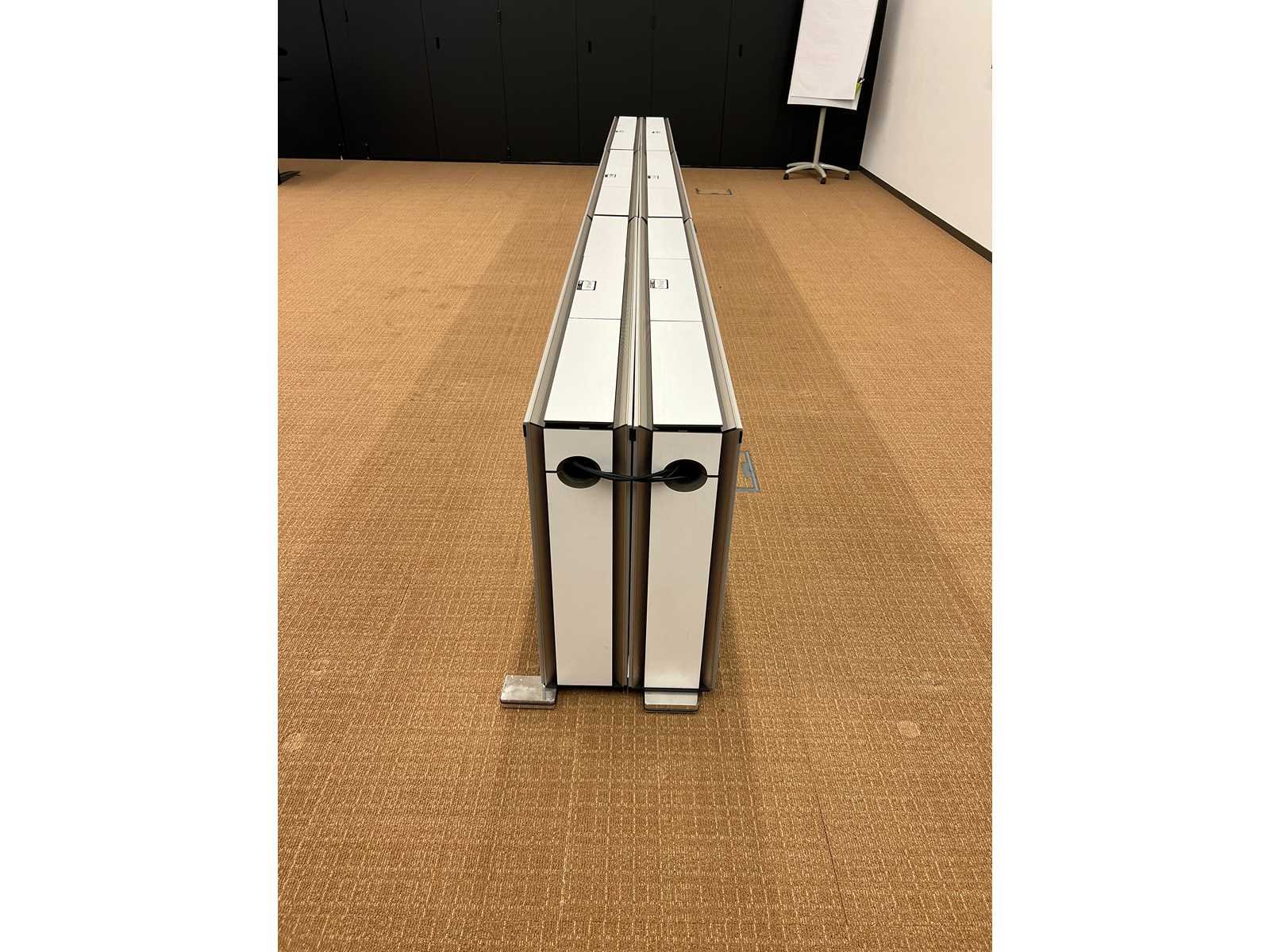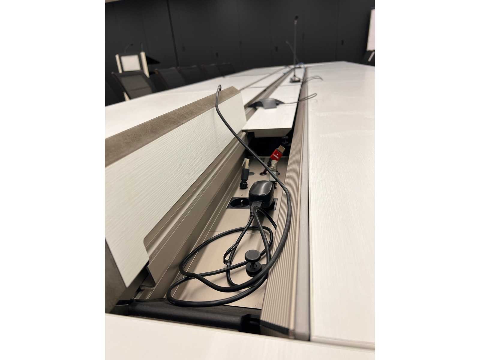 Modulaire vergadertafel, uitgevoerd in wit generfd MDF met aluminium rand en onderstel. De tafel is verrijdbaar en opklapbaar, wat flexibiliteit biedt bij het inrichten van vergaderruimtes. Voorzien van geïntegreerd speakersysteem en elektro-/internetaansluitingen. (L565 x B170 x H74 cm) Gebruikssporen mogelijk Nee Type: Modulaire Vergadertafel Kleur: Wit Gewicht: 150kg Lengte: 565cm Breedte: 170cm Hoogte: 74cm