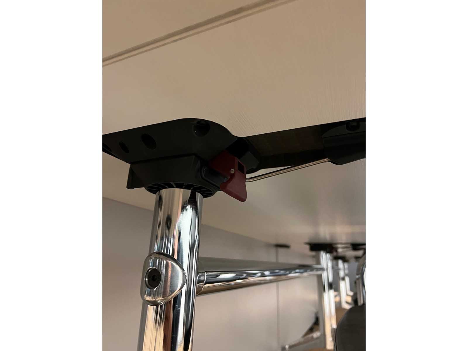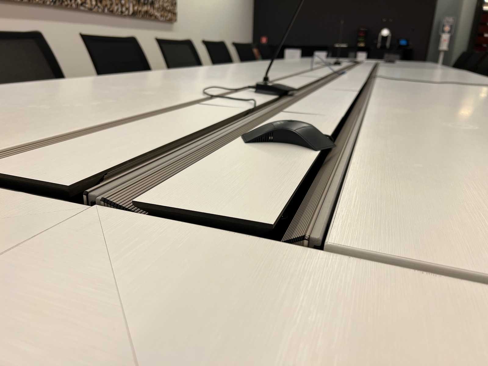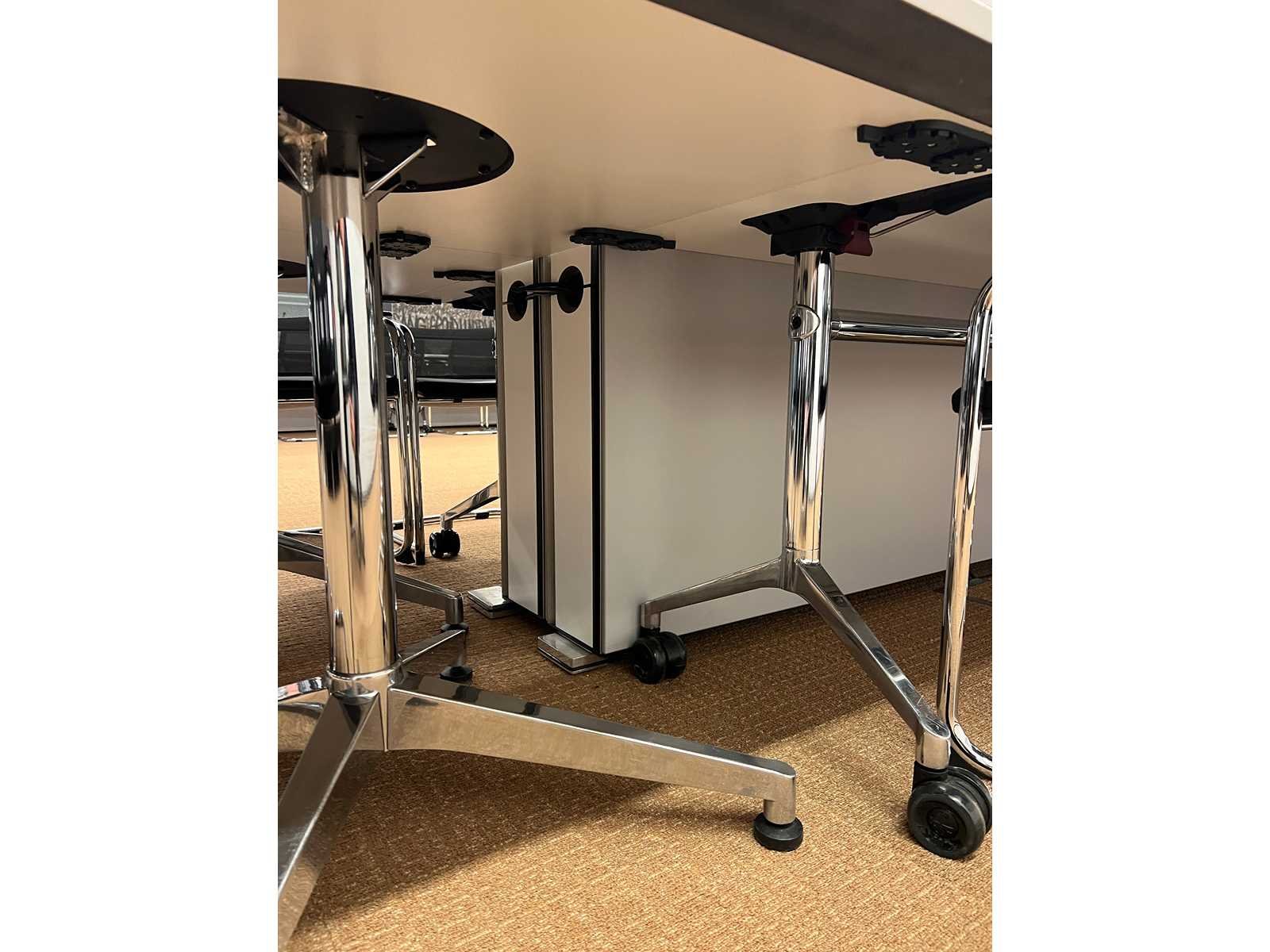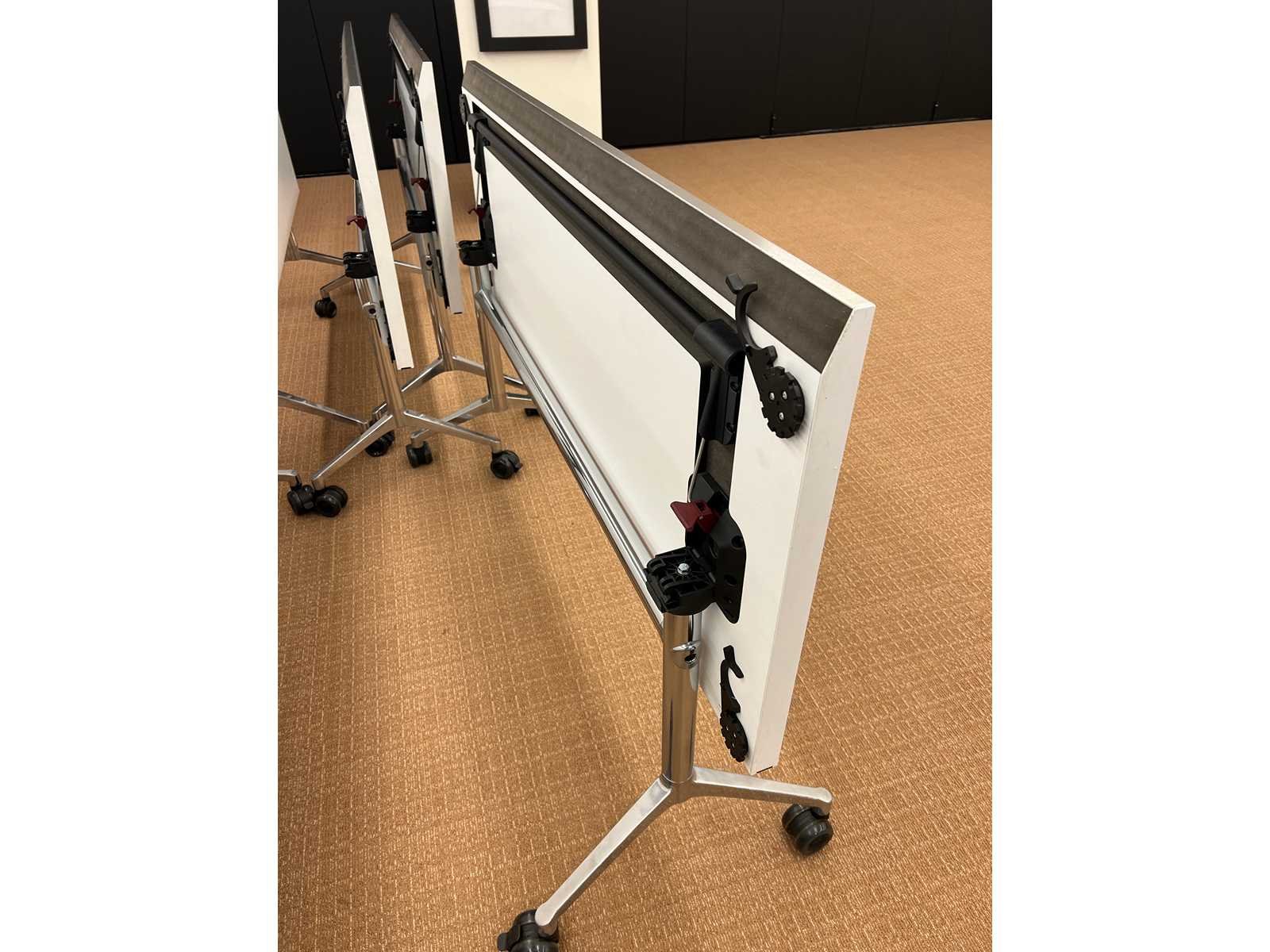 Modulaire vergadertafel, uitgevoerd in wit generfd MDF met aluminium rand en onderstel. De tafel is verrijdbaar en opklapbaar, wat flexibiliteit biedt bij het inrichten van vergaderruimtes. Voorzien van geïntegreerd speakersysteem en elektro-/internetaansluitingen. (L565 x B170 x H74 cm) Gebruikssporen mogelijk Nee Type: Modulaire Vergadertafel Kleur: Wit Gewicht: 150kg Lengte: 565cm Breedte: 170cm Hoogte: 74cm