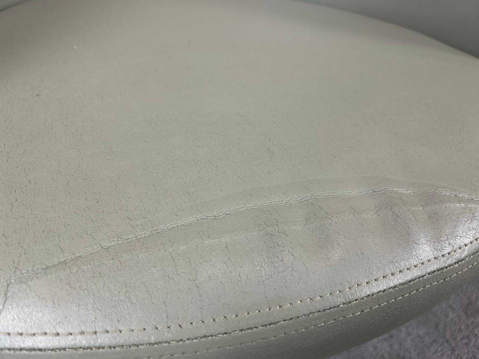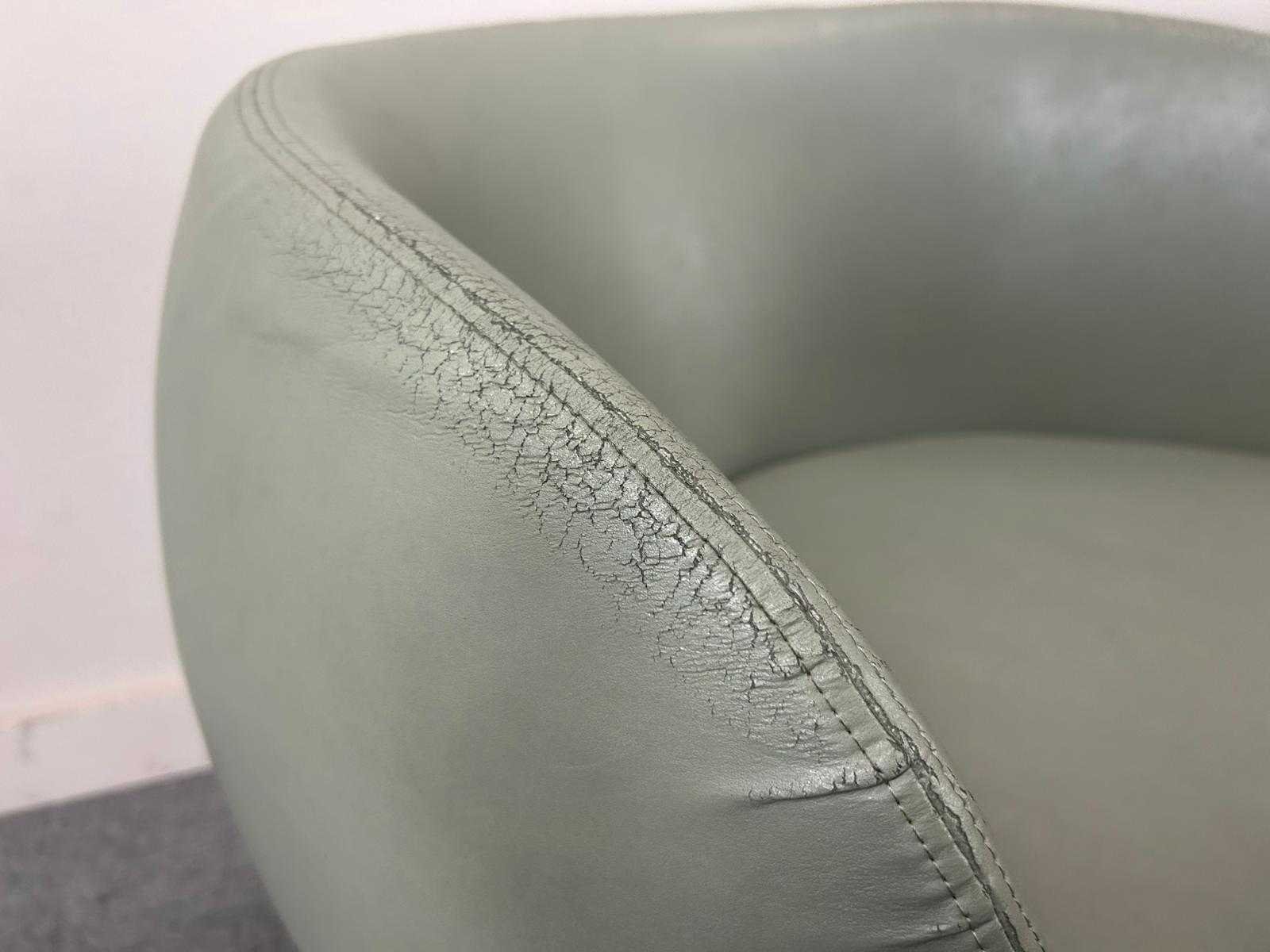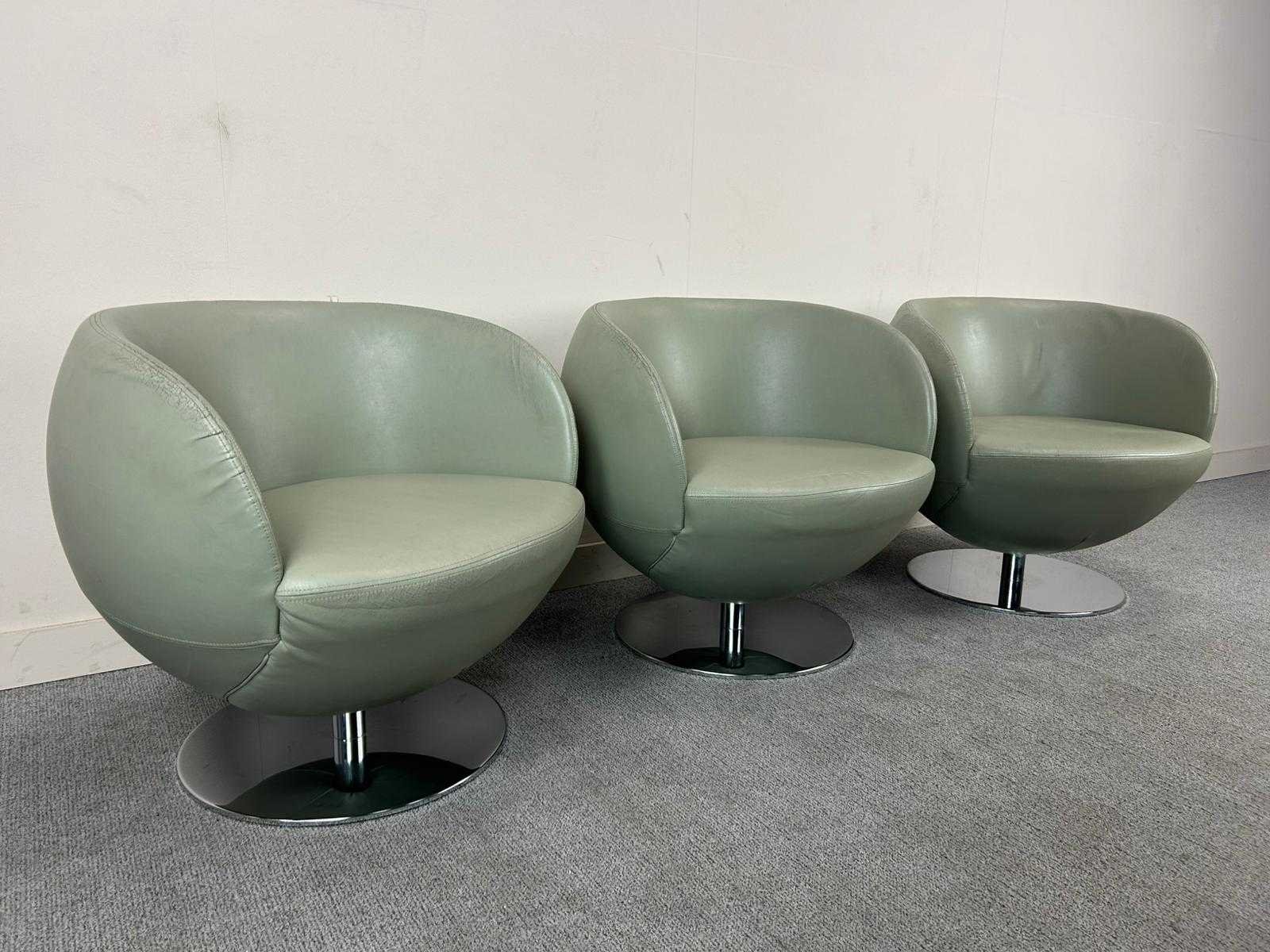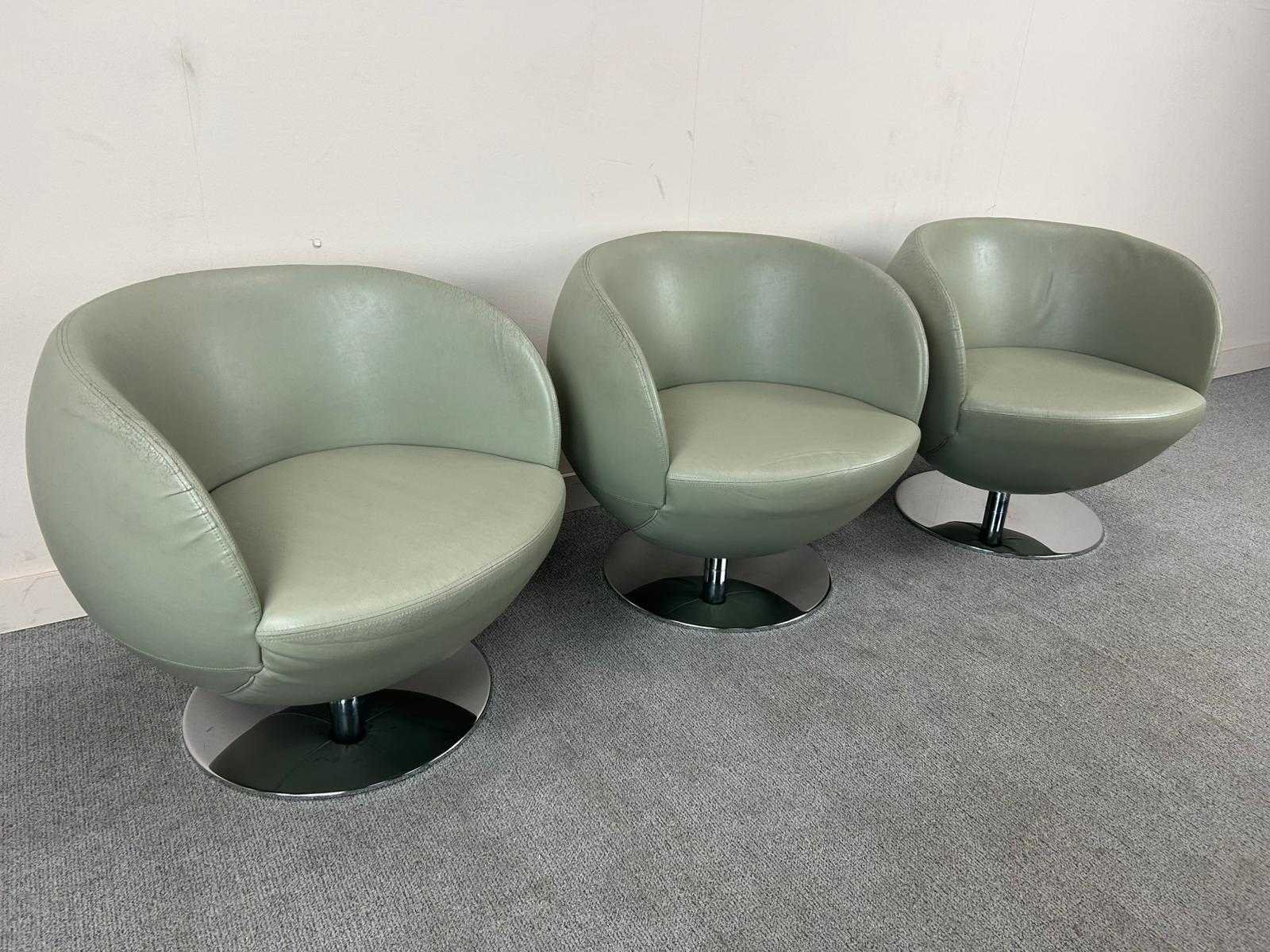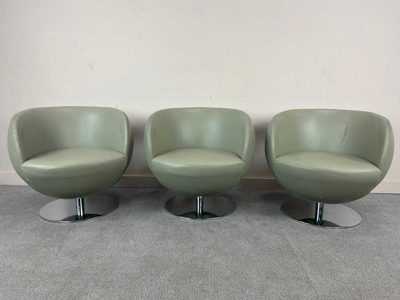 Trio van 3 ontvangststoelen in olijfgroen kunstleer, geplaatst op een centrale metalen poot. De stoelen vertonen gebruikssporen en lichte stofverzadiging. No Type: Ontvangststoel Kleur: Olijf groen Gewicht: 45kg Materiaal: Kunstleer