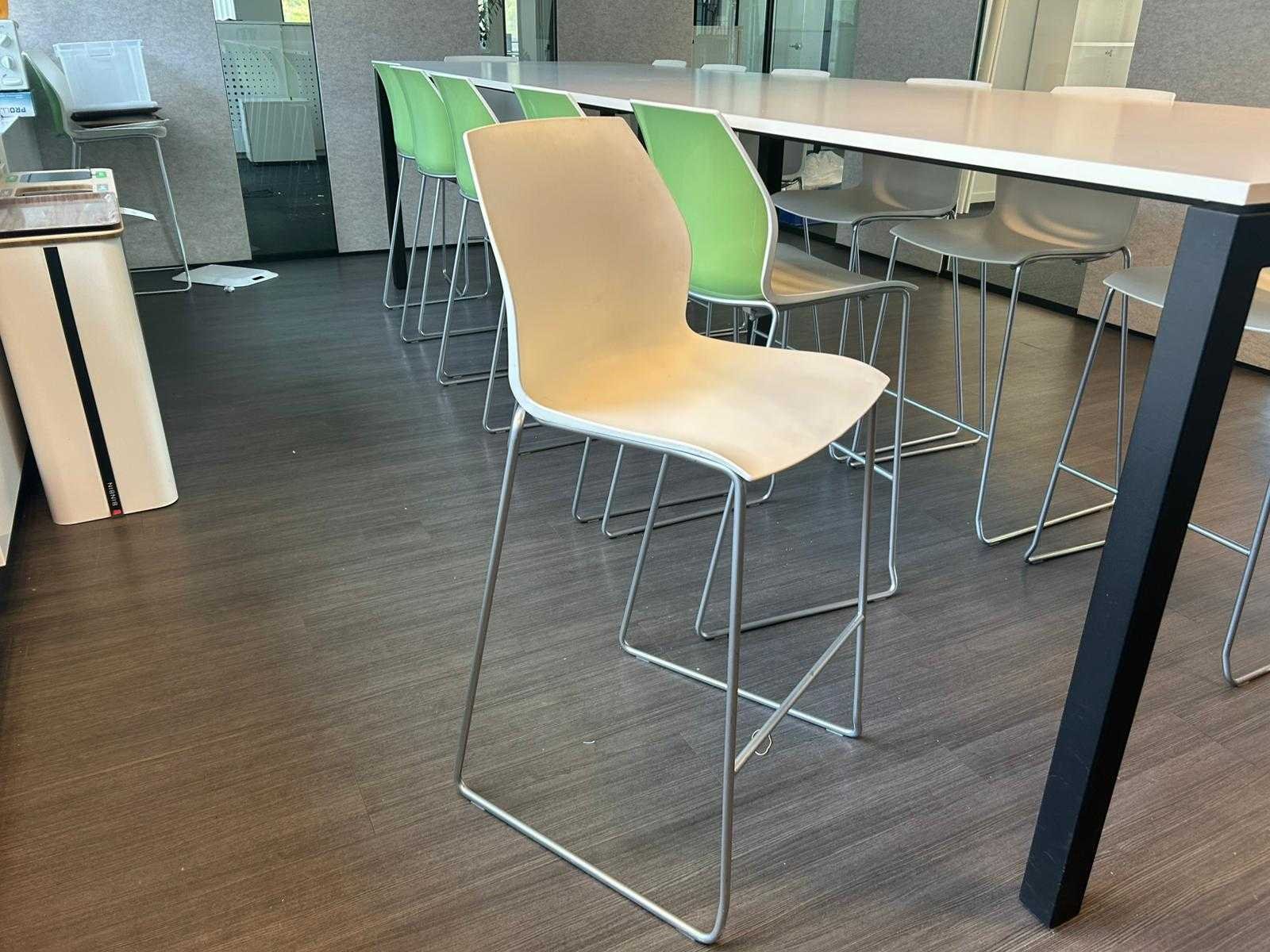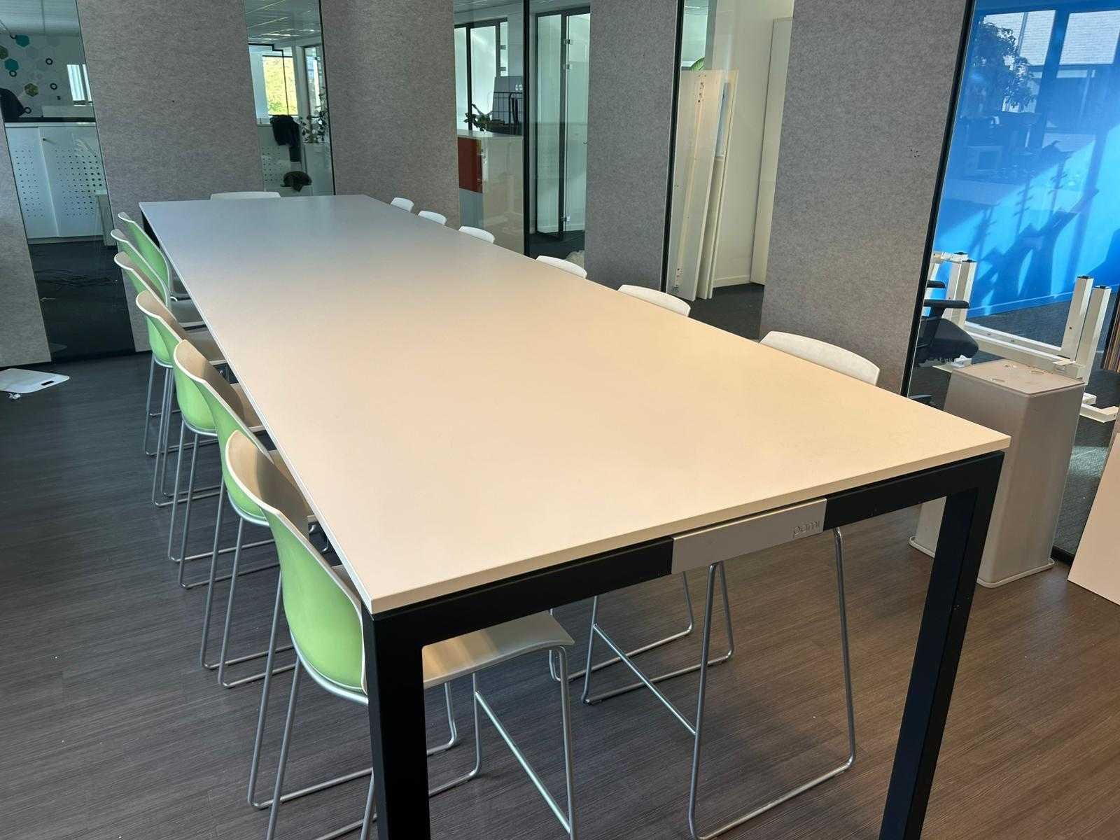 Vergaderset bestaande uit 1 Pami vergadertafel met witte melamine top en vierpootonderstel, gecombineerd met 13 sledepootstoelen in wit/groen kunststof. De set verkeert in goede staat en is geschikt voor gebruik in vergaderruimtes. Afmetingen tafel: 420 × 120 × 105 cm Nee Merk: PAMI Type: Hoge Vergaderset incl krukken Kleur: Wit / Groen Gewicht: 150kg Lengte: 420cm Breedte: 120cm Hoogte: 105cm Materiaal: Melamine