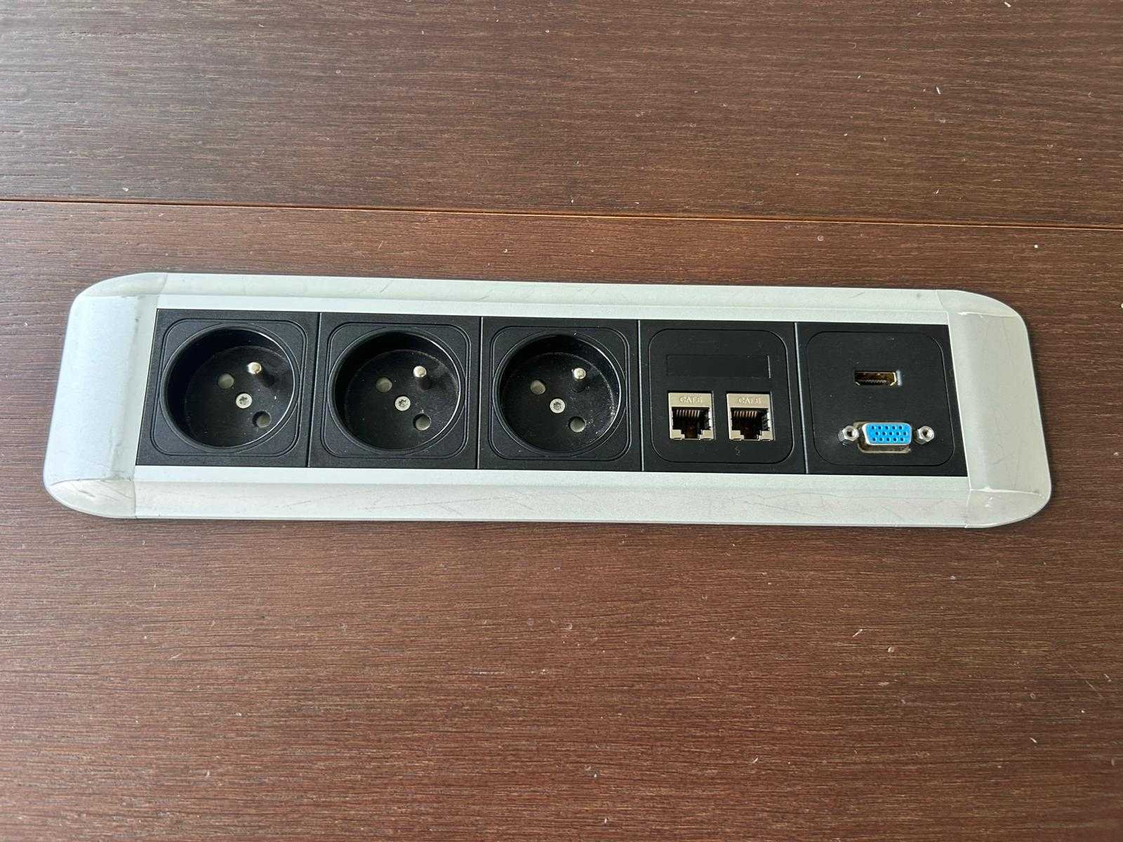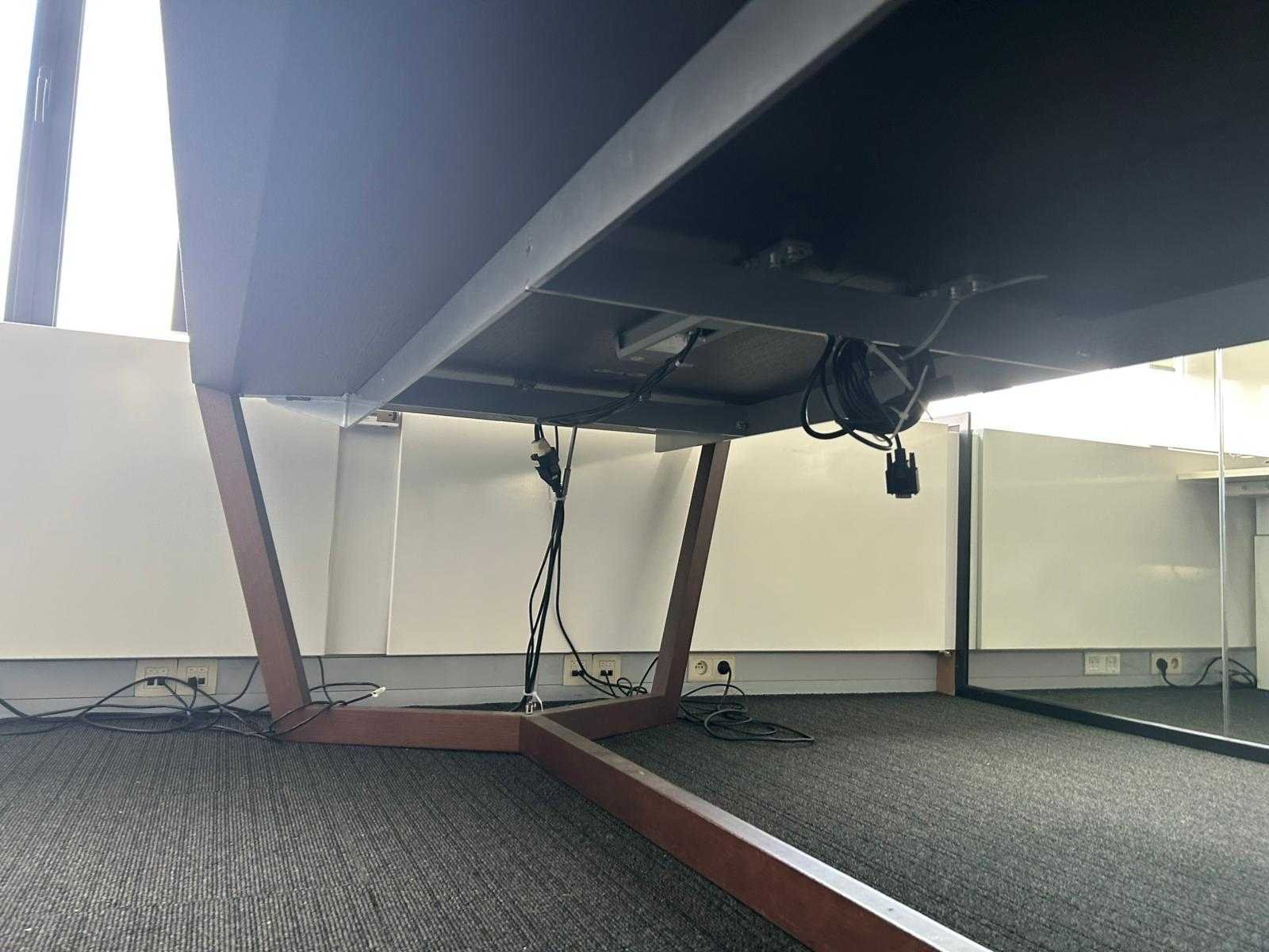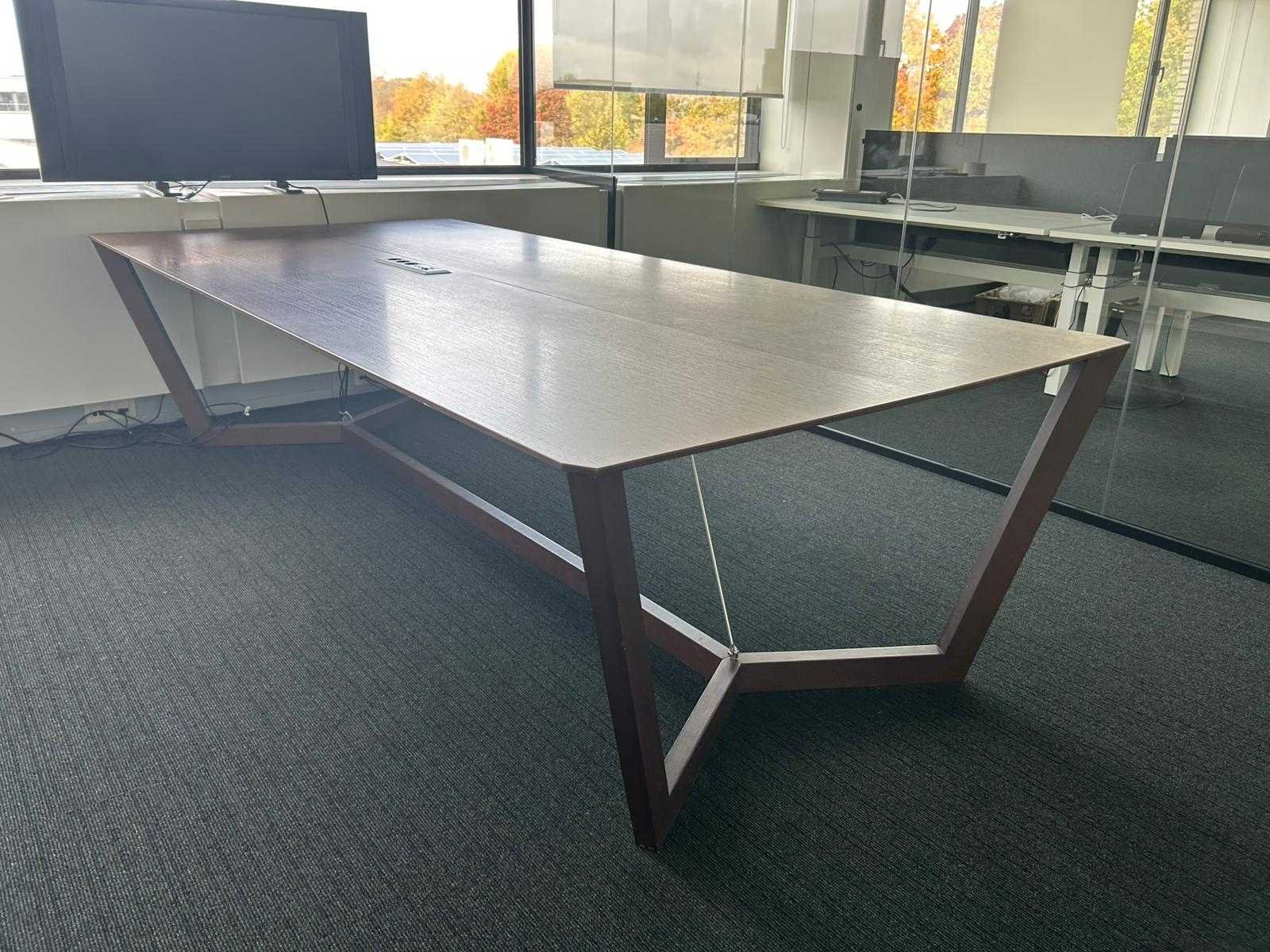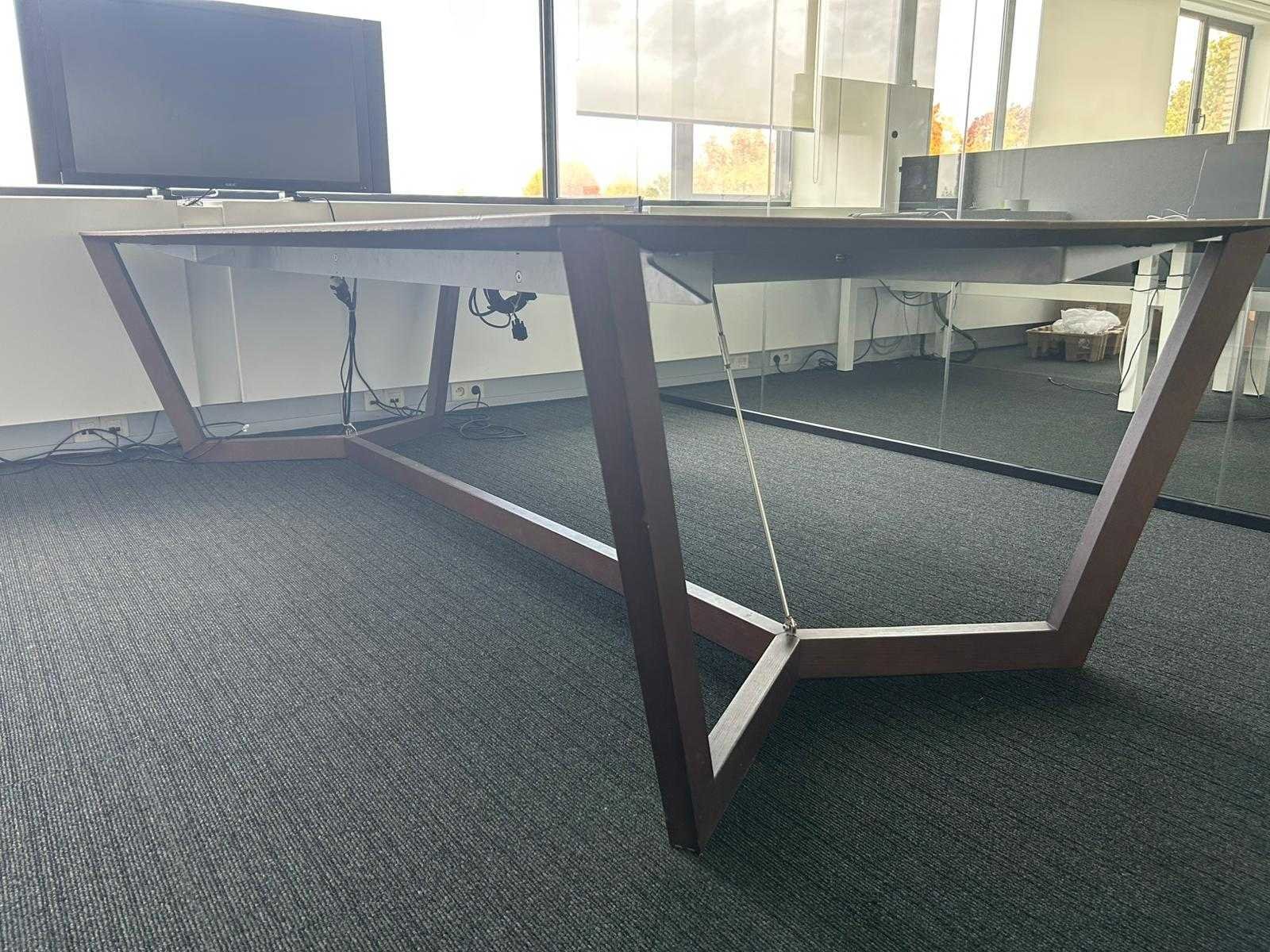 Vergadertafel volledig uitgevoerd in hout, voorzien van een dubbele U-poot in ruggengraatstijl. Het tafelblad vertoont zichtbare schade en krassen door gebruik, maar is structureel stabiel. No Type: Vergadertafel Kleur: Bruin Gewicht: 80kg Lengte: 230cm Breedte: 130cm Hoogte: 73cm Materiaal: Hout