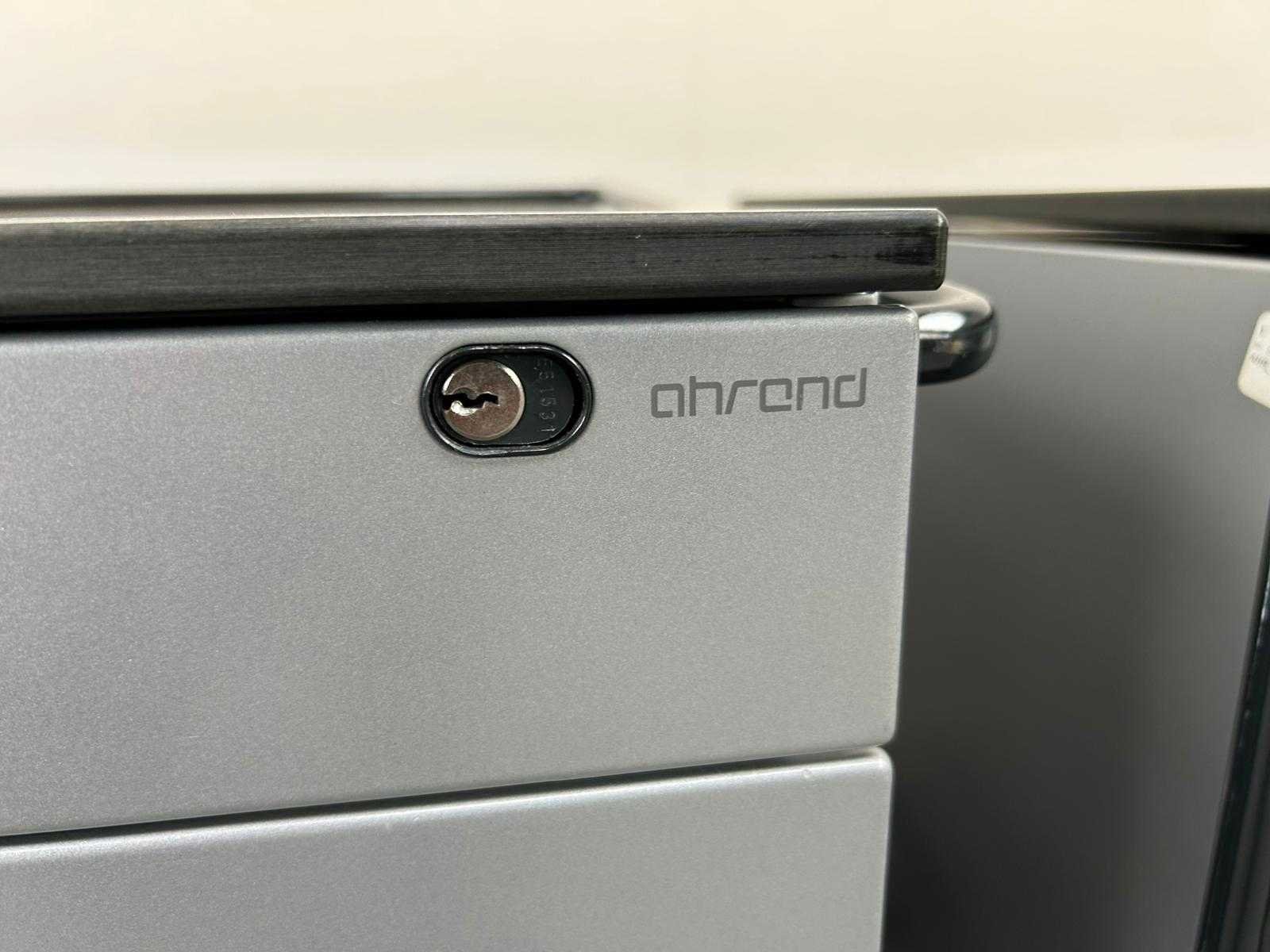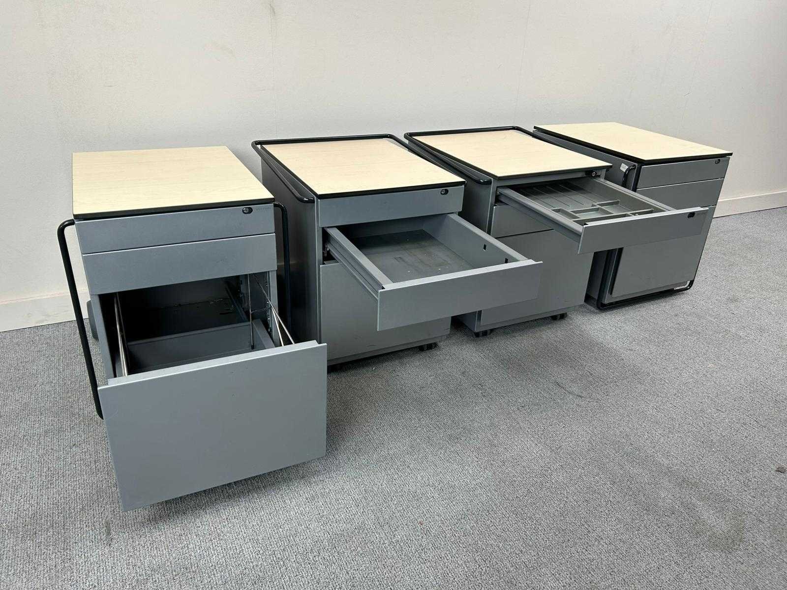 Set van 4 Ahrend ladeblokken in het grijs met melamine toppen. Met gebruikssporen, staat kan variëren per item. Nee Merk: AHREND Gewicht: 150kg Materiaal: Metaal Aantal laden: 2