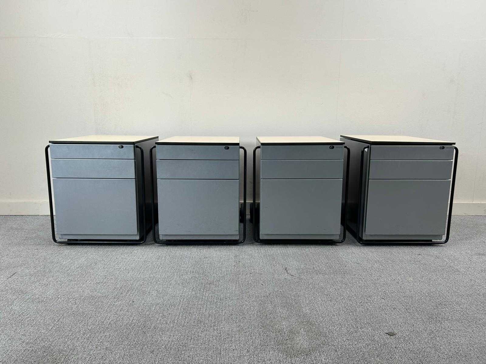 Set van 4 Ahrend ladeblokken in het grijs met melamine toppen. Met gebruikssporen, staat kan variëren per item. Nee Merk: AHREND Kleur: grijs Gewicht: 150kg Materiaal: Metaal Aantal laden: 2