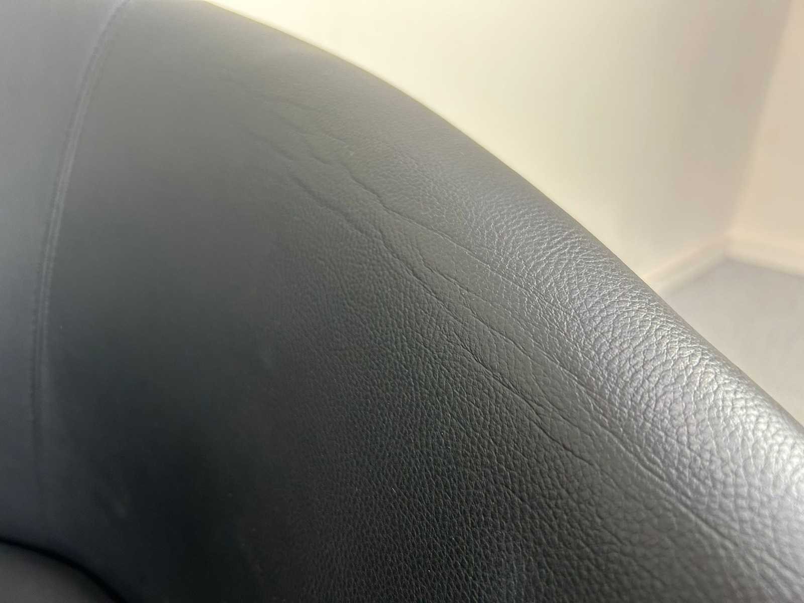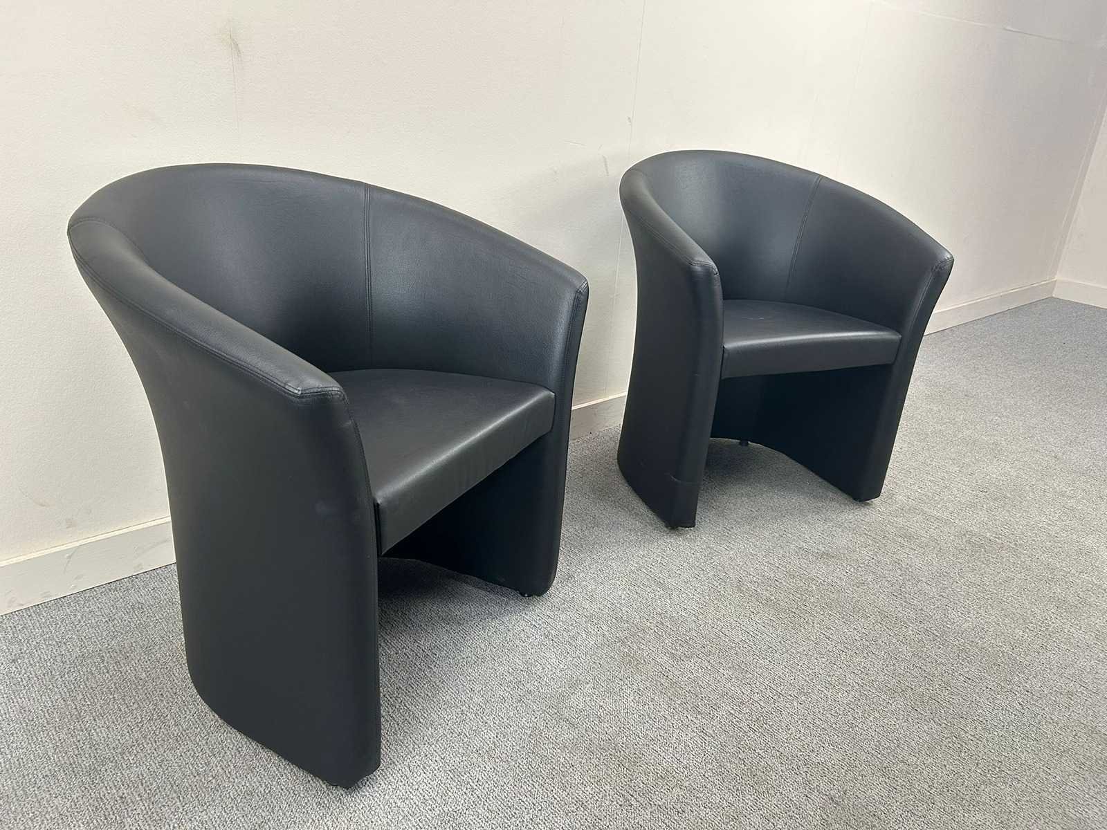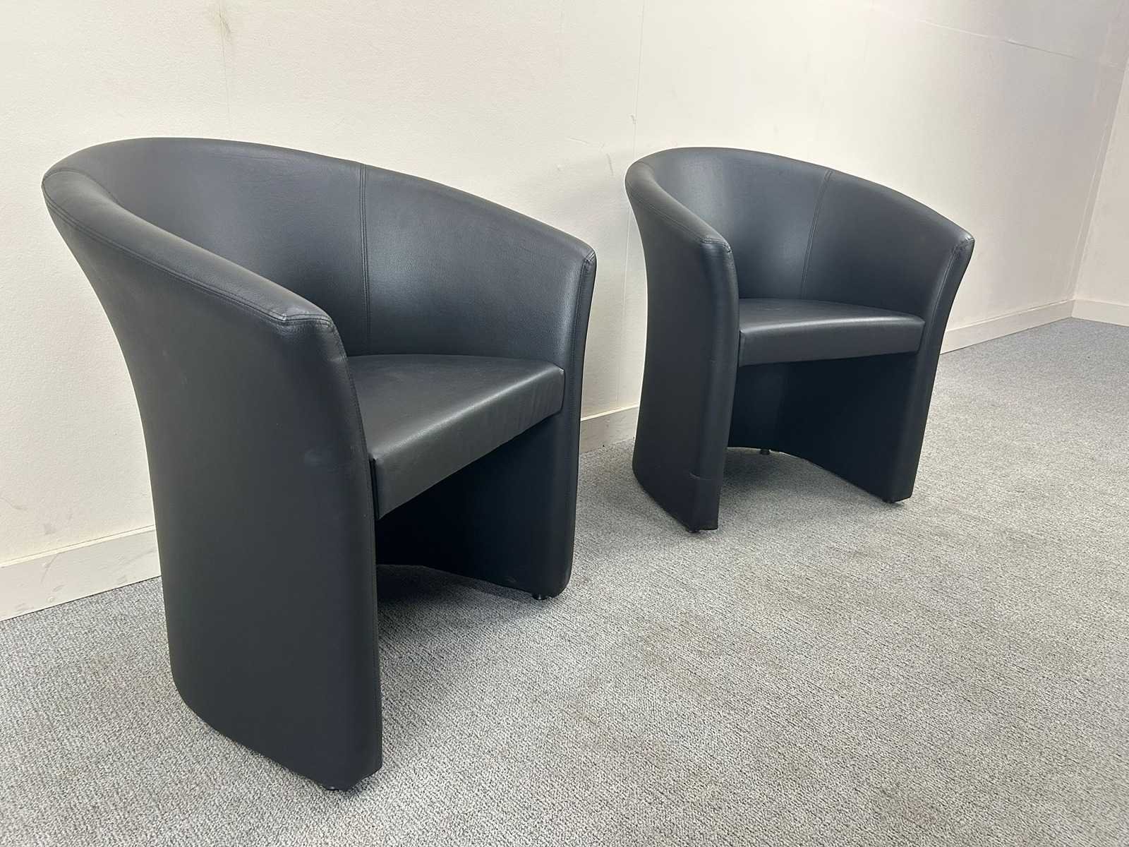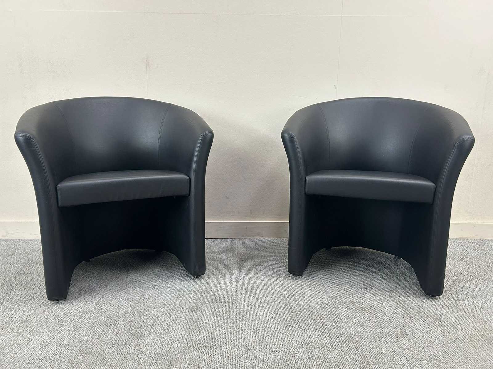 Duo van 2 ontvangststoelen in donker kunstleer, met gebruikssporen en lichte stofverzadiging. Nee Type: ontvangststoel Kleur: Zwart Gewicht: 30kg Materiaal: Kunstleer