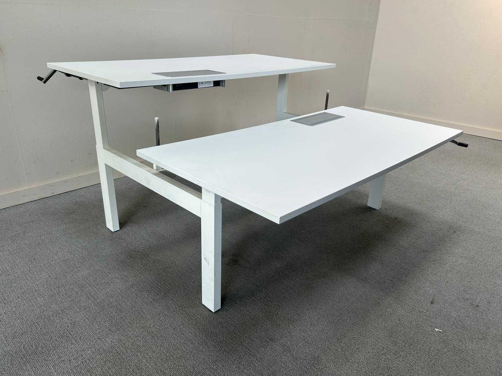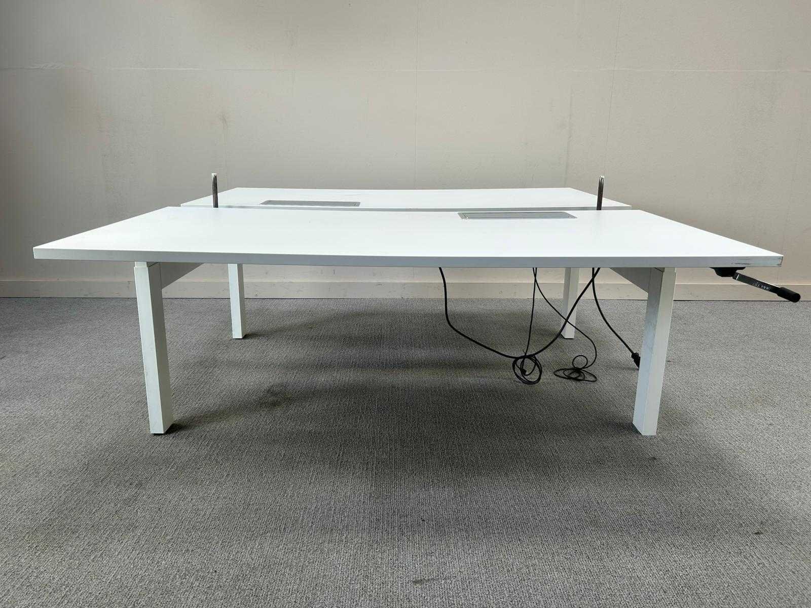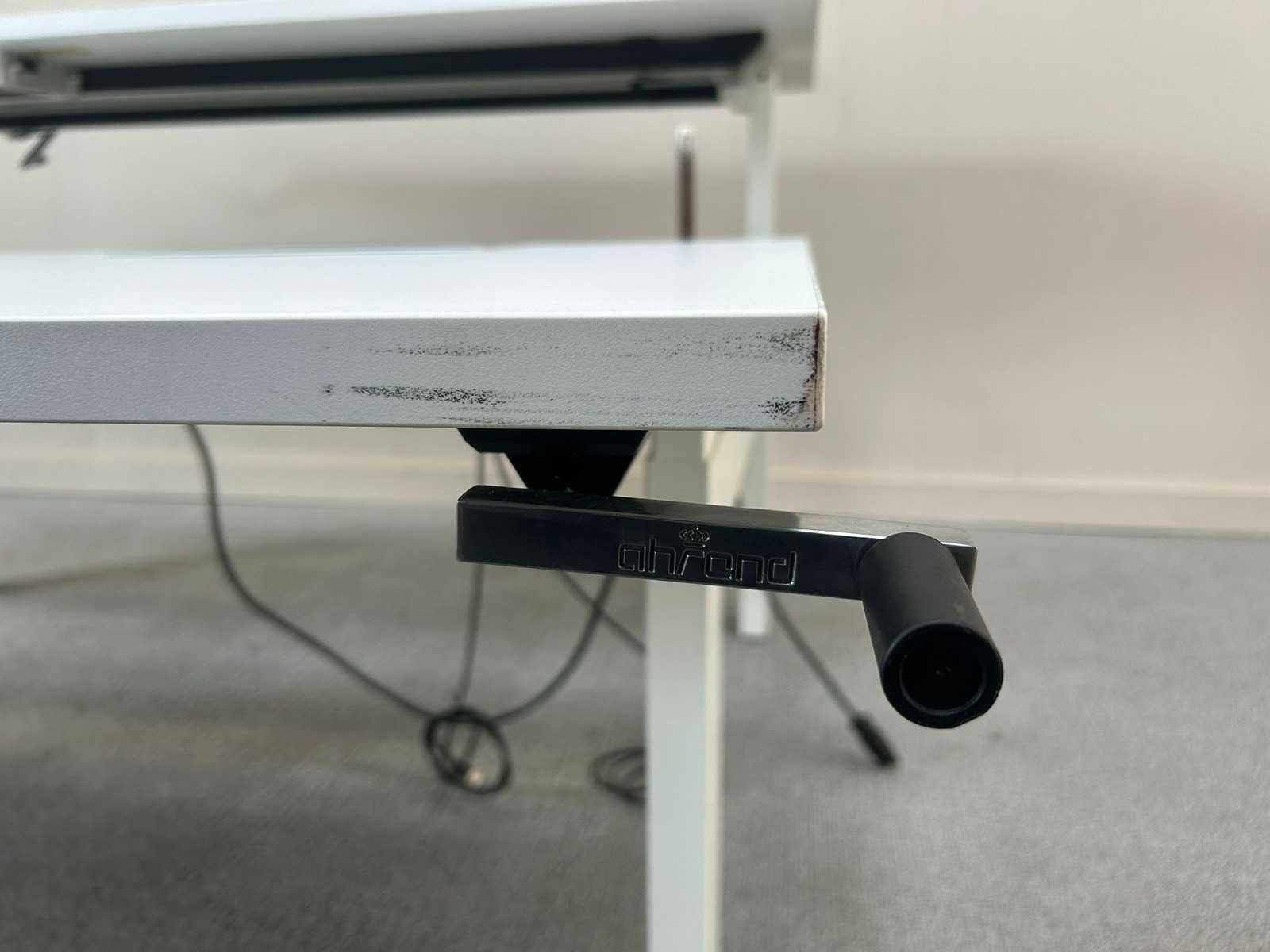Ahrend dubbele workbench met handslinger in wit melamine met wit metaal onderstel. Nee Merk: AHREND Type: Dubbele workbench Slingerbureau: true Kleur: Wit Breedte: 160cm Hoogte: 61-90cm Materiaal: Melamine Diepte: 170cm