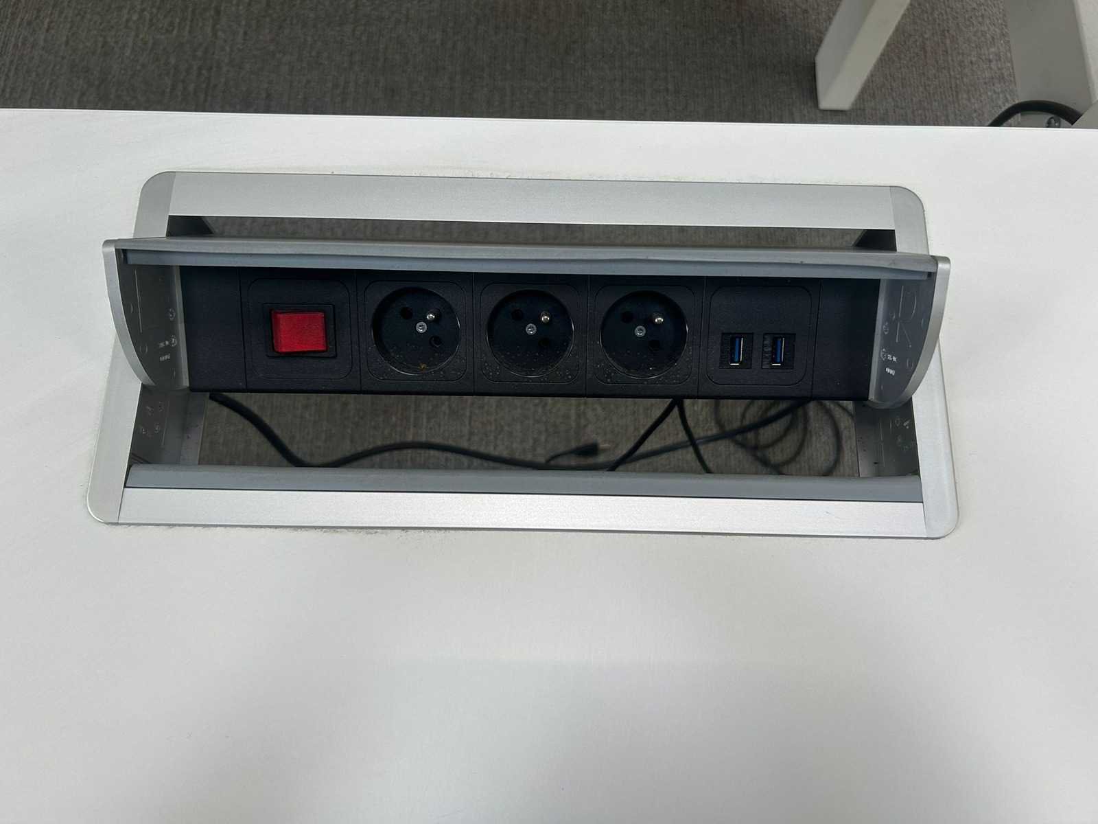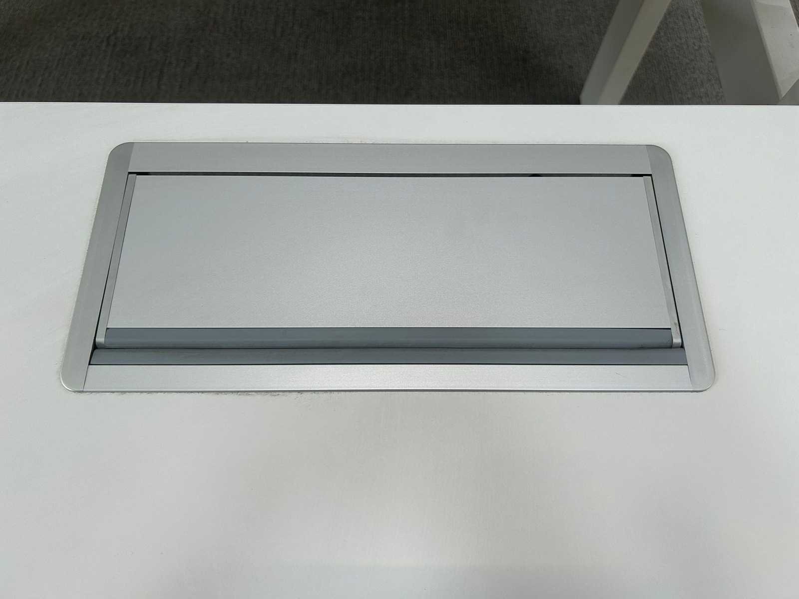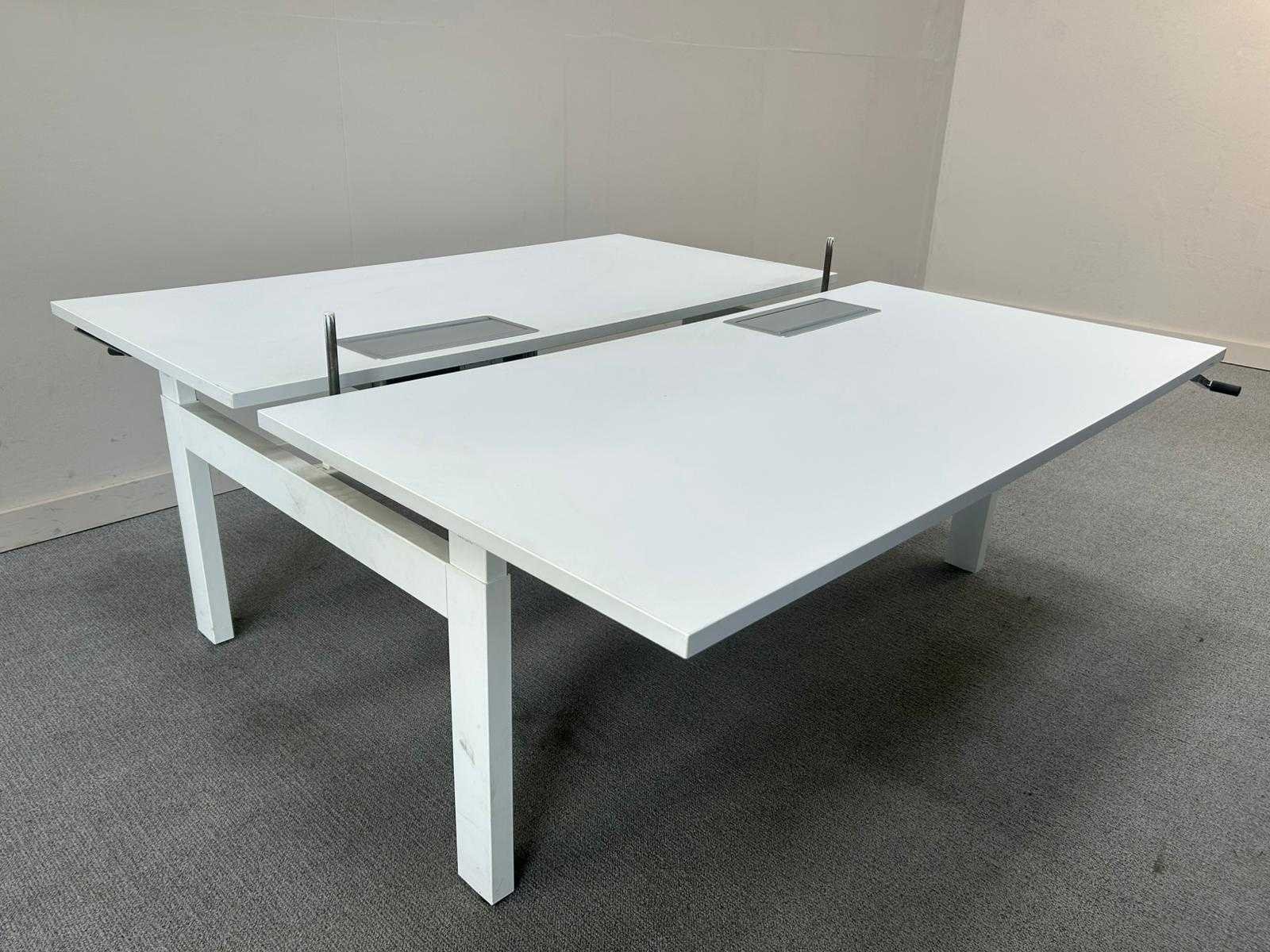 Ahrend dubbele workbench met handslinger in wit melamine met wit metaal onderstel. Nee Merk: AHREND Type: Dubbele workbench Slingerbureau: true Kleur: Wit Breedte: 160cm Hoogte: 61-90cm Materiaal: Melamine Diepte: 170cm