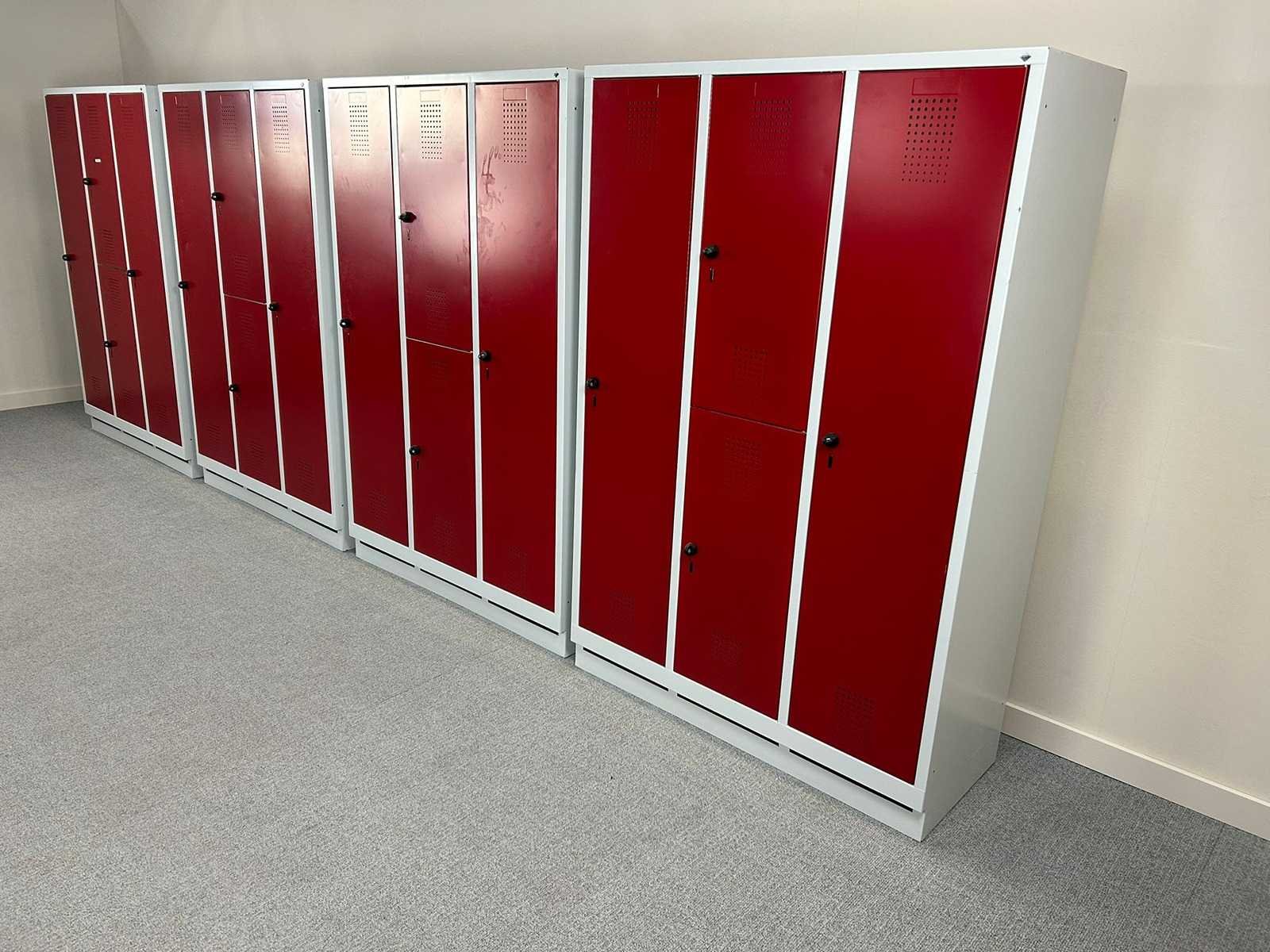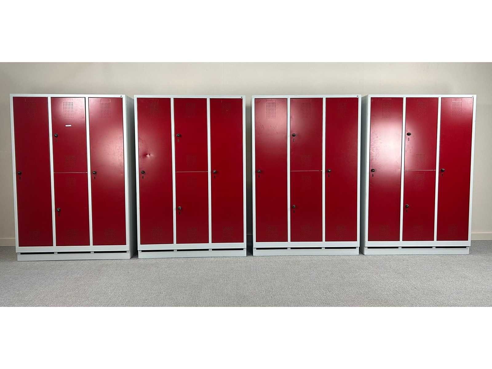 Een set van 4 opberglockers van het merk CP. Deuren in het rood met lichtgrijze frame. 3 hoofdopbergruimtes ingedeeld per unit. Nee Merk: CP Kleur: rood/grijs Gewicht: 20kg Breedte: 120cm Hoogte: 181cm Materiaal: metaal Diepte: 50cm