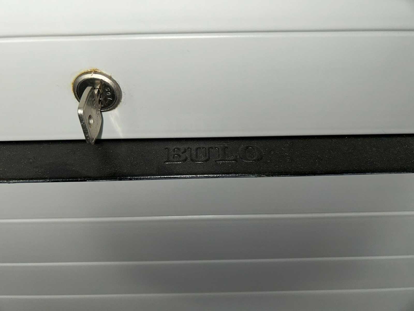 Horizontale roldeurkast met 3 leggers per kast , merk BULO, met gebruiksporen, sleutels zijn niet gegarandeerd Nee Merk: BULO Type: Horizontale roldeurkast Kleur: grijs Gewicht: 50kg Breedte: 120cm Hoogte: 160cm Materiaal: metaal/kunststof Diepte: 45cm