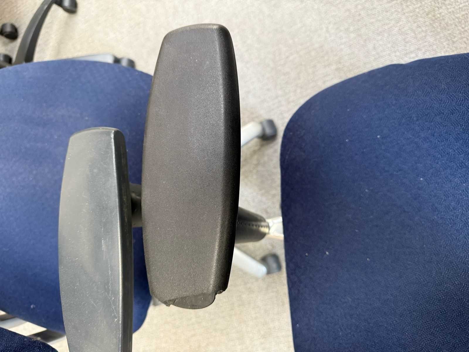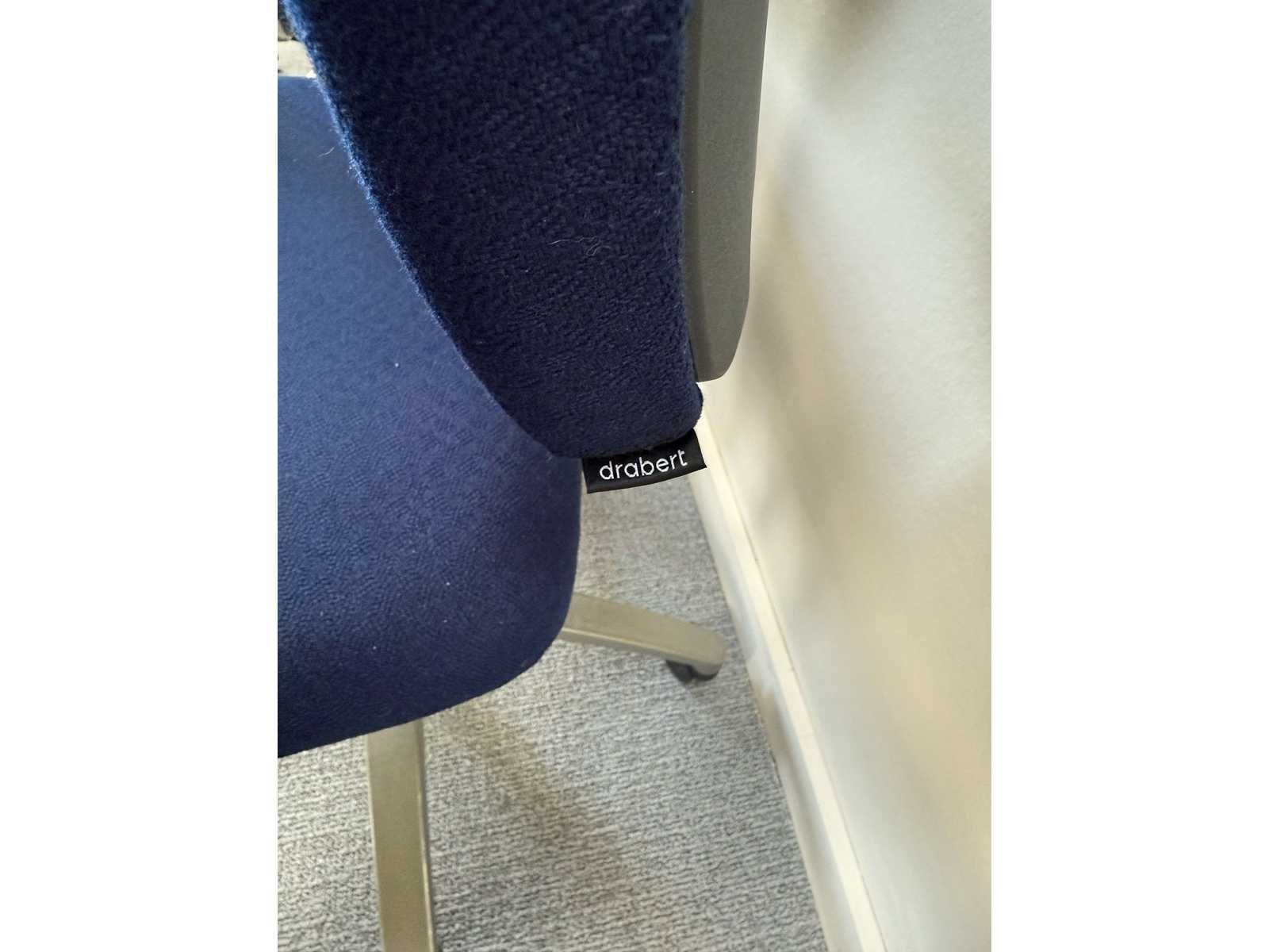 Een set van 8 verstelbare bureaustoelen van Drabert in het blauw. 4 onderstellen in metaal, de andere helft in kunststof. sommige armpadjes zijn beschadigd Nee Merk: DRABERT Type: Entrada Kleur: donker blauw Gewicht: 25kg