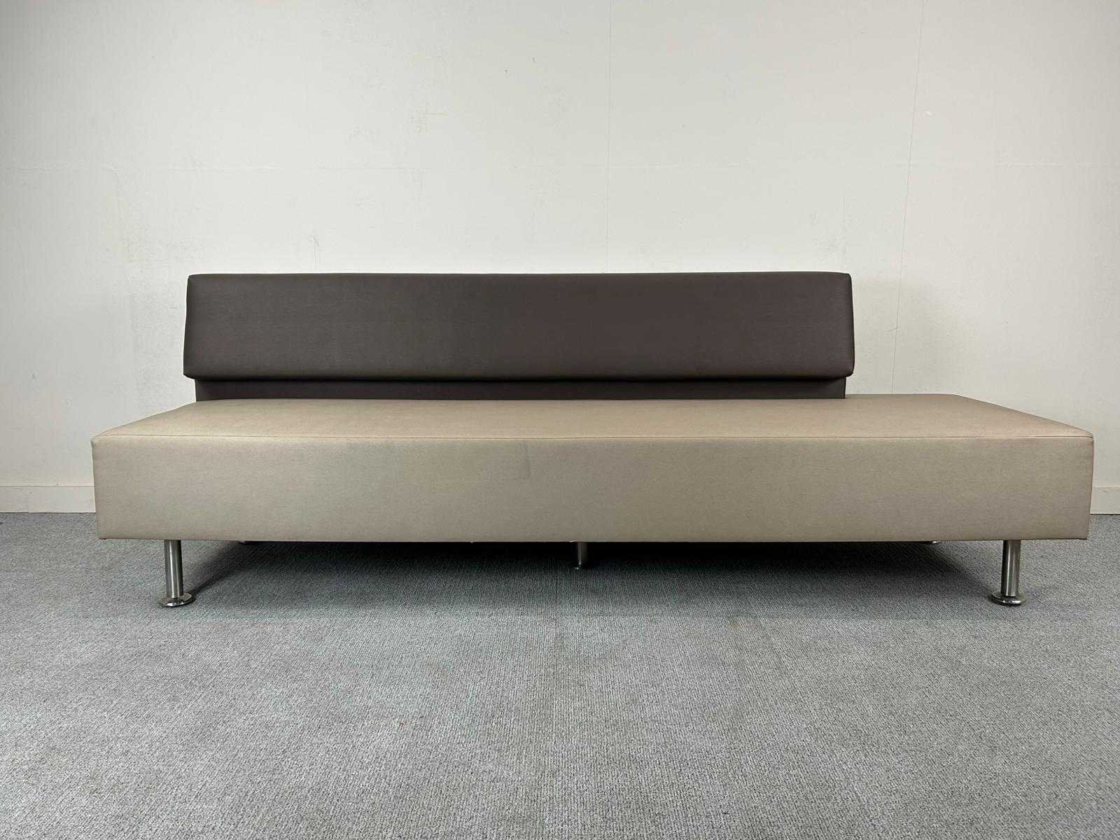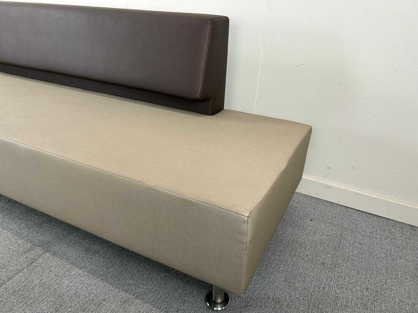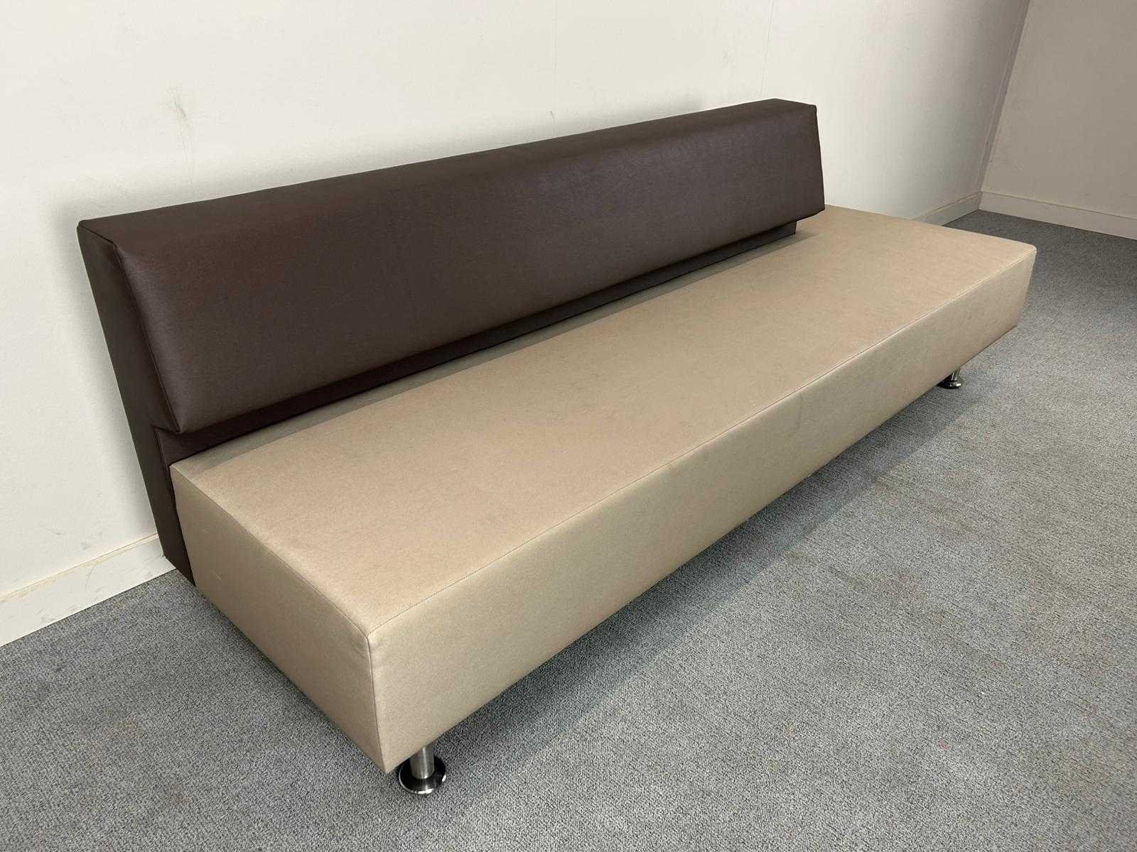 Strakke modulaire zitbank met rechte rugsteun, uitgevoerd in tweekleurig kunstleder. De zitting is lichtgrijs, de rugleuning donkerbruin. Rust op stevige ronde metalen poten met vlakke voetplaten. Geschikt voor ontvangstruimtes, wachtruimtes of horeca-inrichting. Comfortabel, onderhoudsvriendelijk en modern vormgegeven. Nee Product type: wachtbank met rugsteun Kleur: Lichtbruin/donkerbruin Gewicht: 50kg Breedte: 245cm Hoogte: 83cm Zithoogte: 46cm Diepte: 52cm Materiaal: kunstleer