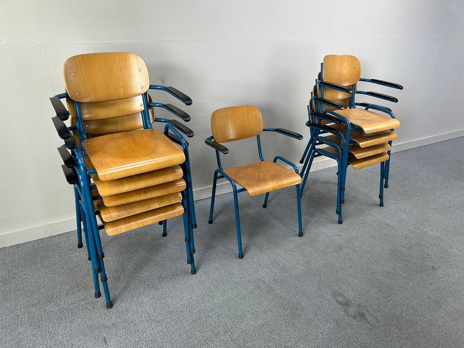 Een set van 10 stapelbare houten schoolstoelen, blauw metalen onderstellen. Met gebruikssporen, staat kan variëren per item. Nee Product type: Schoolstoel Stapelbaar: true Kleur: Hout / Blauw Gewicht: 100kg Materiaal: Hout