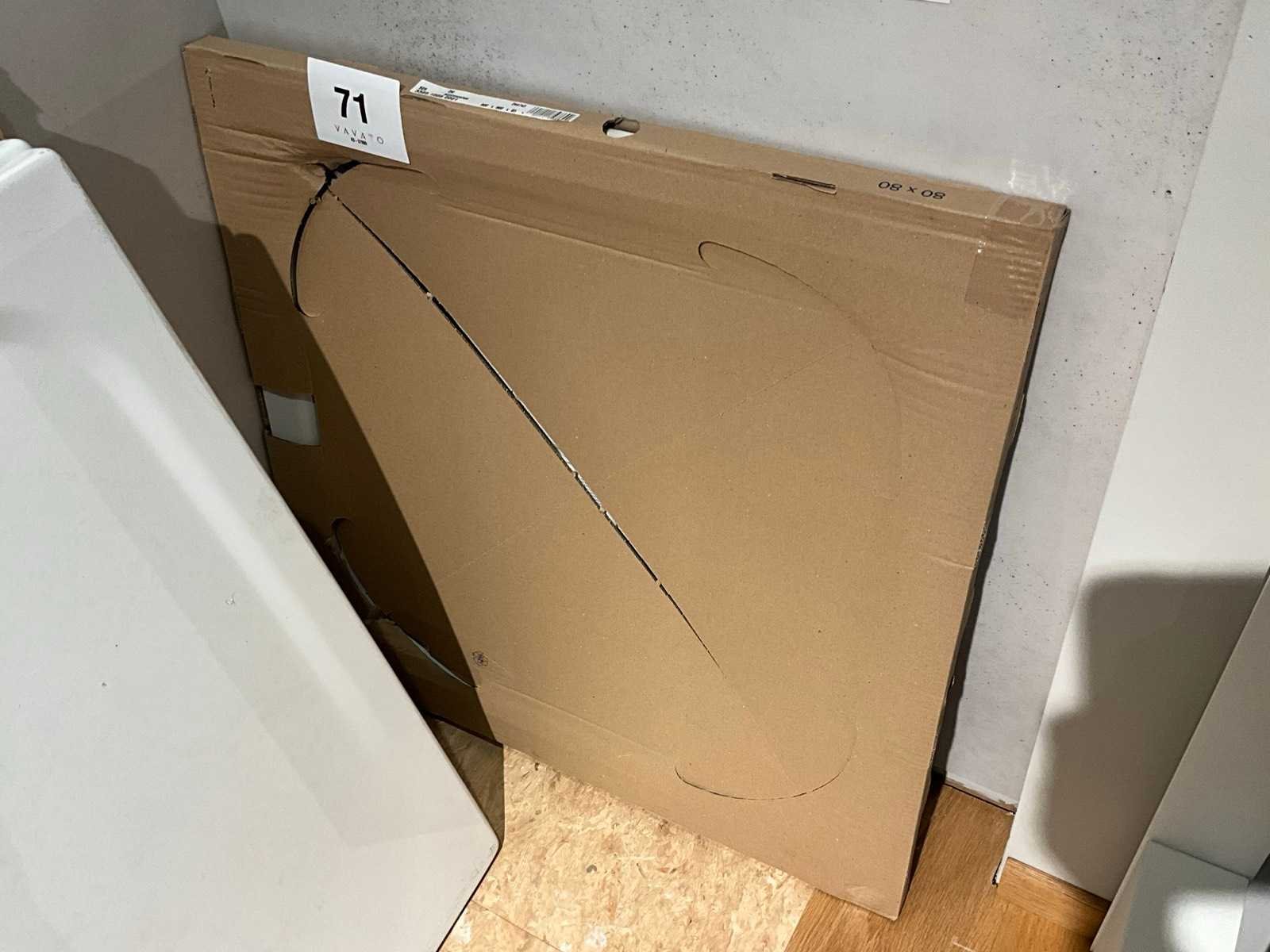 In gesloten originele verpakking Nee Merk: Kaldewei Model: Garda Kleur: Alpine wit Lengte: 80cm Breedte: 80cm Hoogte: 6.5cm Materiaal: Plaatstaal