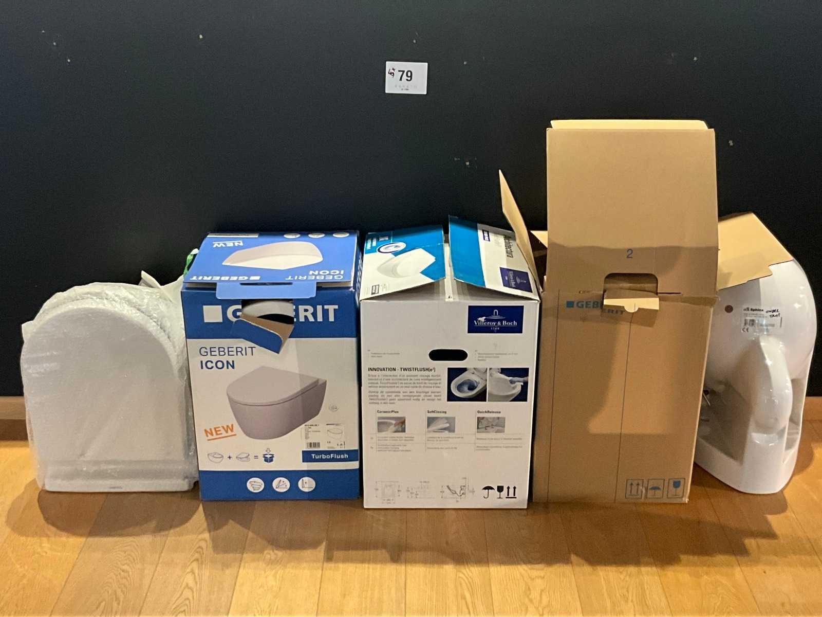 Waaronder 1x Villeroy & Boch, 2x Geberit, 1x Sphinx en 1x Duravit, Allen voorzien van zitting, Waaronder In originele verpakking Nee Product type: Hang Kleur: Wit