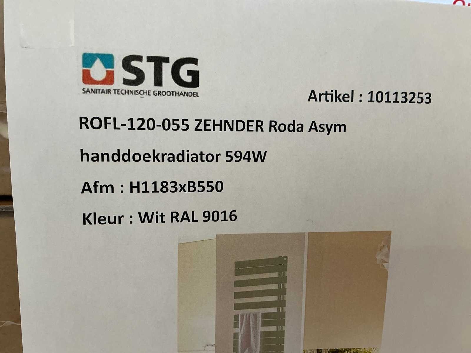 Kleur: Wit RAL 9016 Afgifte volgens aanwijzing. Foto’s ter referentie. Nee Merk: Zehnder Type: Roda Asym Vermogen: 594W Verticaal: true Totale afmeting Breedte: 55mm Totale afmeting Hoogte: 118mm