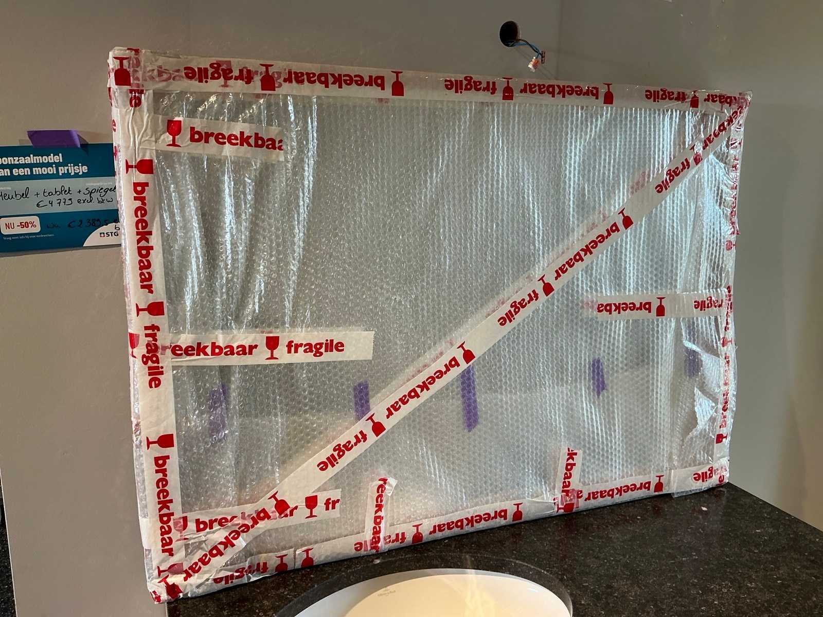 Wastafel voorzien van marmeren blad met afmetingen ca. 115 x 56cm. Onderkast Oakyu voorzien 1x kastdeur en 3x schuiflade met afmetingen ca. 115 x 55 x 92cm. Spiegel met afmetingen ca. 115 x 80cm. Nee