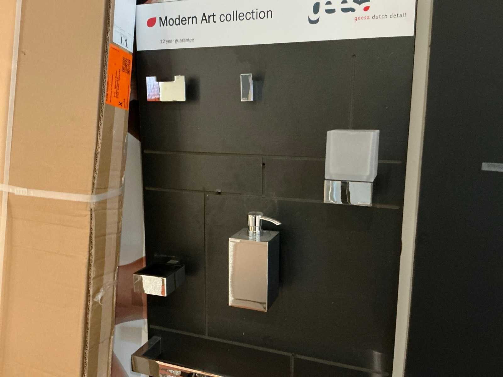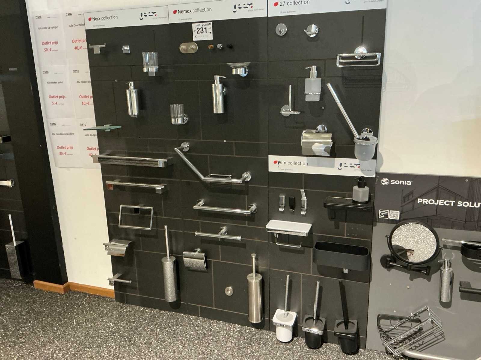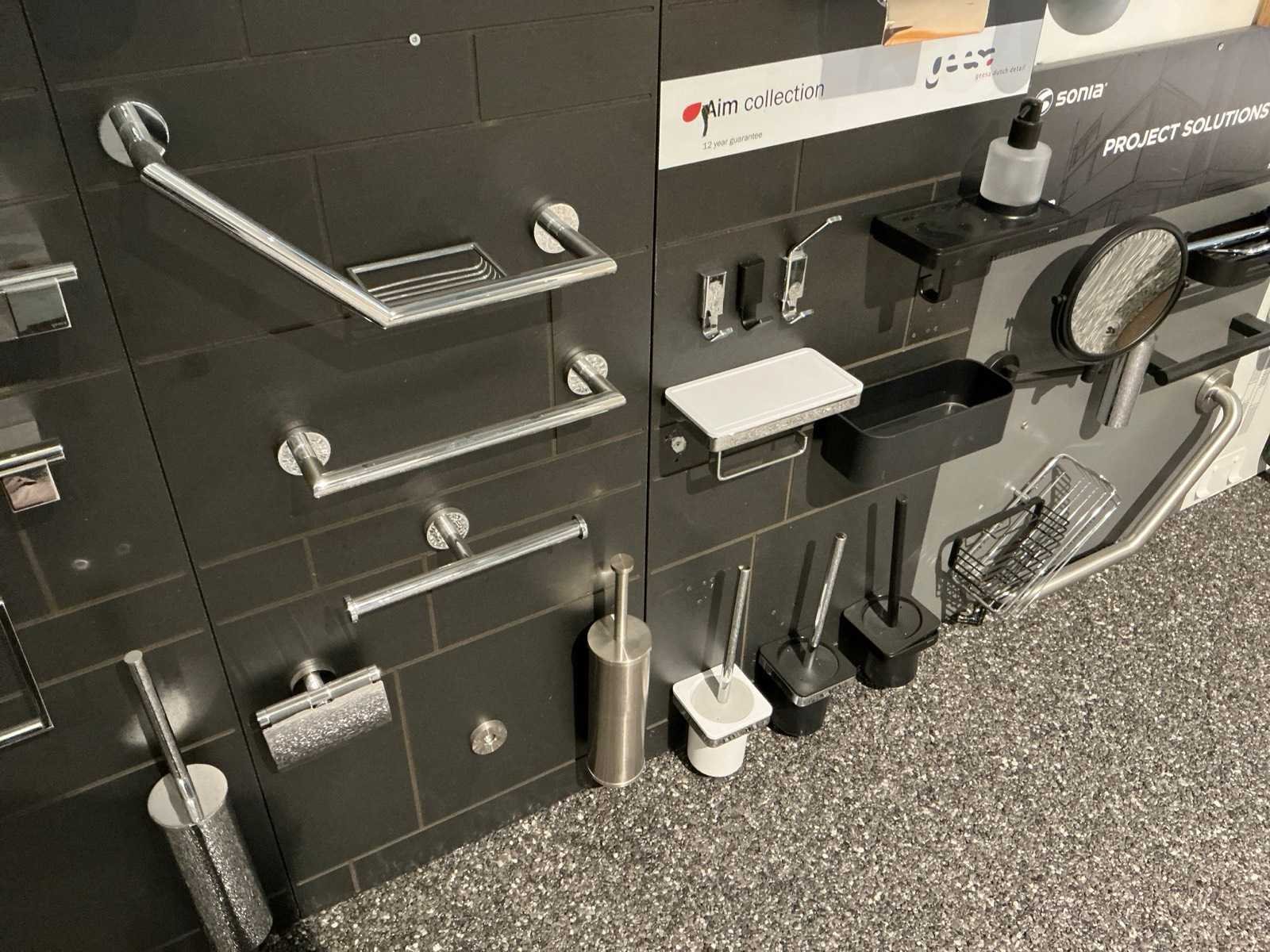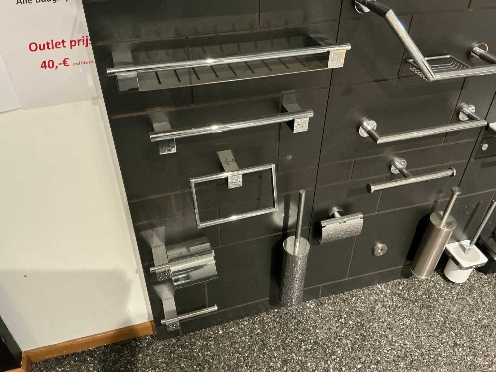 Waaronder glashouders, toiletborstel houders, zeepdispensers, handdoekhouders, wc-rolhouders,… Waaronder Geesa, Sonia, Clou. Hangende op 10 panelen. Door koper te demonteren. Nee