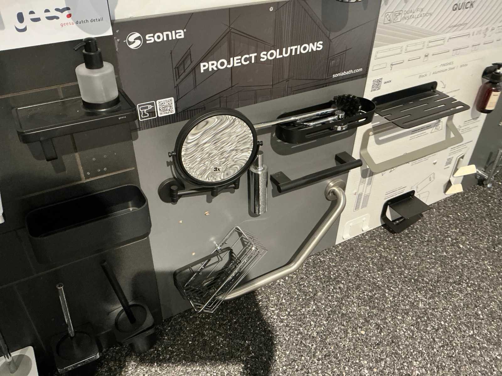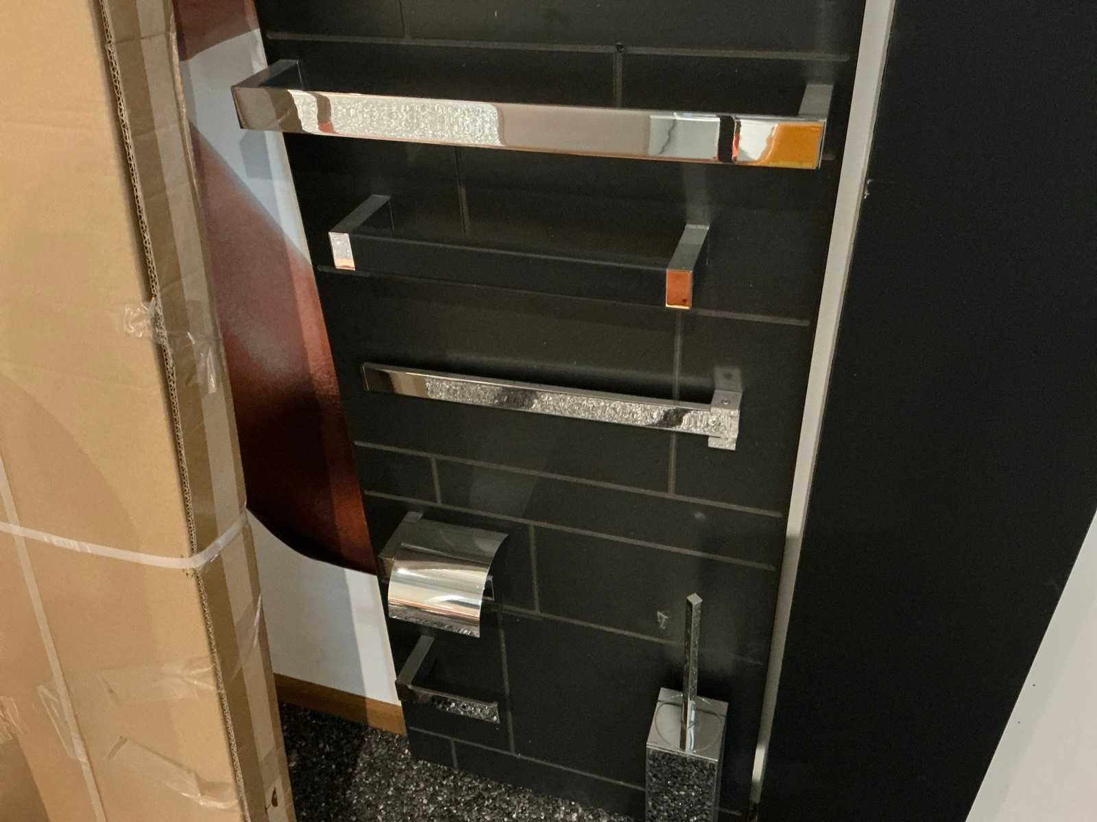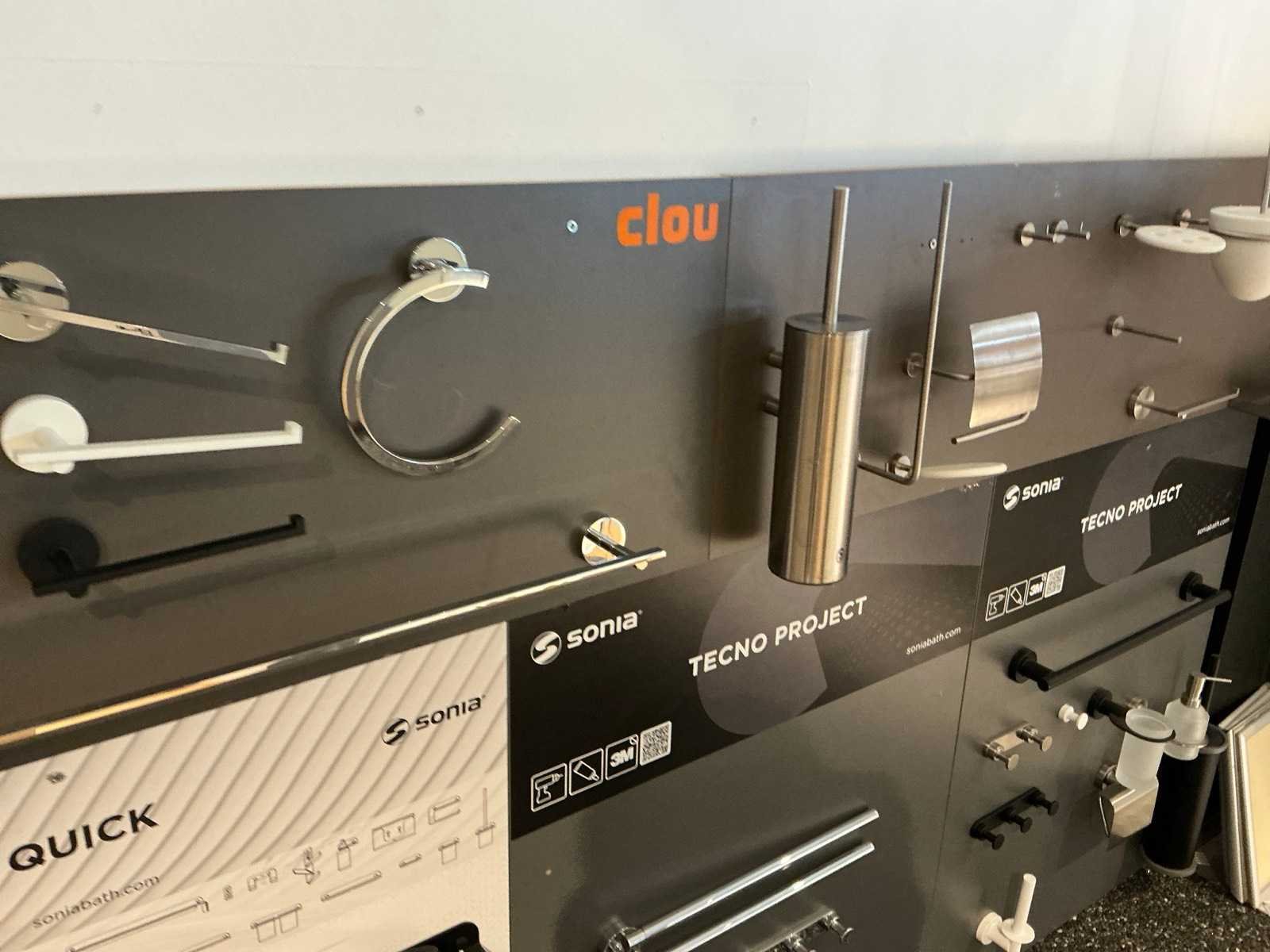 Waaronder glashouders, toiletborstel houders, zeepdispensers, handdoekhouders, wc-rolhouders,… Waaronder Geesa, Sonia, Clou. Hangende op 10 panelen. Door koper te demonteren. Nee