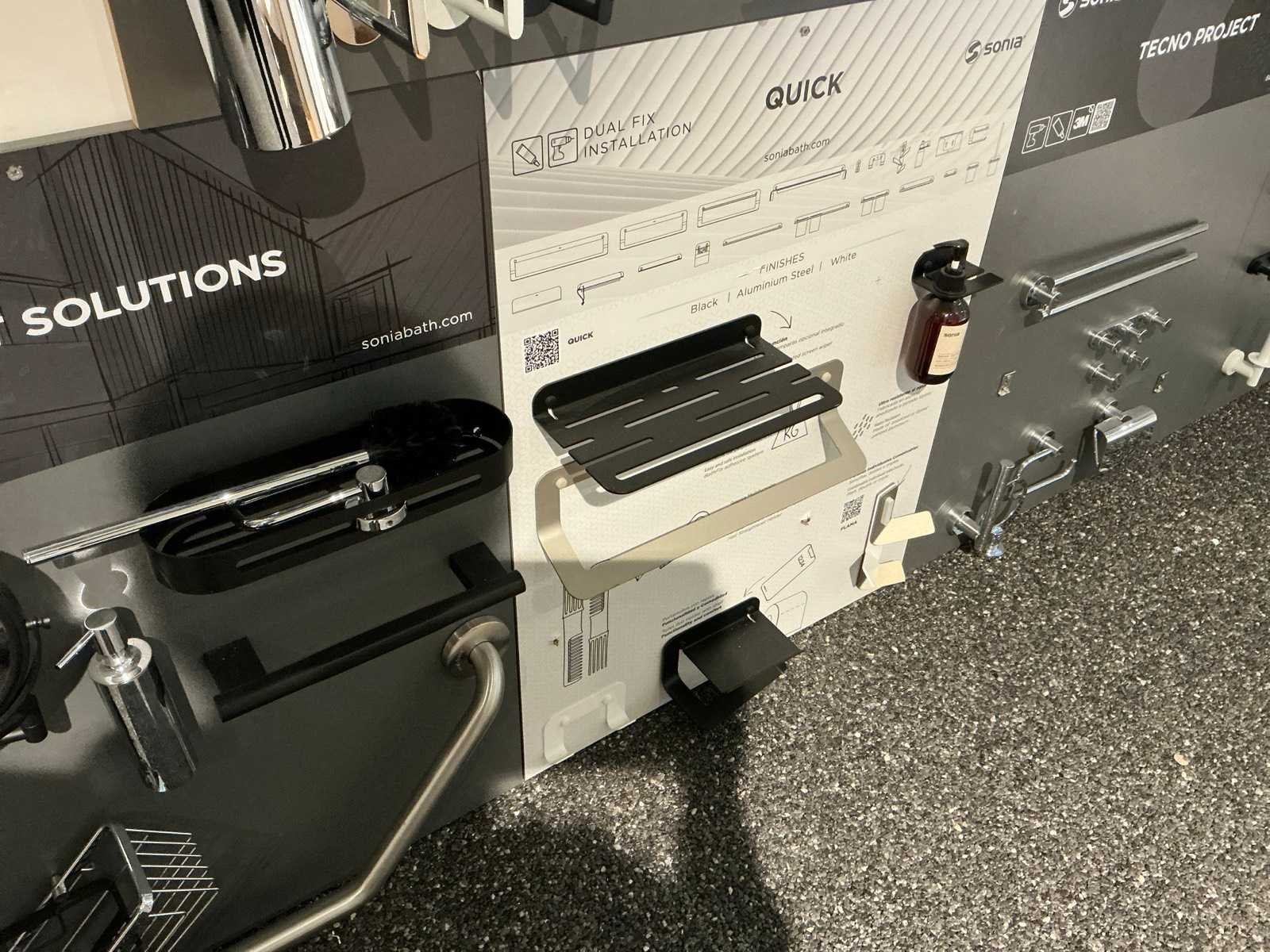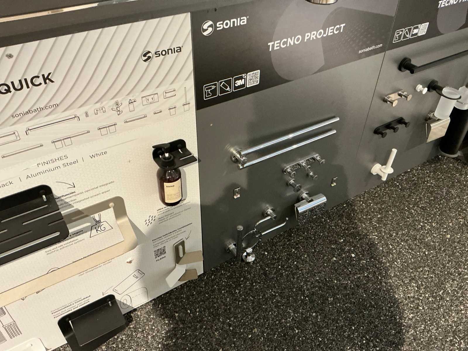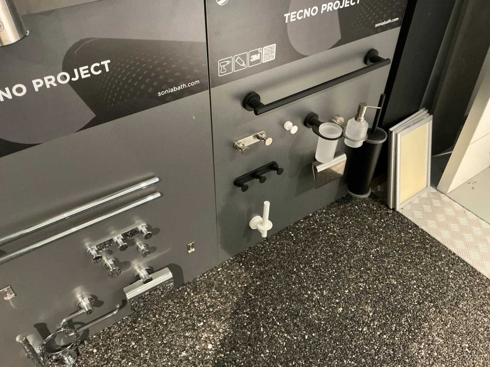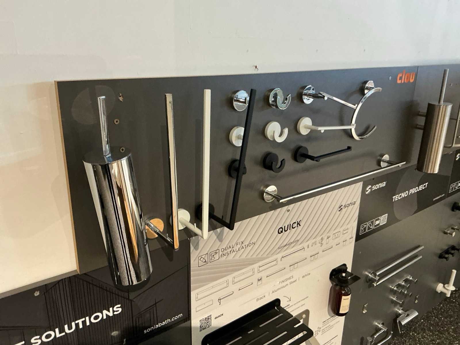 Waaronder glashouders, toiletborstel houders, zeepdispensers, handdoekhouders, wc-rolhouders,… Waaronder Geesa, Sonia, Clou. Hangende op 10 panelen. Door koper te demonteren. Nee