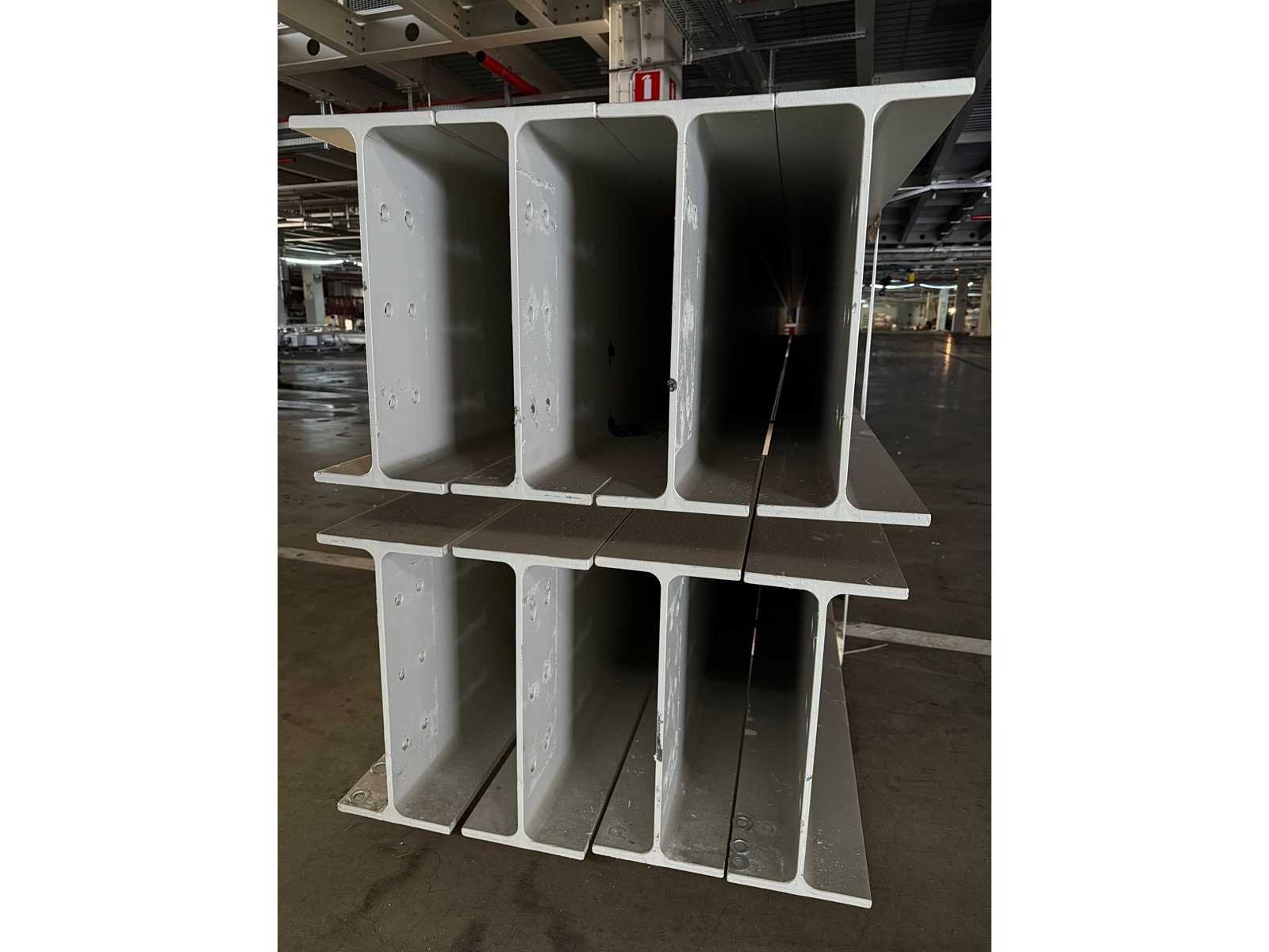 I balken, dikte I 10mm, hoogte 455mm, Dikte top 14mm, gewicht ca. 850Kg per balk, 8 balken per verpakking. Kavel is 1 pakket. No Bouwjaar: 2018 Afmeting l: 10880mm Afmeting b: 190mm