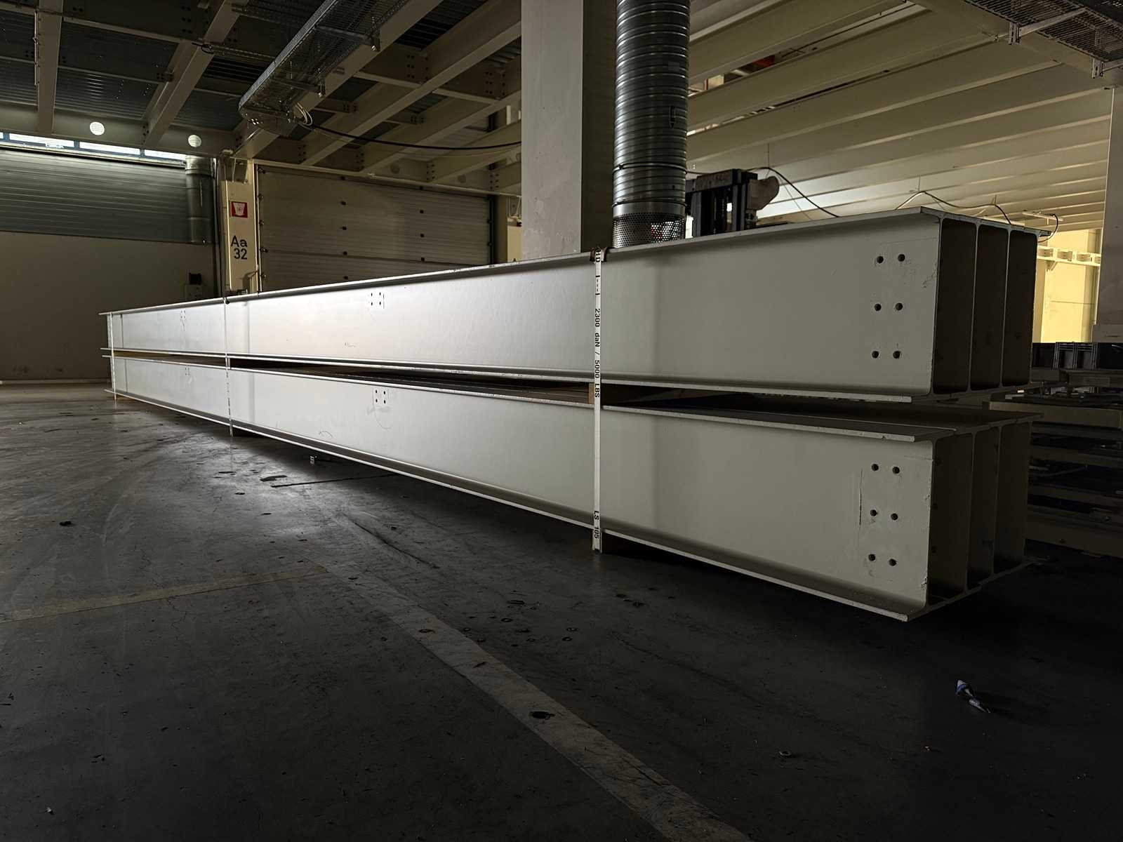 I balken, dikte I 10mm, hoogte 455mm, Dikte top 14mm, gewicht ca. 850Kg per balk, 8 balken per verpakking. Kavel is 1 pakket. No Bouwjaar: 2018 Afmeting l: 10880mm Afmeting b: 190mm