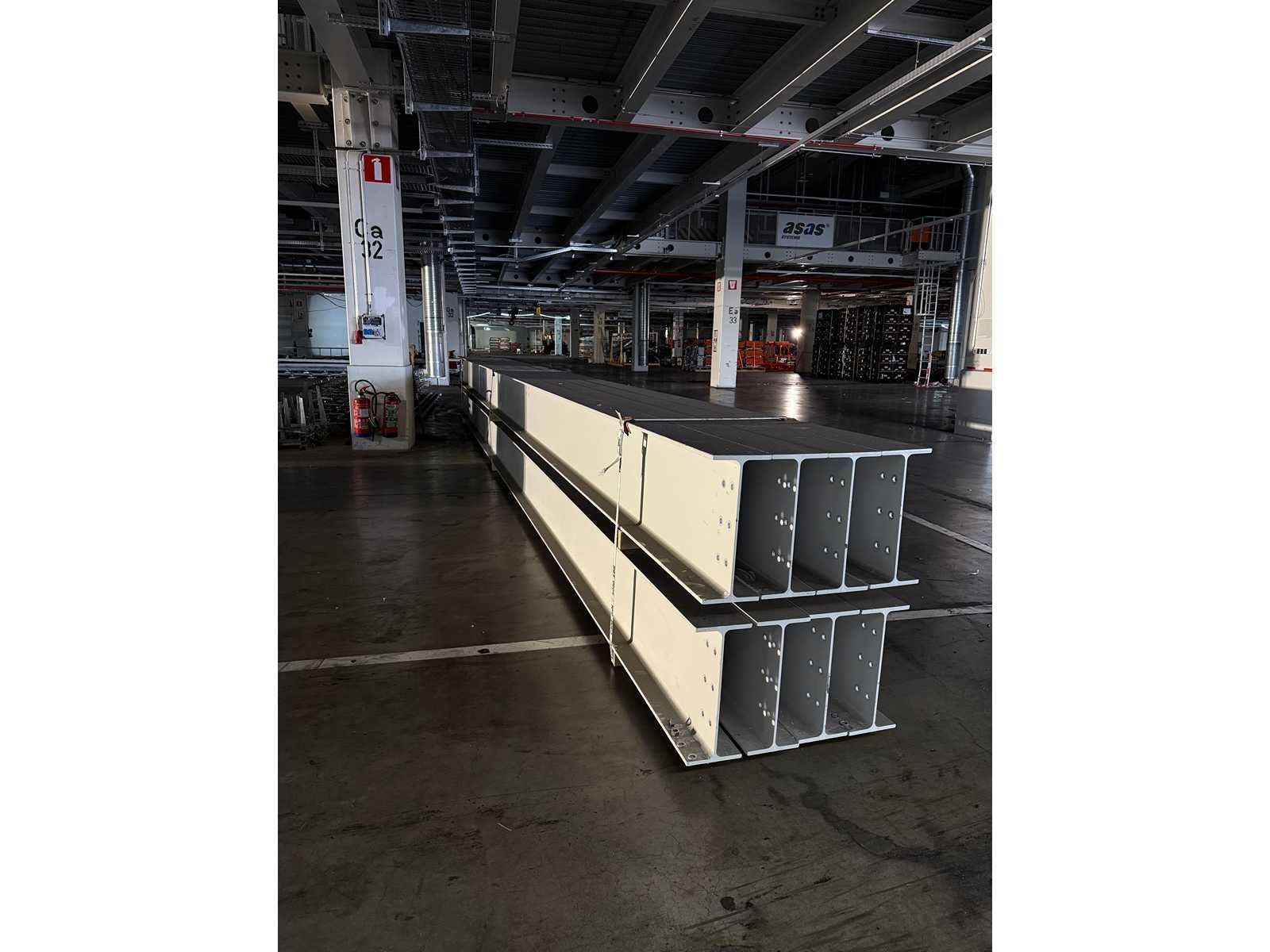 I balken, dikte I 10mm, hoogte 455mm, Dikte top 14mm, gewicht ca. 850Kg per balk, 8 balken per verpakking. Kavel is 1 pakket. No Bouwjaar: 2018 Afmeting l: 10880mm Afmeting b: 190mm