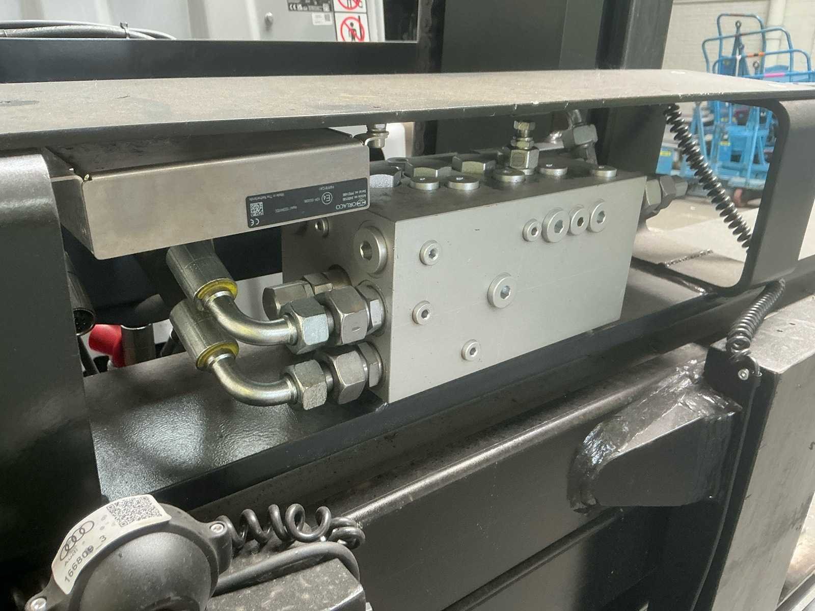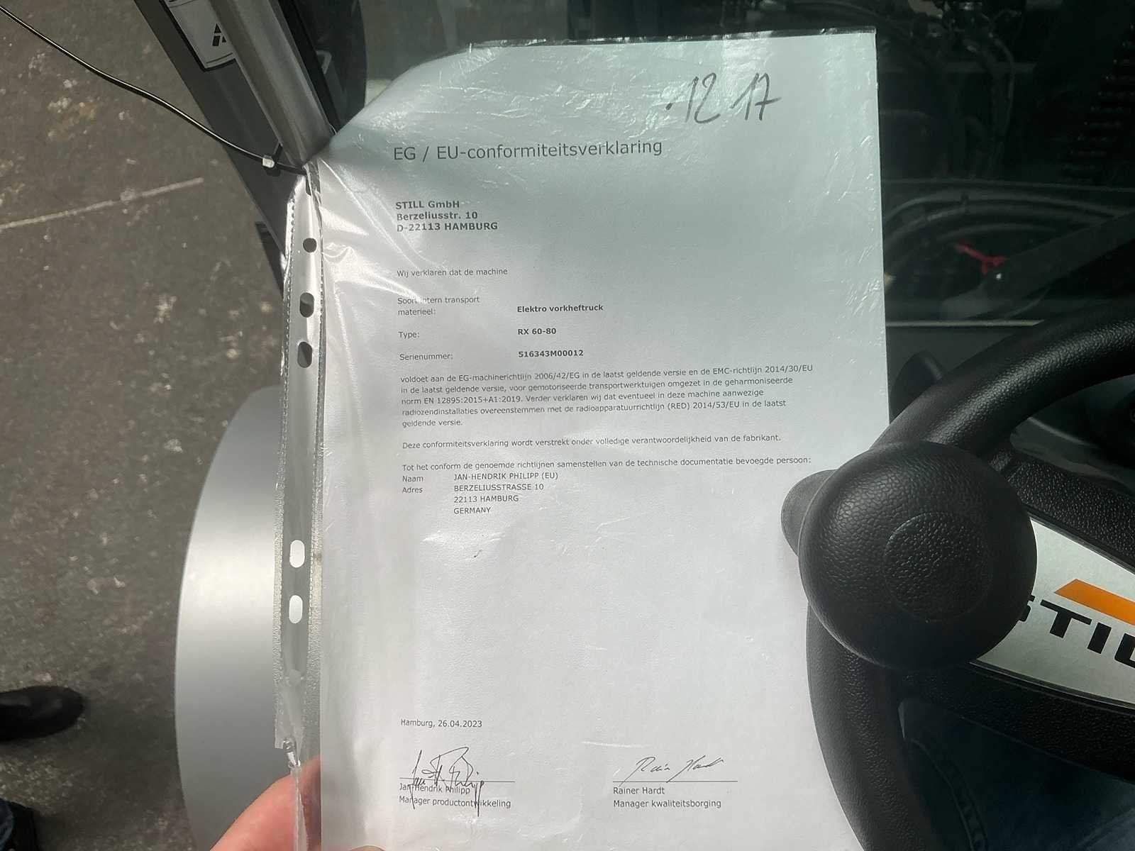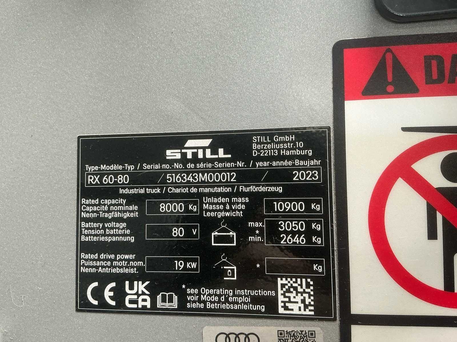 Spanning: 80 ; Type batterij: ; Uurteller 3e kwartier 64 ; Lengte totaal inclusief vorken 5900mm, vorklengte 2300mm, werkuren 95u. No Merk: STILL Type: RX60-80 CAB Bouwjaar: 2023 Serienummer: 516343M00012 Eigen gewicht: 10900kg Totale afmeting L: 3300mm Totale afmeting Breedte: 2200mm Totale afmeting Hoogte: 3000mm