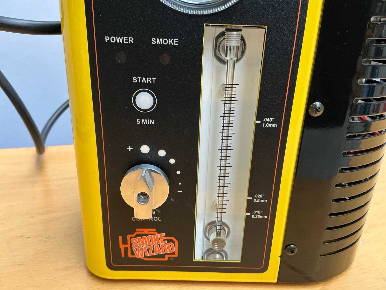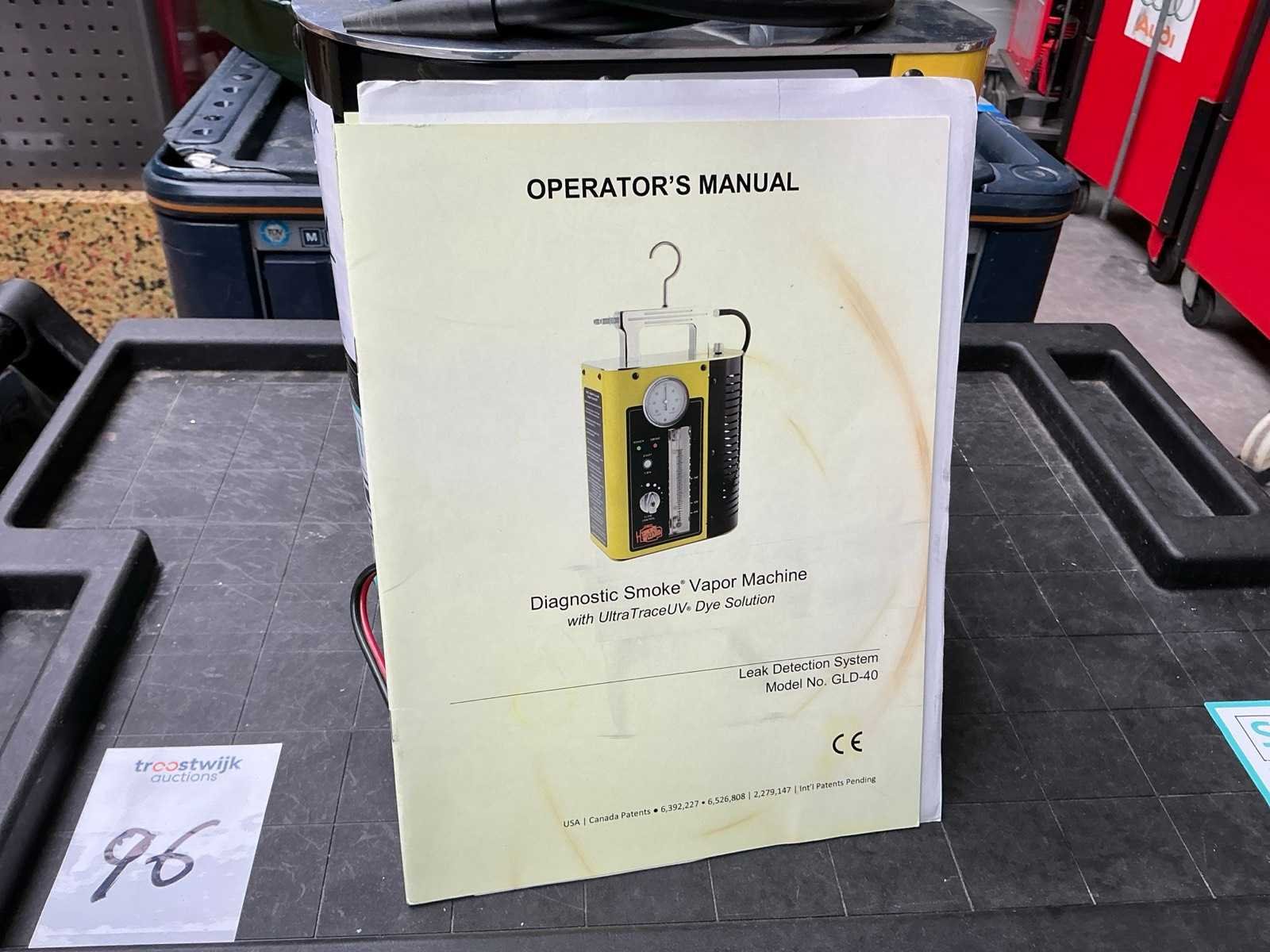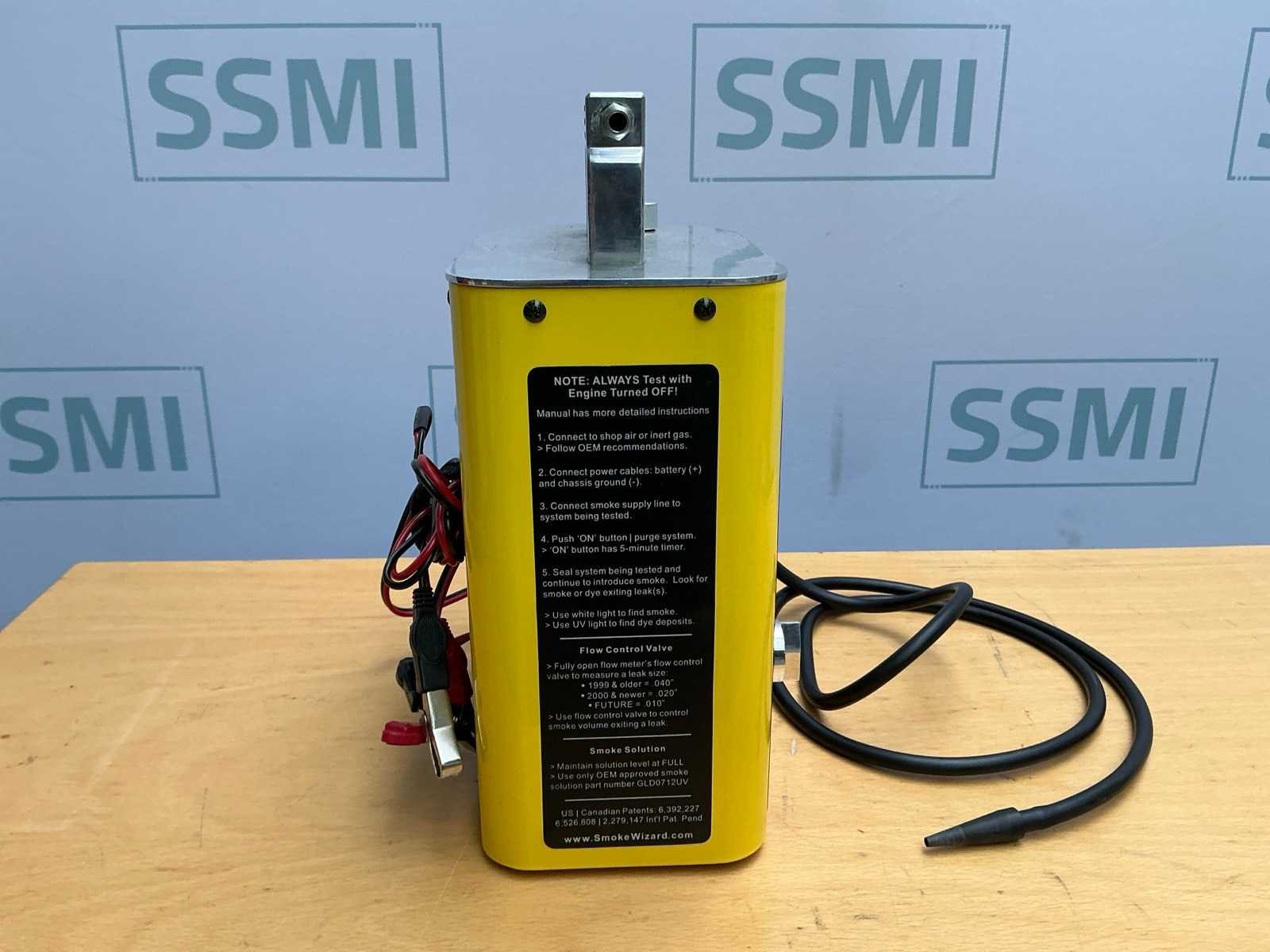 Diagnostic smoke vapor machine with ultratraceUV dye solution Nee Merk: Smoke Wizard Type: GLD-40 Aansluiting: 12V Totale afmeting L: 250mm Totale afmeting Breedte: 220mm Totale afmeting Hoogte: 370mm