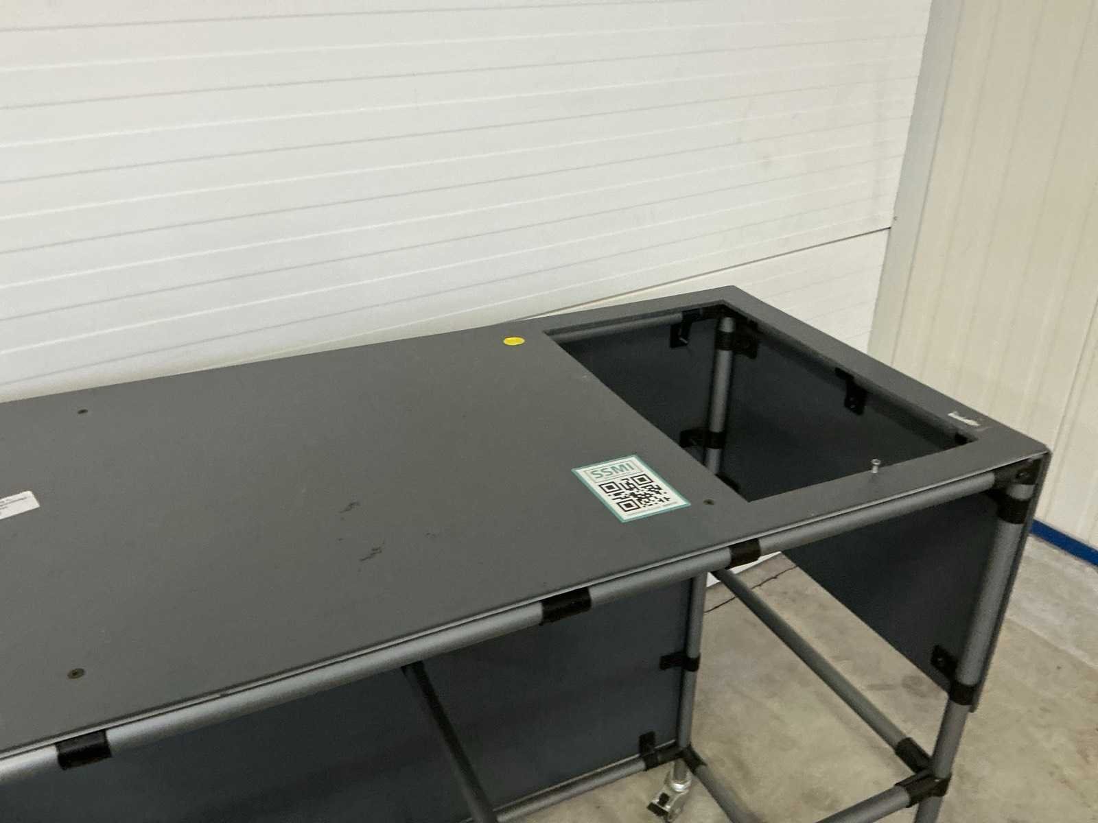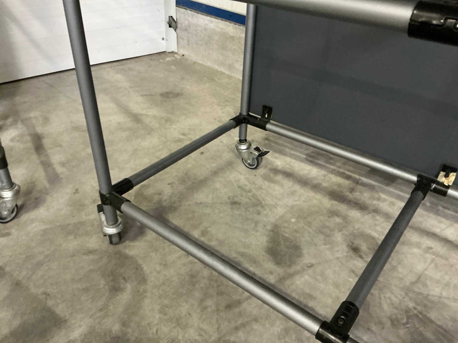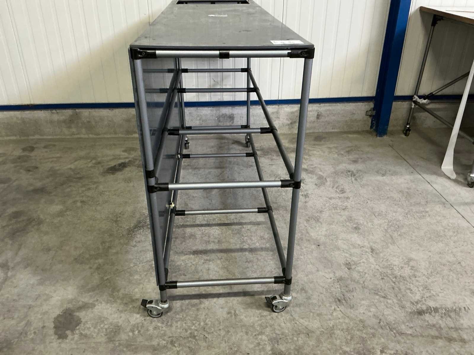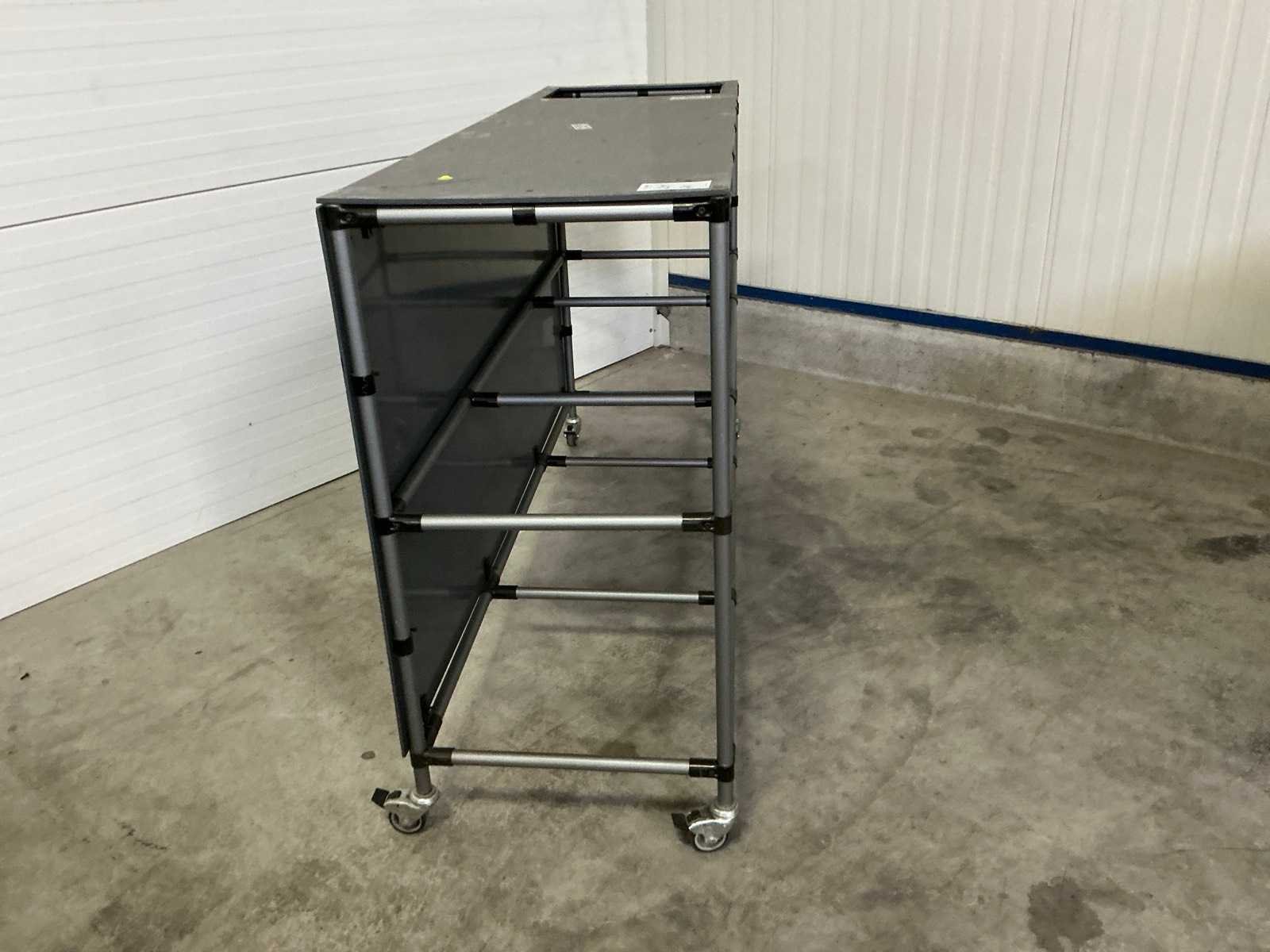 Legbordhoogte 20 en 70cm mogelijk; nu zonder legbord; voorzien van 4 zwenkwielen met rem; met achterwand Nee Lengte: 201cm Breedte: 60cm Hoogte: 121cm Materiaal: Kunststof