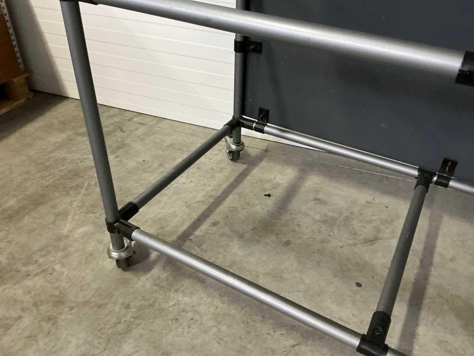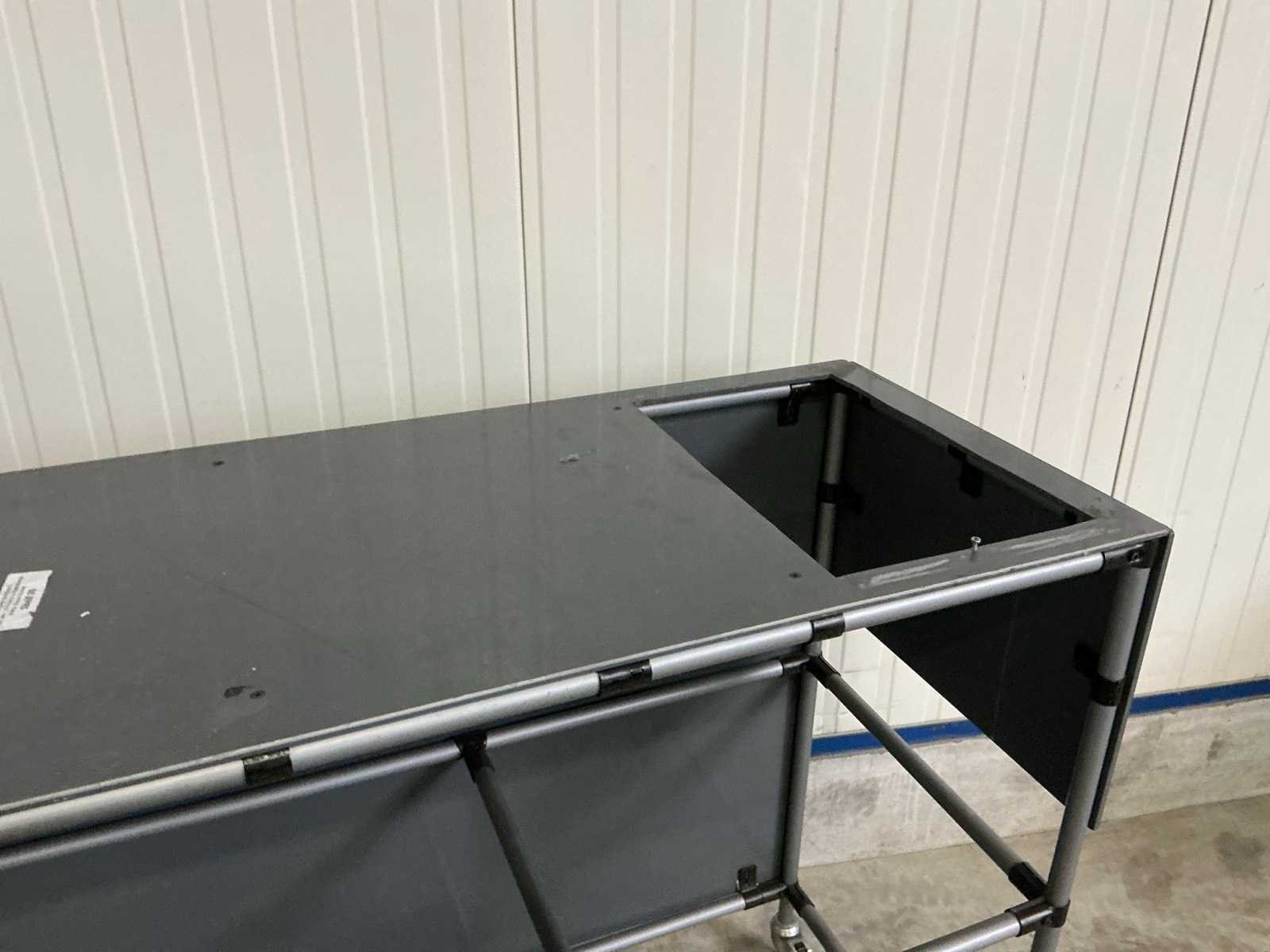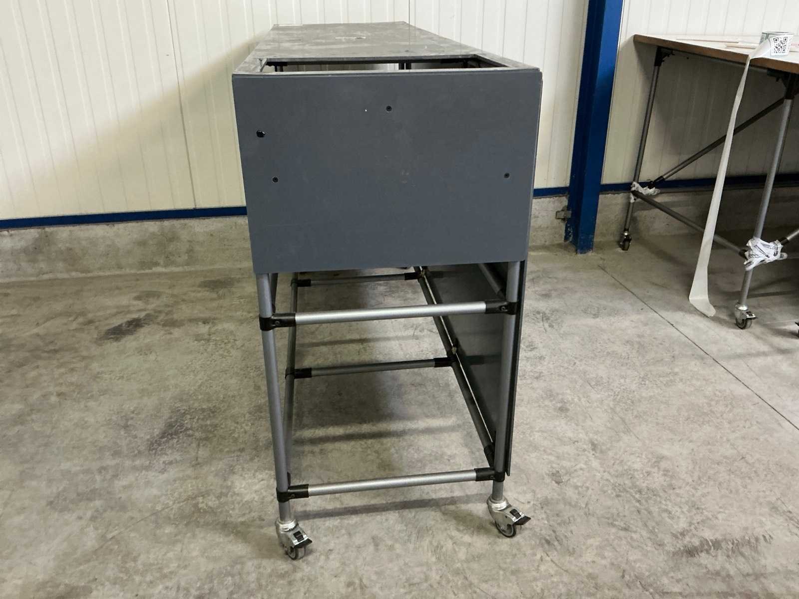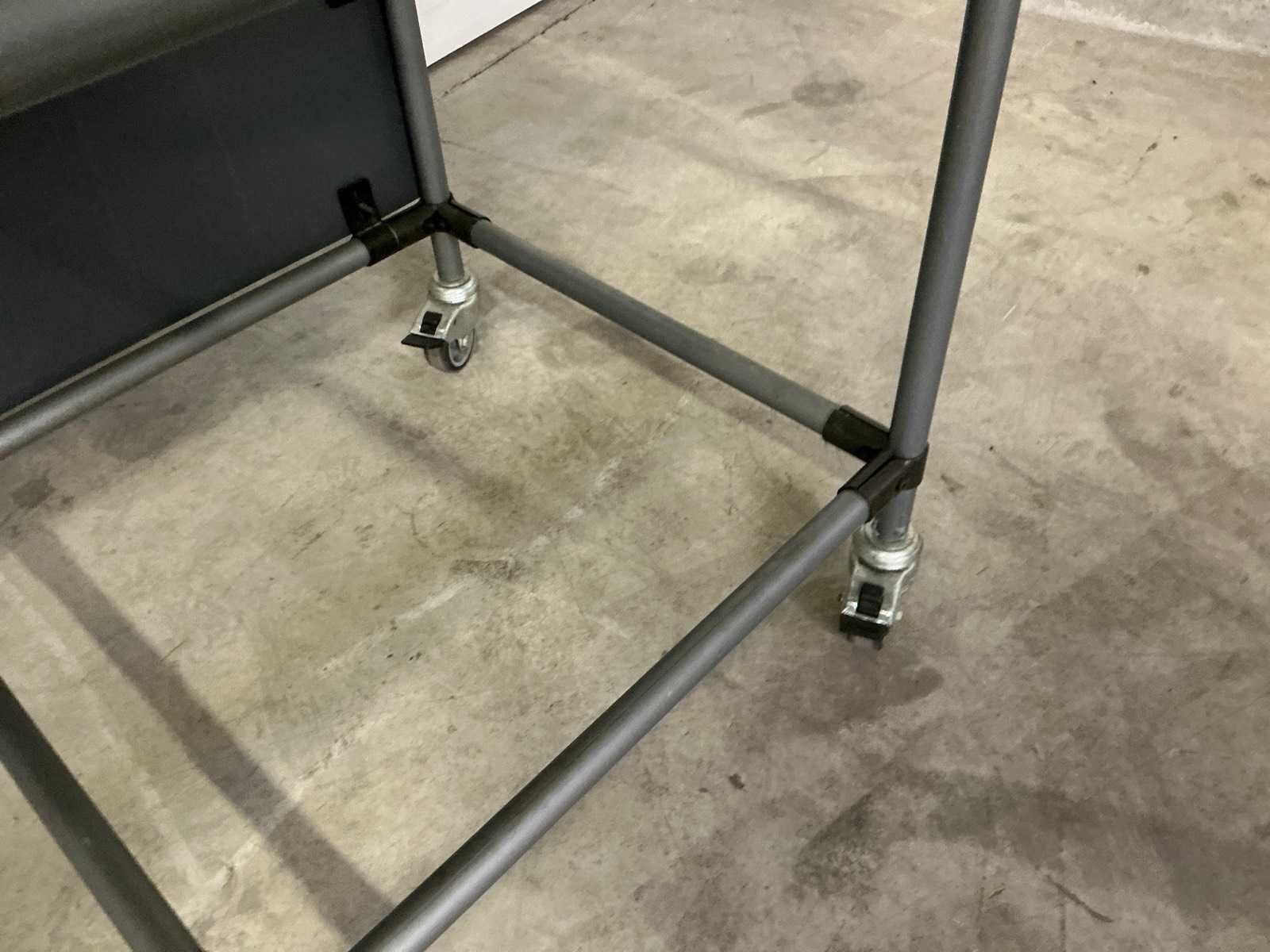 Legbordhoogte 20 en 70cm mogelijk; nu zonder legbord; voorzien van 4 zwenkwielen met rem; met achterwand Nee Lengte: 201cm Breedte: 60cm Hoogte: 121cm Materiaal: Kunststof