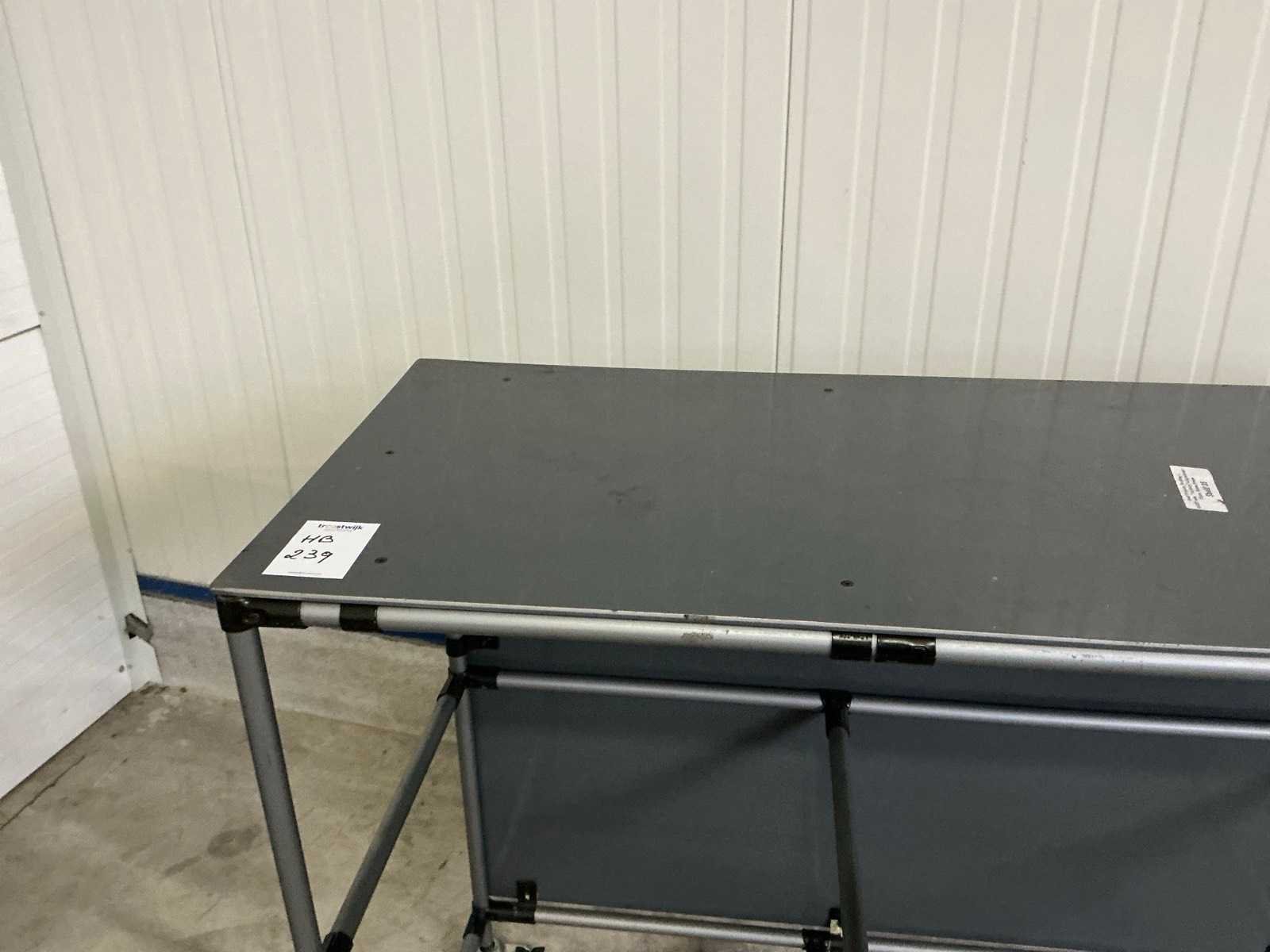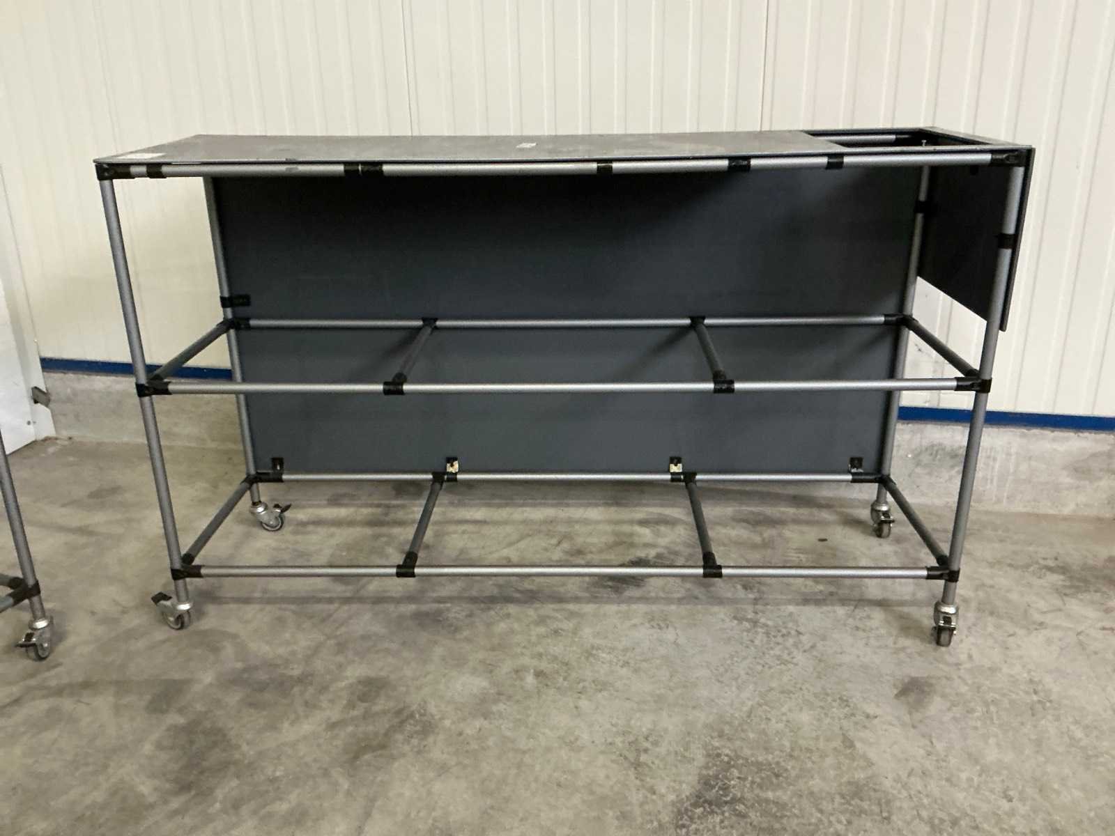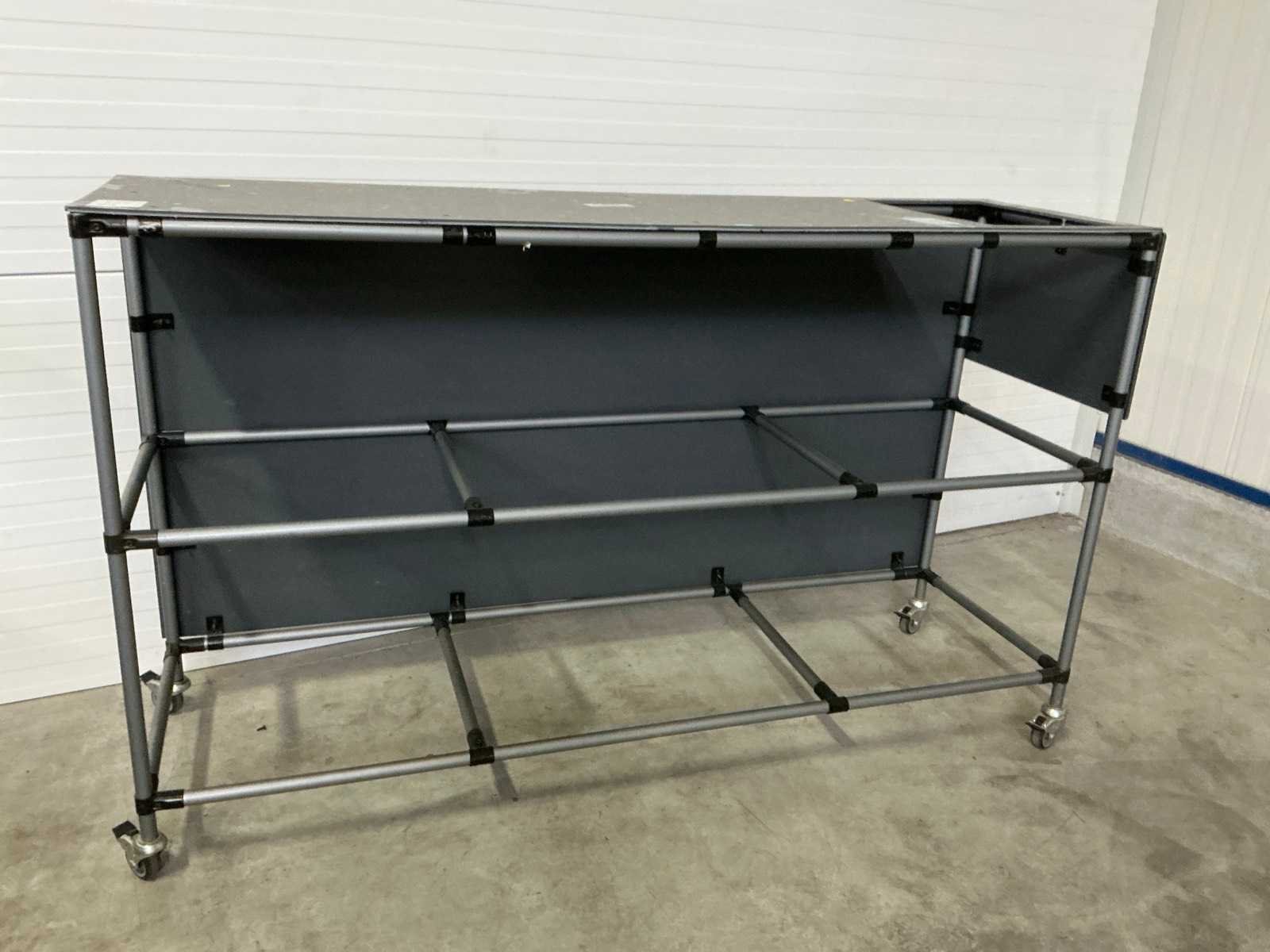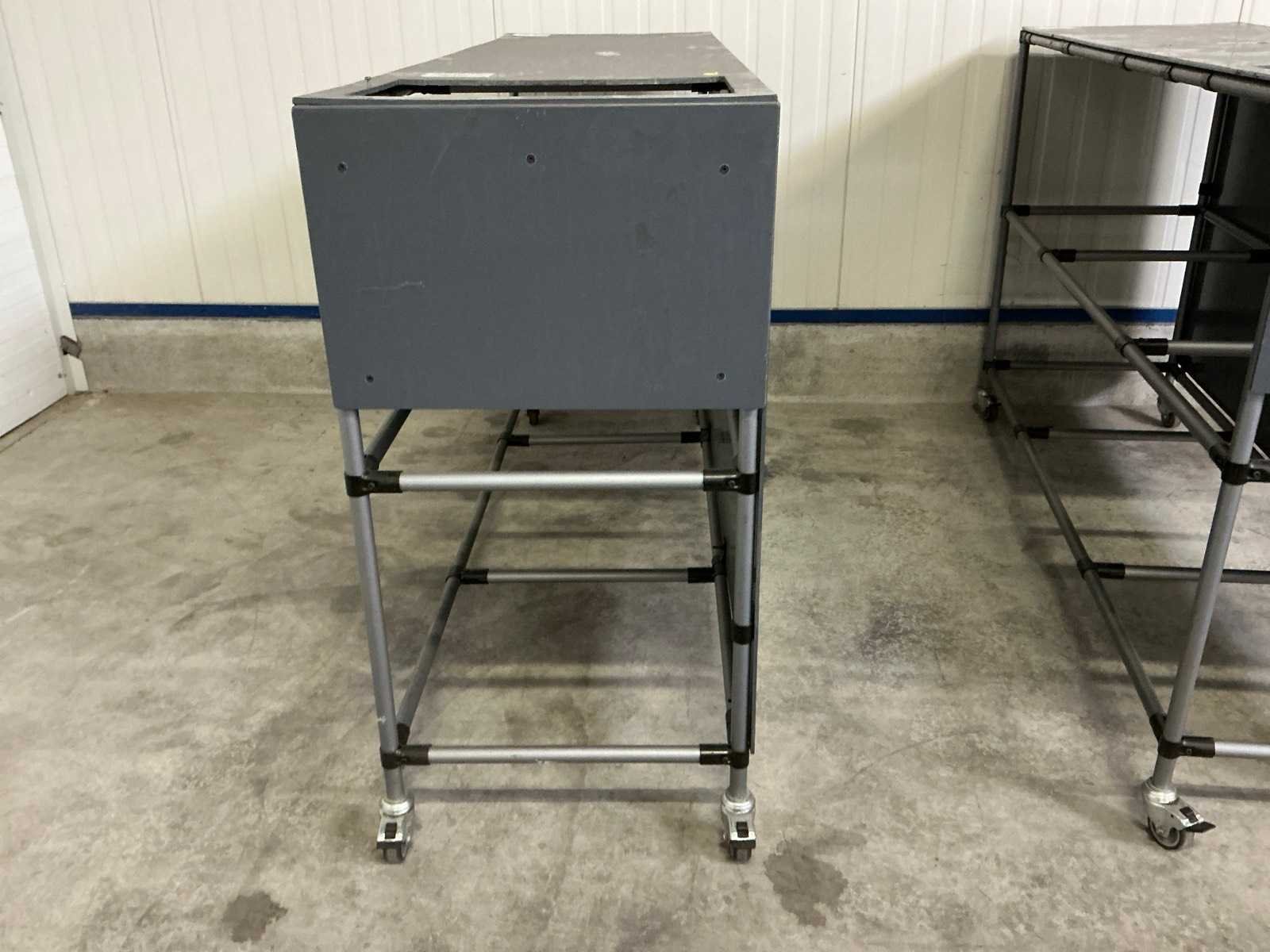 Legbordhoogte 20 en 70cm mogelijk; nu zonder legbord; voorzien van 4 zwenkwielen met rem; met achterwand Nee Lengte: 201cm Breedte: 60cm Hoogte: 121cm Materiaal: Kunststof