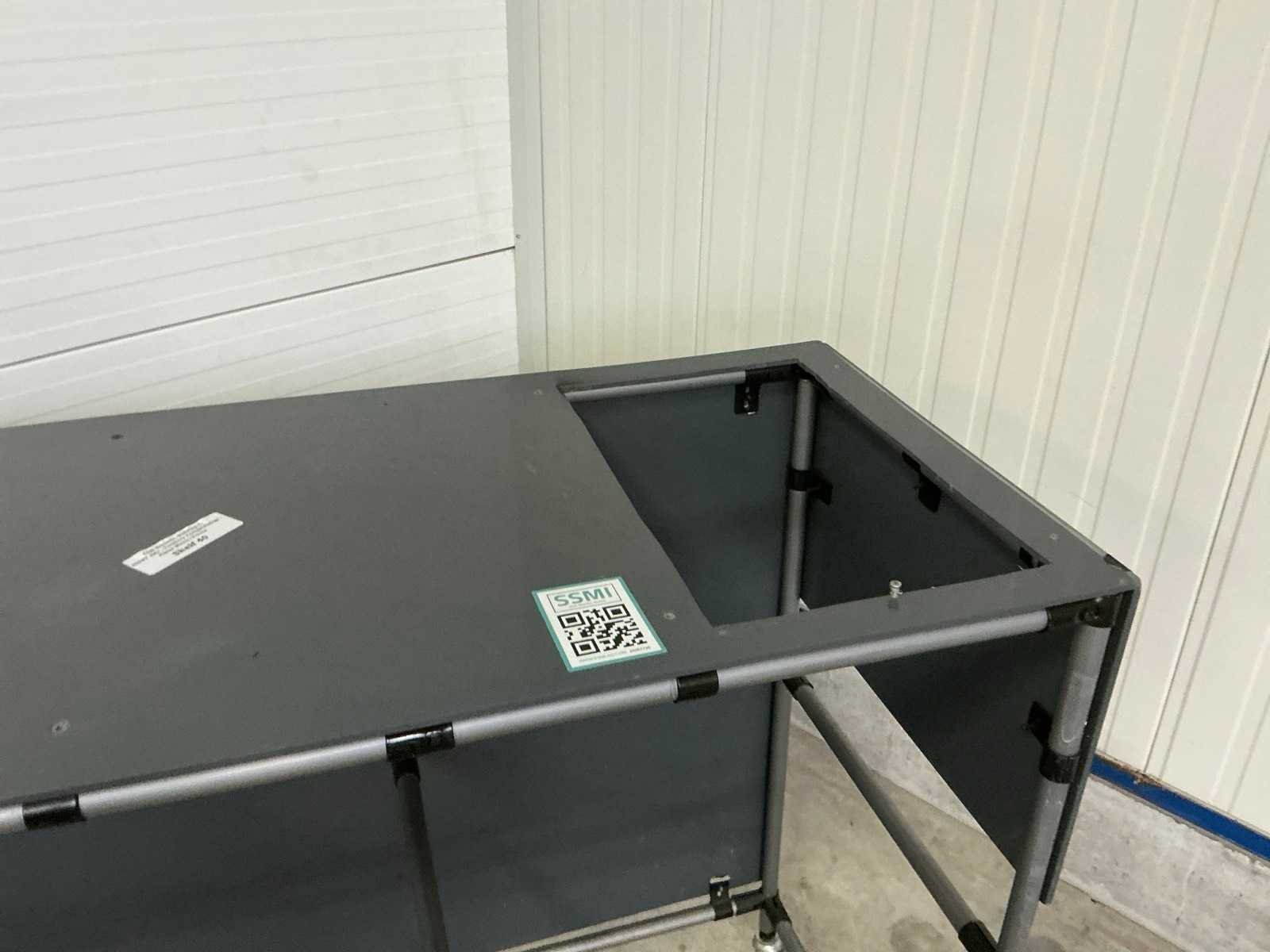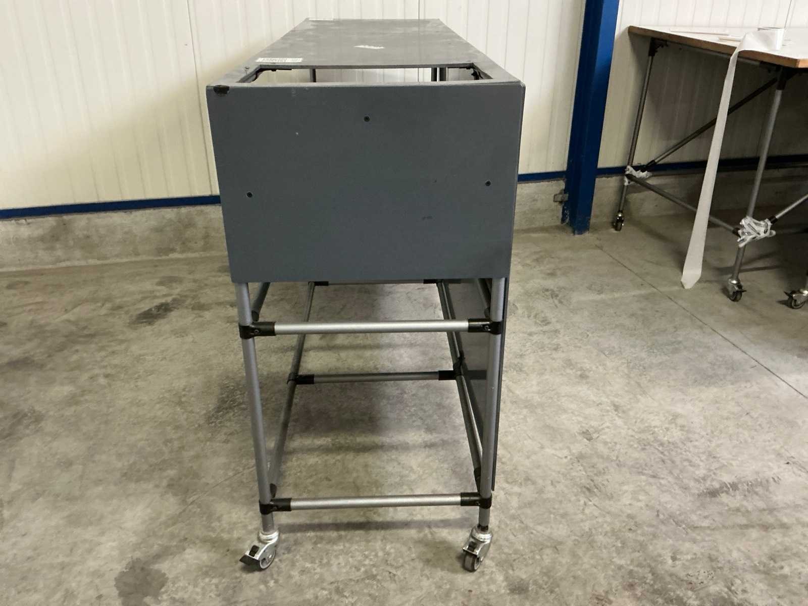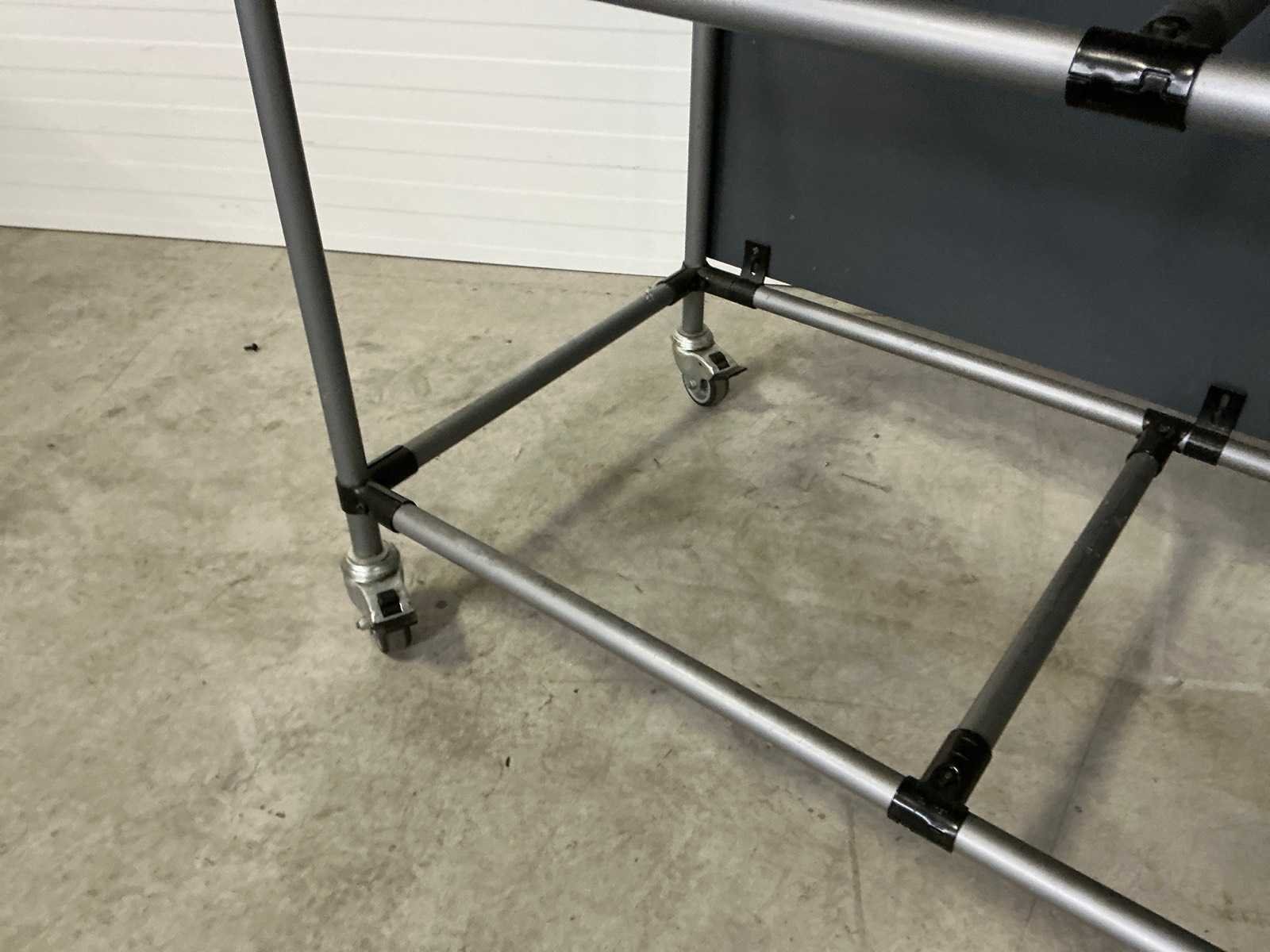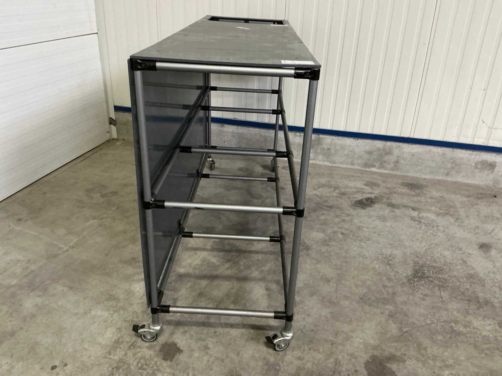 Legbordhoogte 20 en 70cm mogelijk; nu zonder legbord; voorzien van 4 zwenkwielen met rem; met achterwand Nee Lengte: 201cm Breedte: 60cm Hoogte: 121cm Materiaal: Kunststof