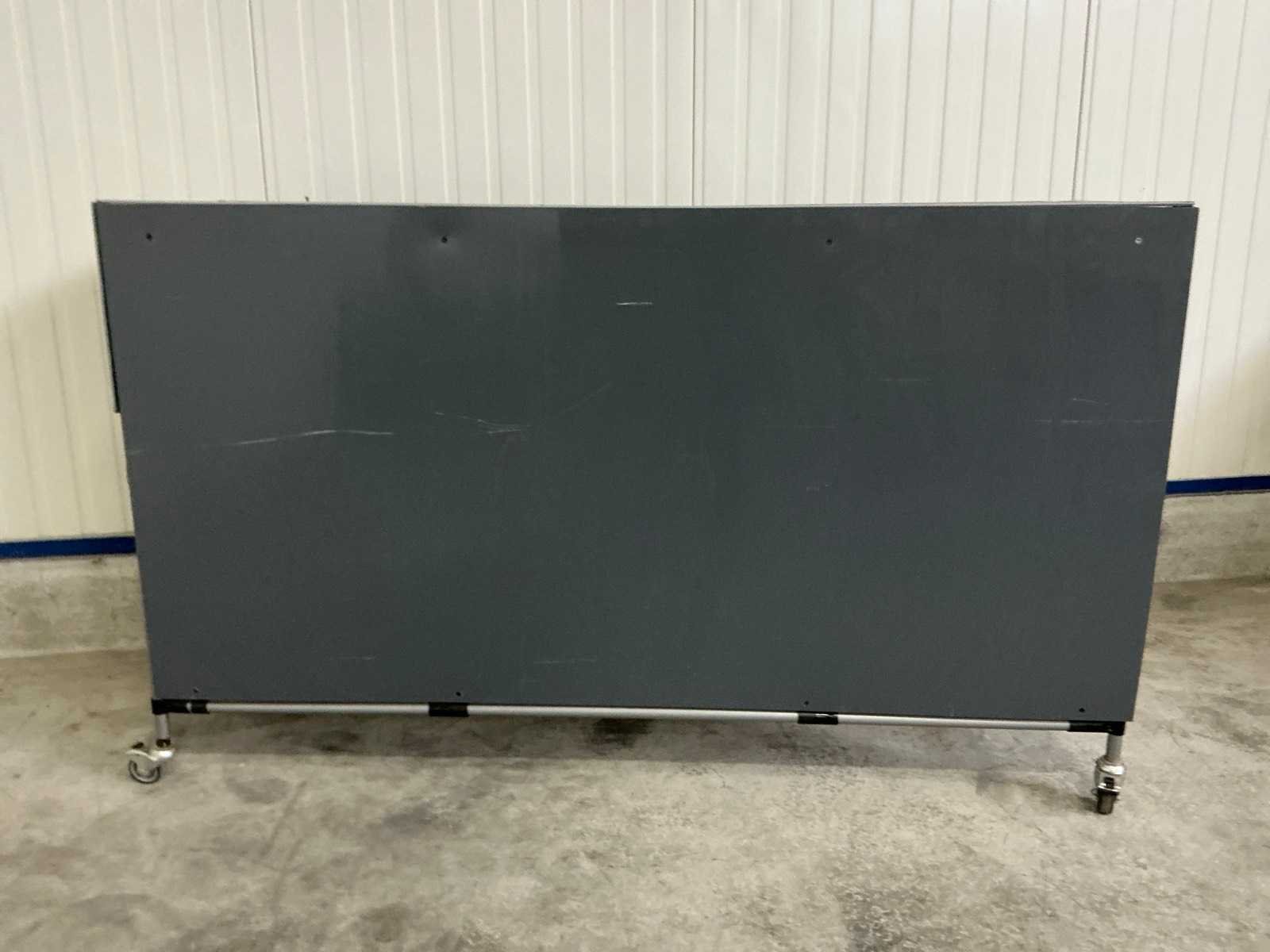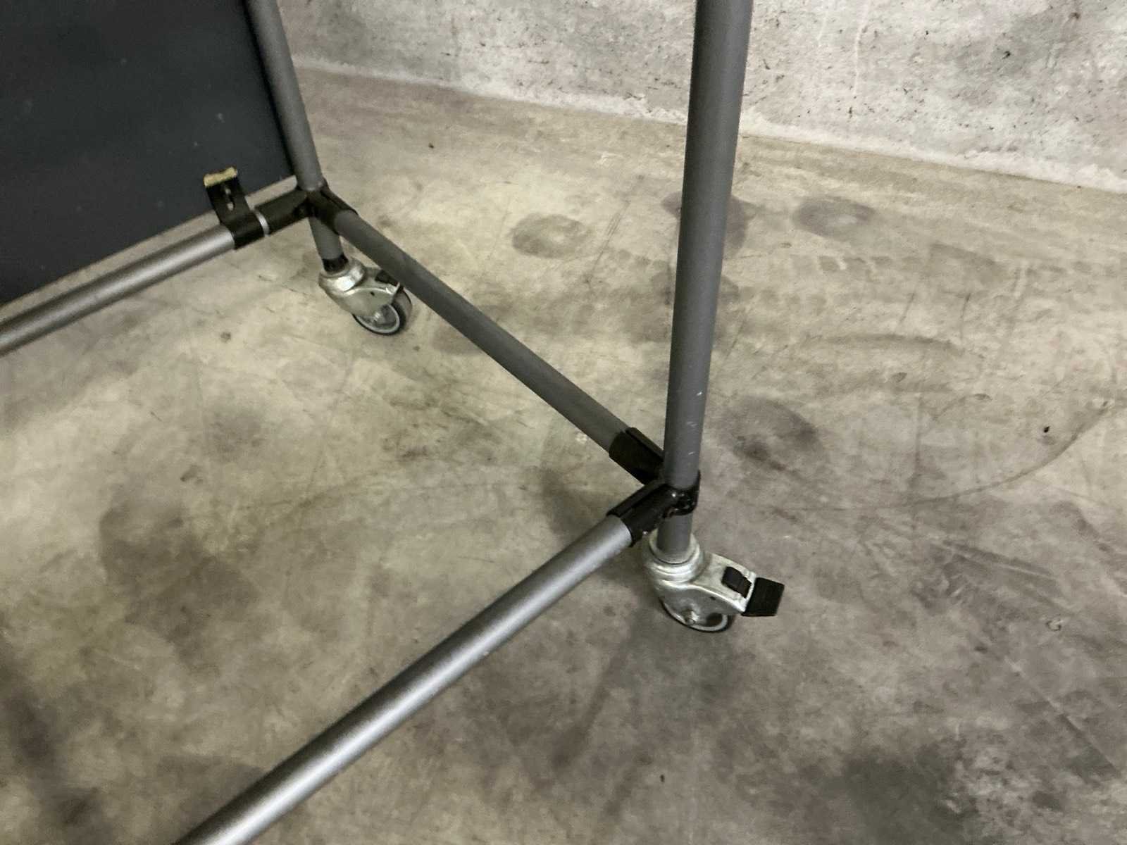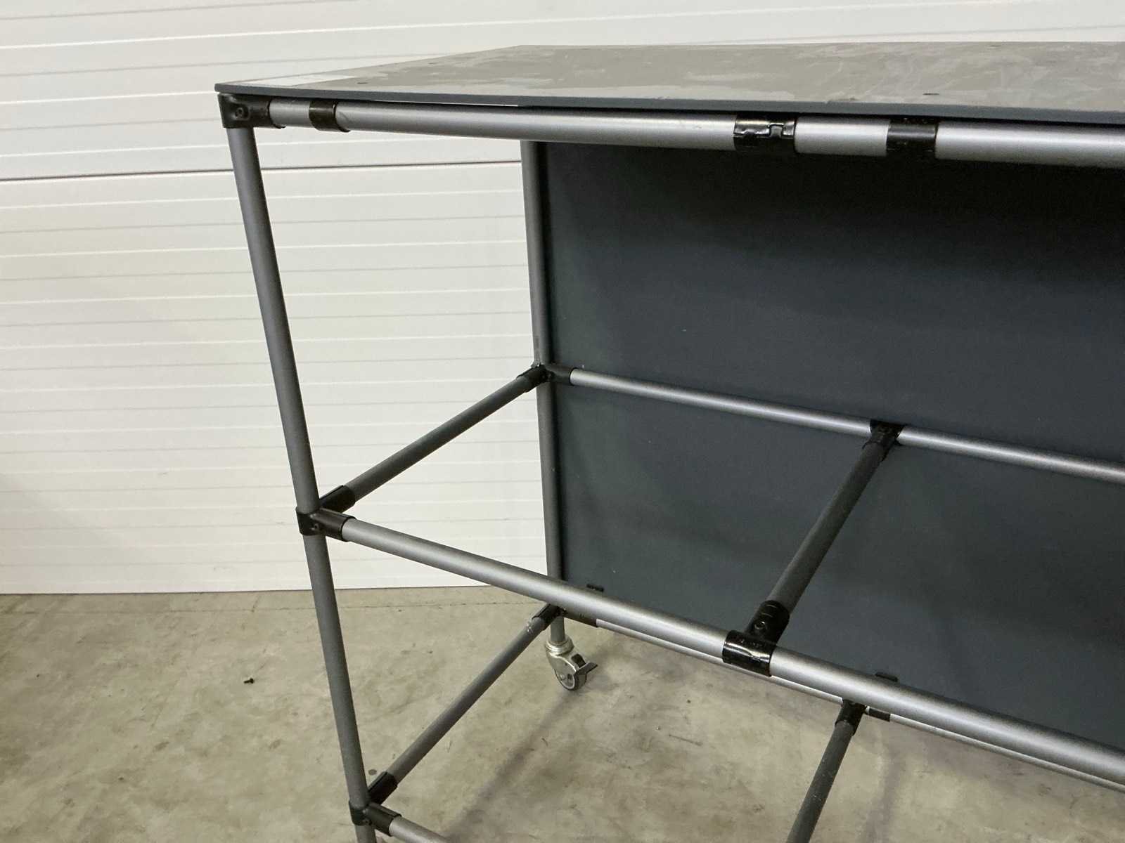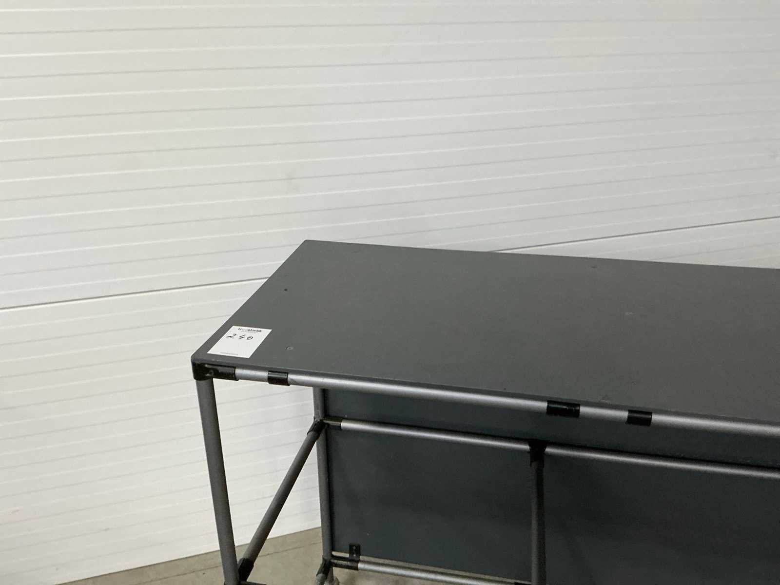 Legbordhoogte 20 en 70cm mogelijk; nu zonder legbord; voorzien van 4 zwenkwielen met rem; met achterwand Nee Lengte: 201cm Breedte: 60cm Hoogte: 121cm Materiaal: Kunststof