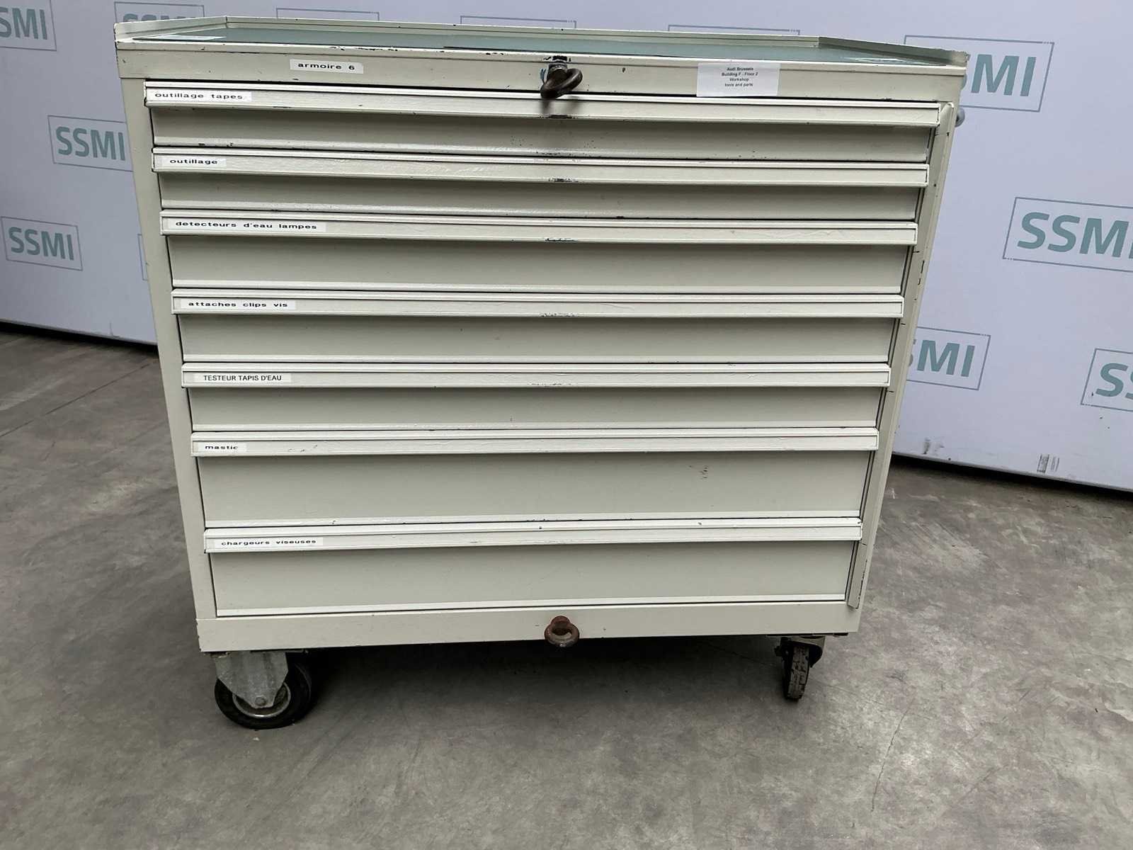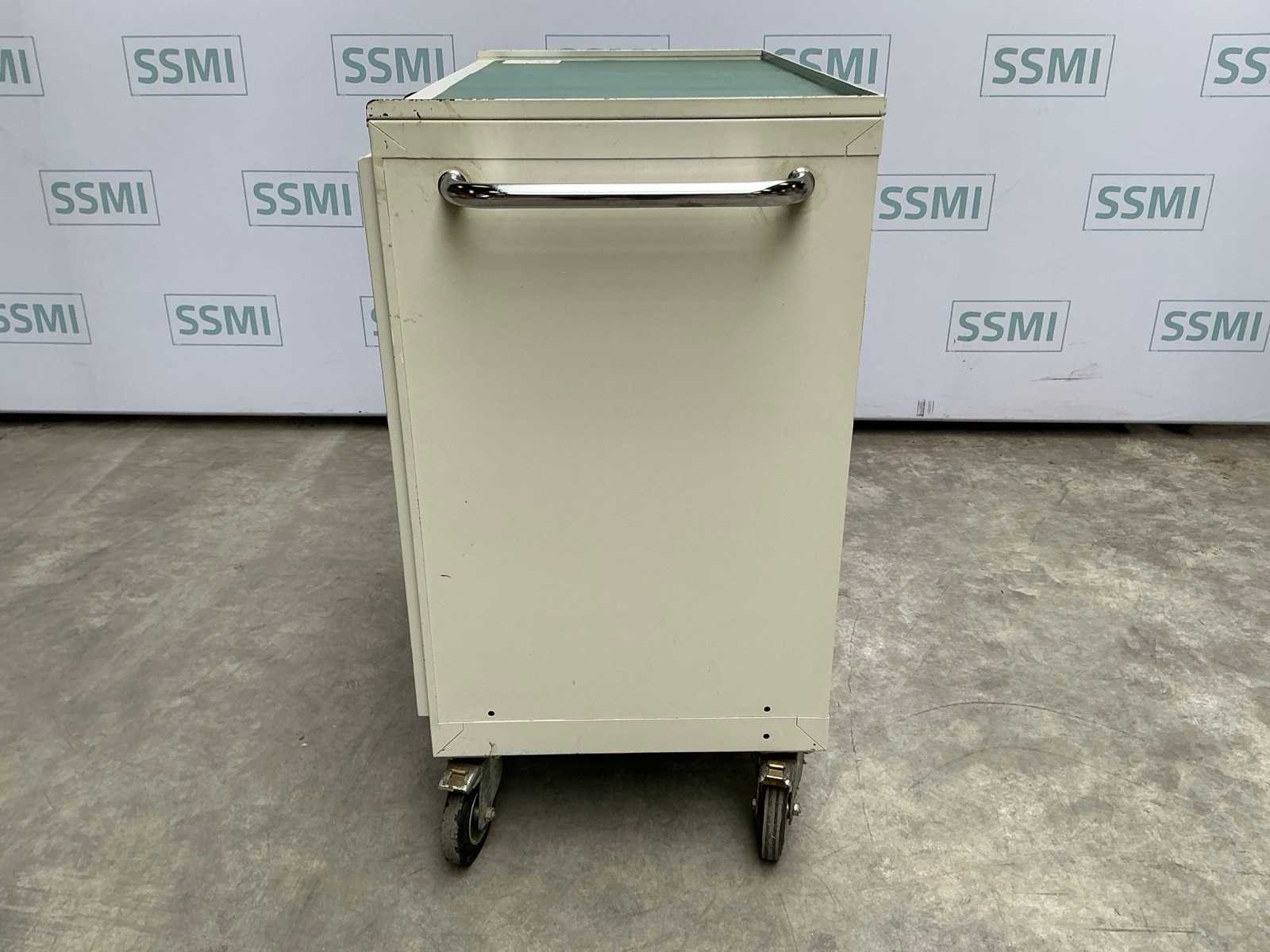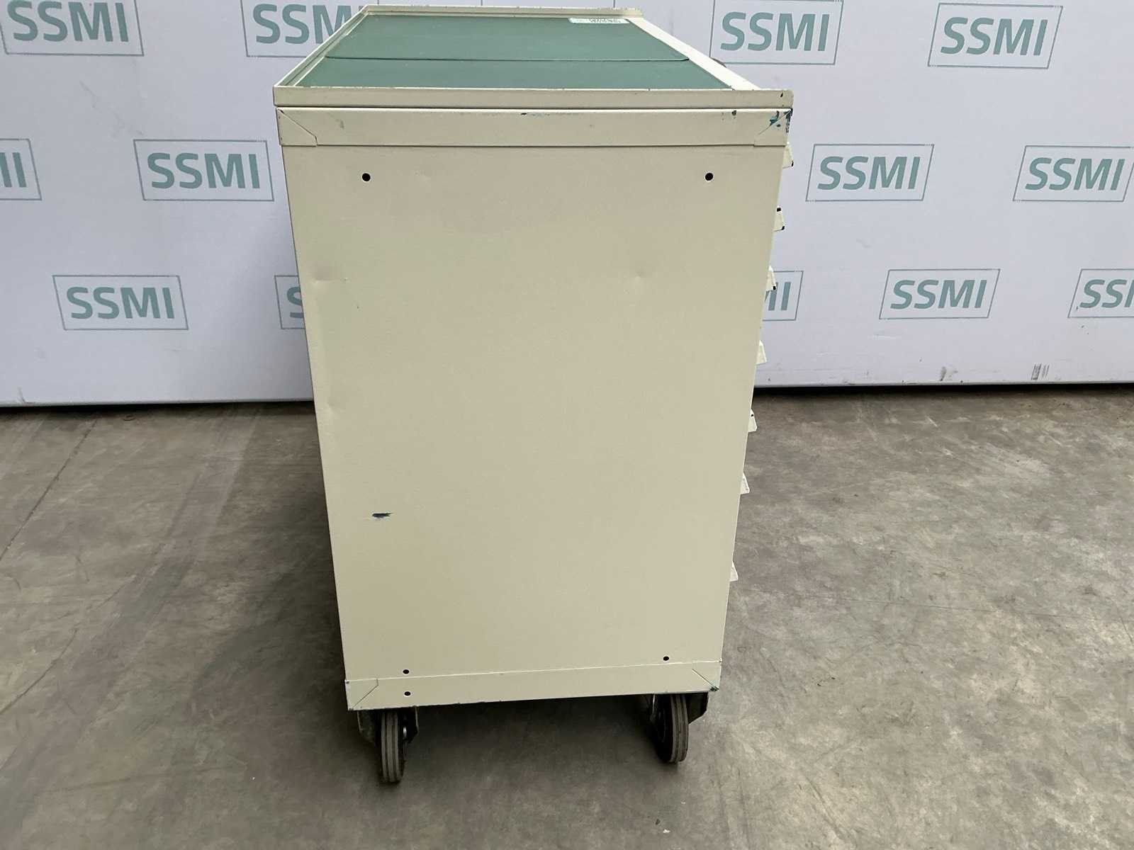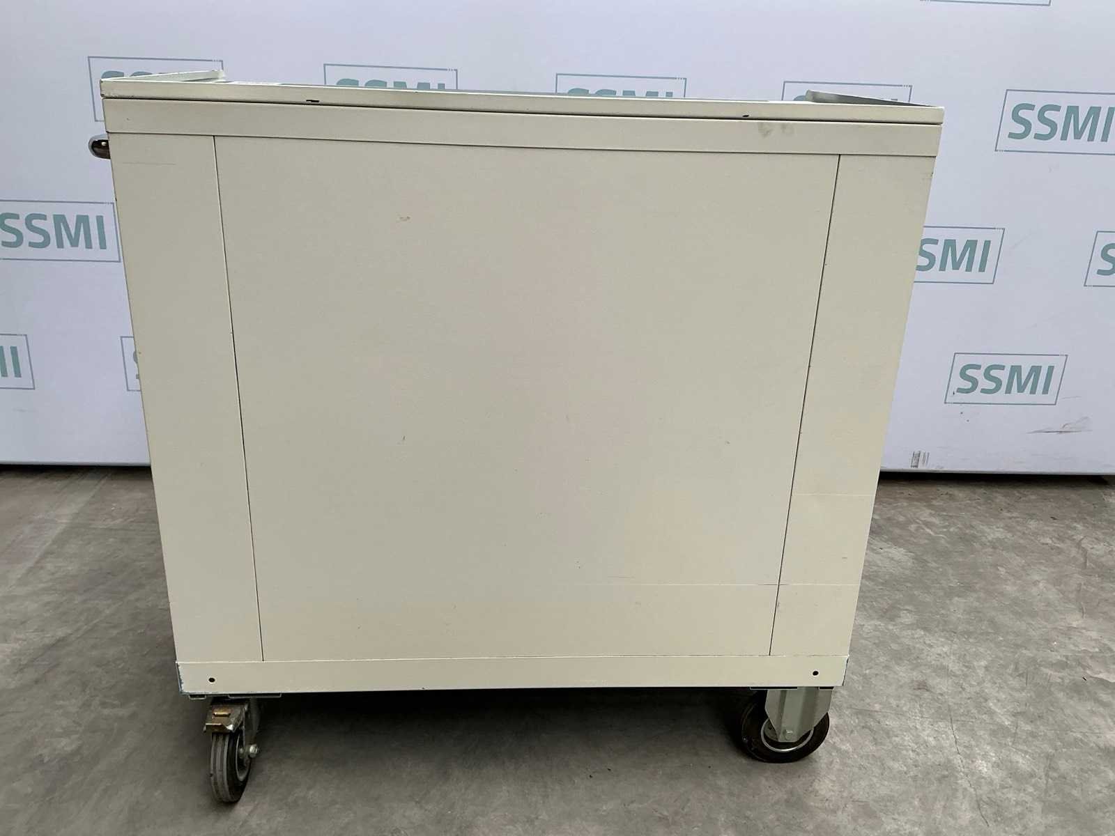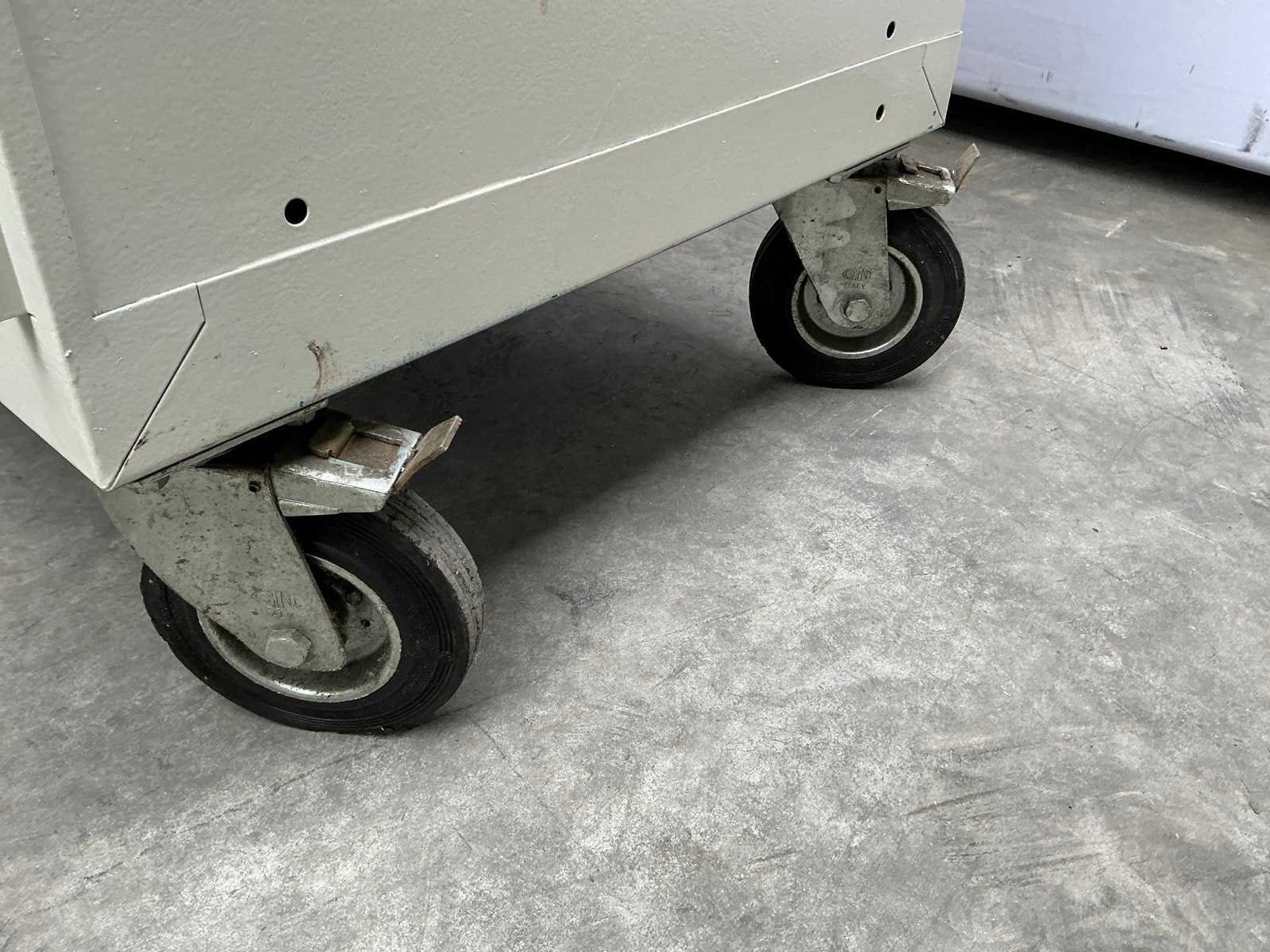 Voorzien van 2 vaste transportwielen en 2 draaibare met rem; kast met inhoud Nee Kleur: Gebroken wit Lengte: 1100cm Breedte: 610cm Hoogte: 1070cm Materiaal: Metaal