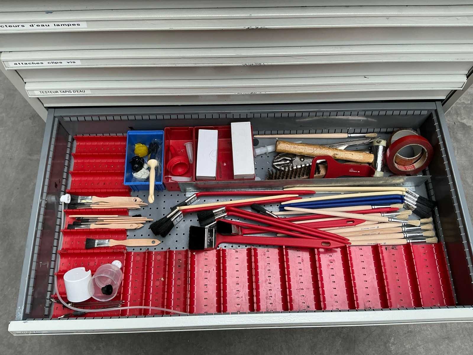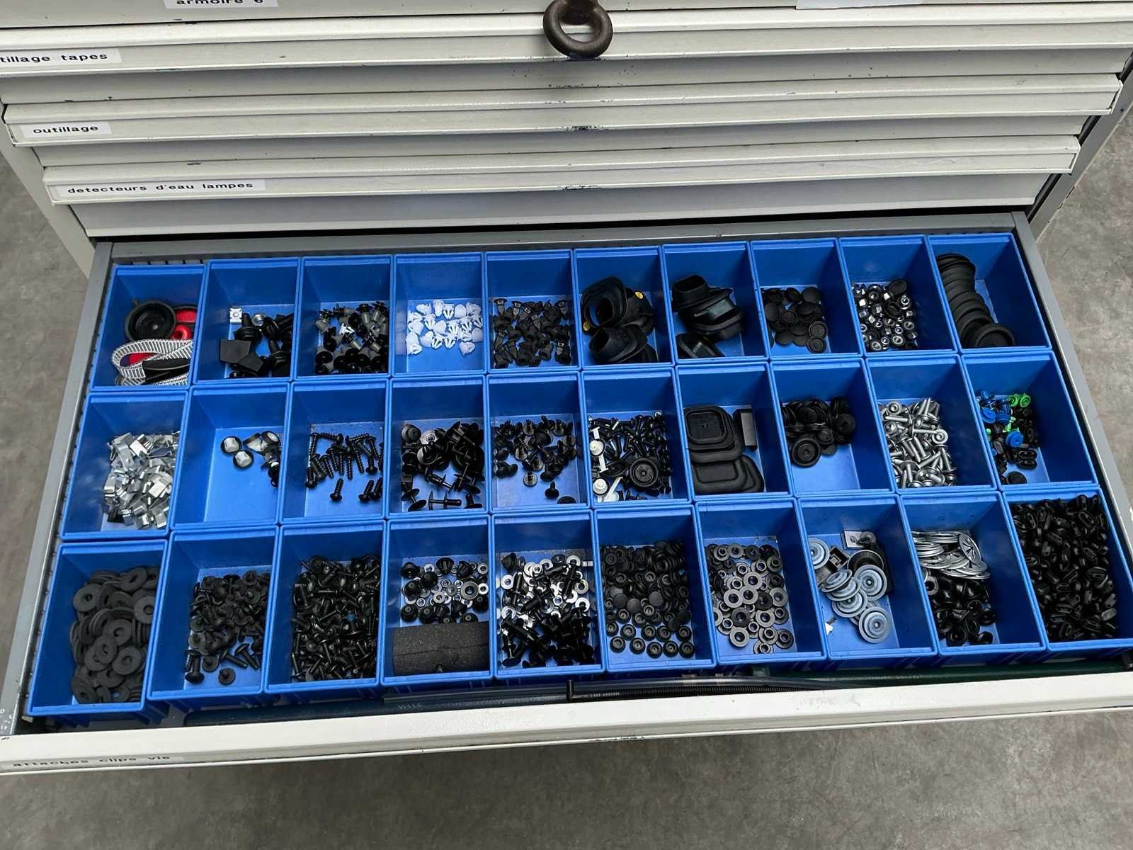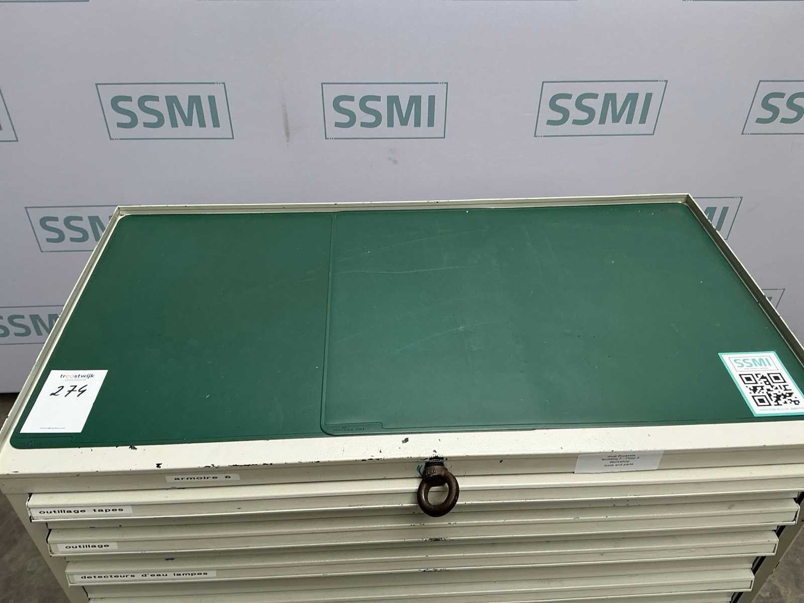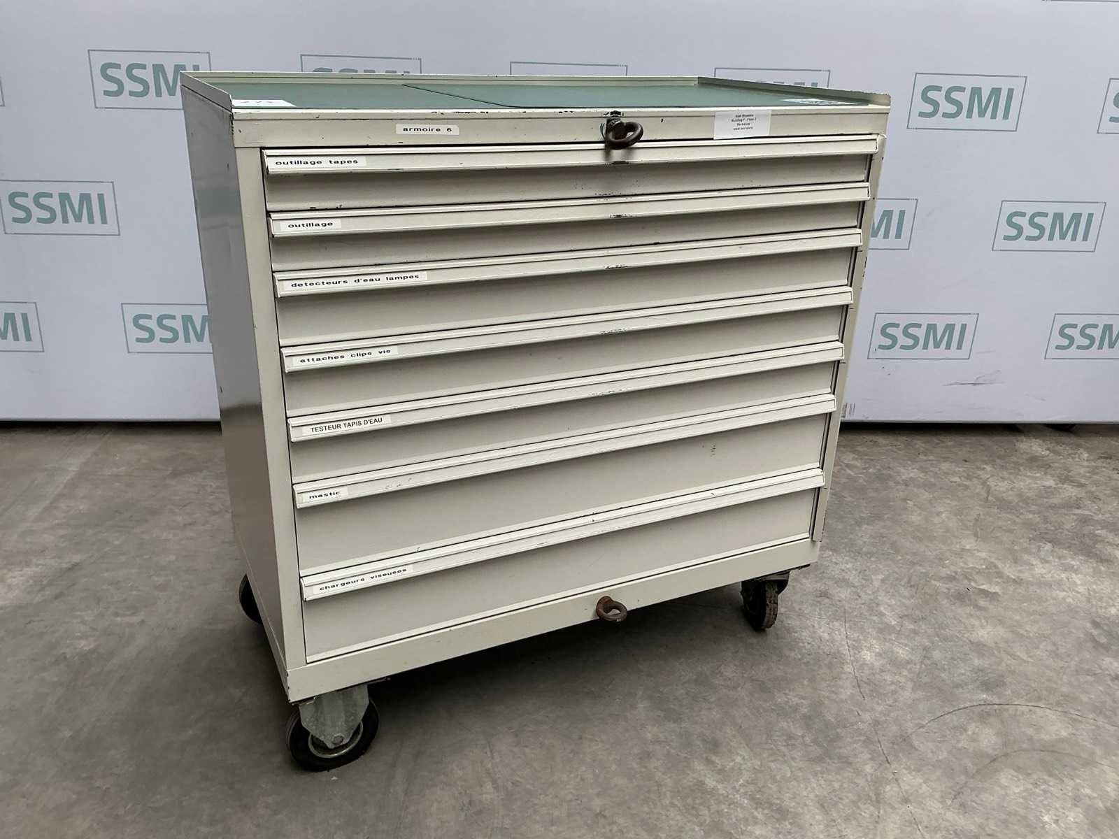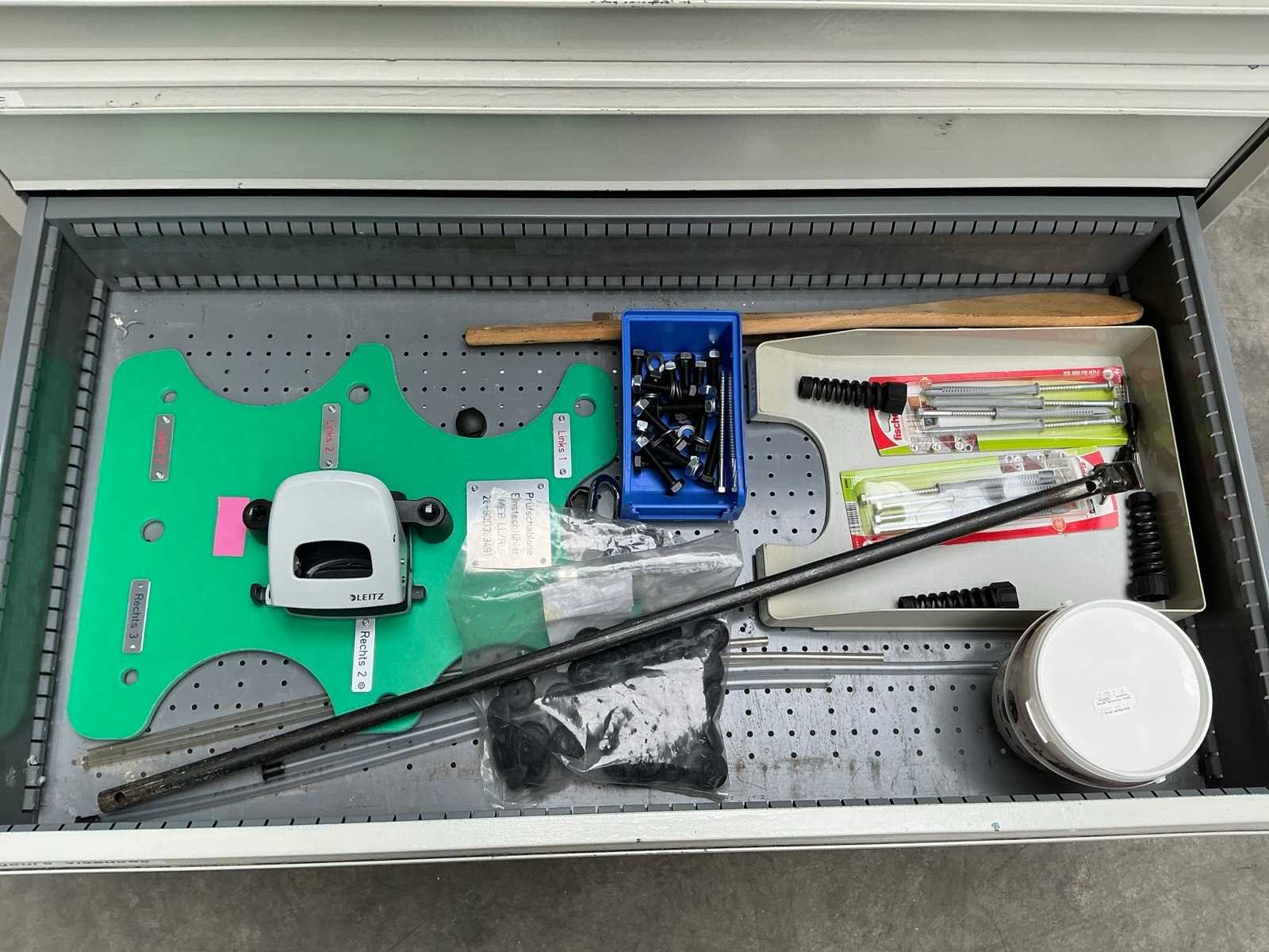 Voorzien van 2 vaste transportwielen en 2 draaibare met rem; kast met inhoud Nee Kleur: Gebroken wit Lengte: 1100cm Breedte: 610cm Hoogte: 1070cm Materiaal: Metaal