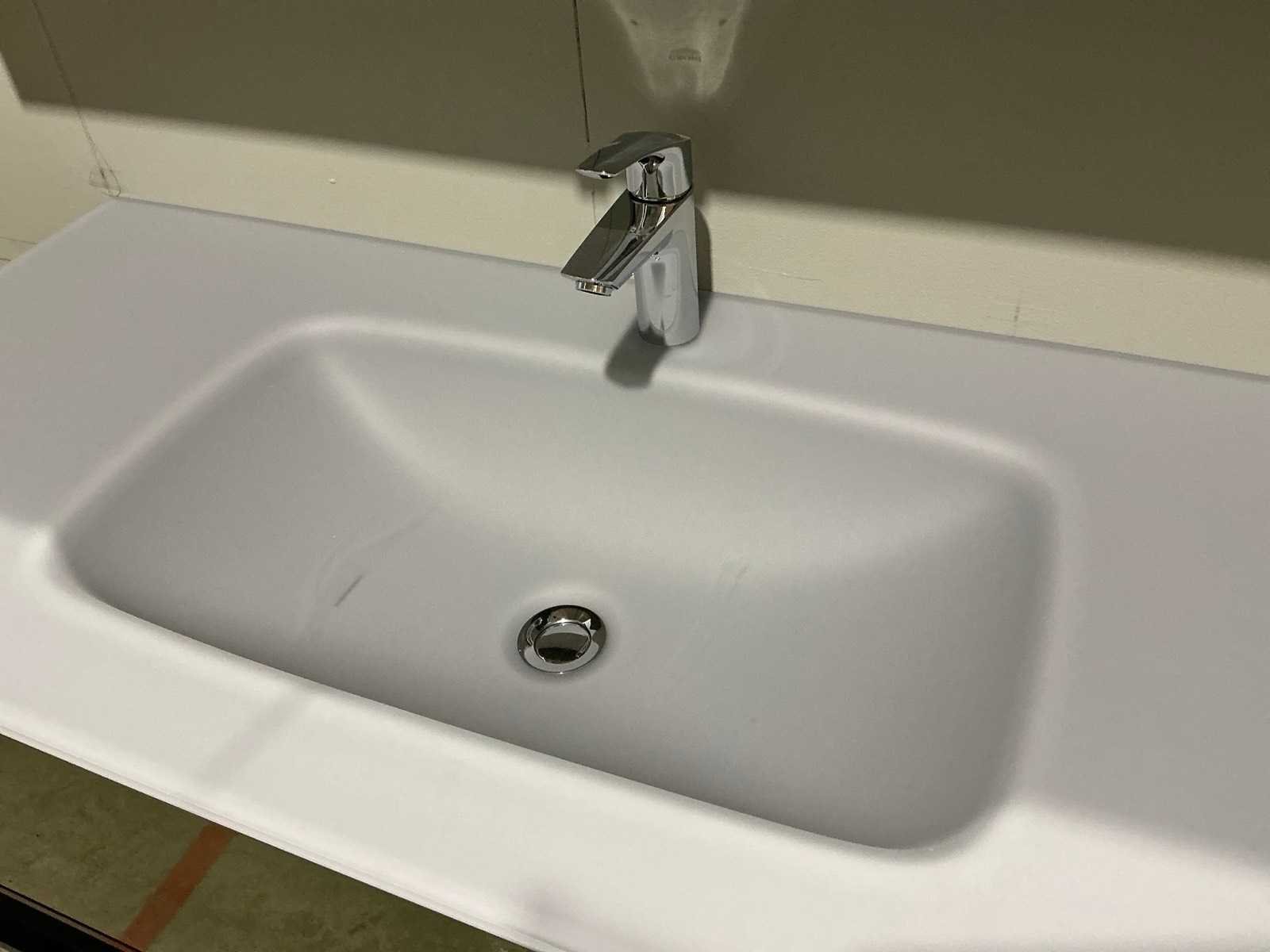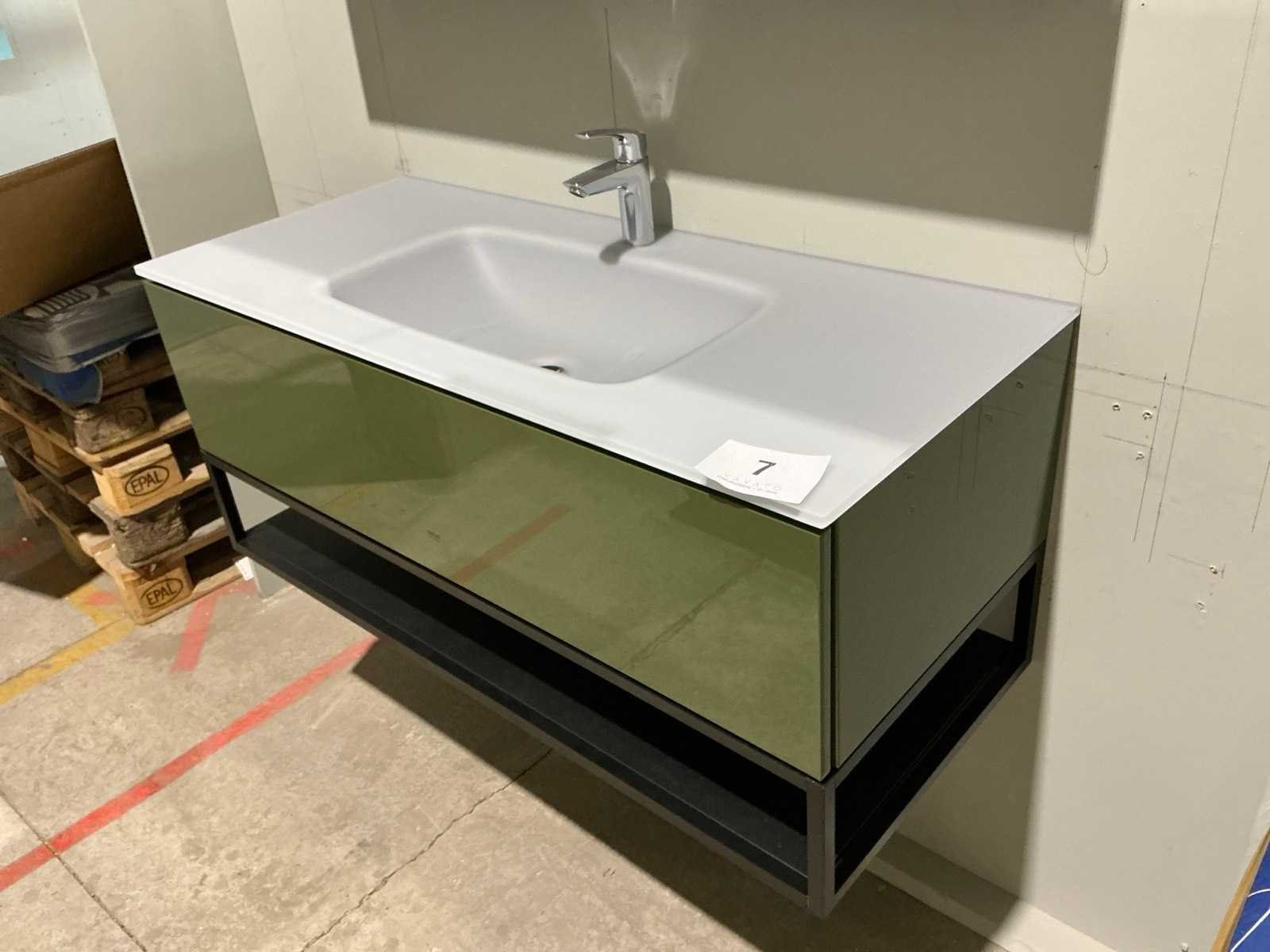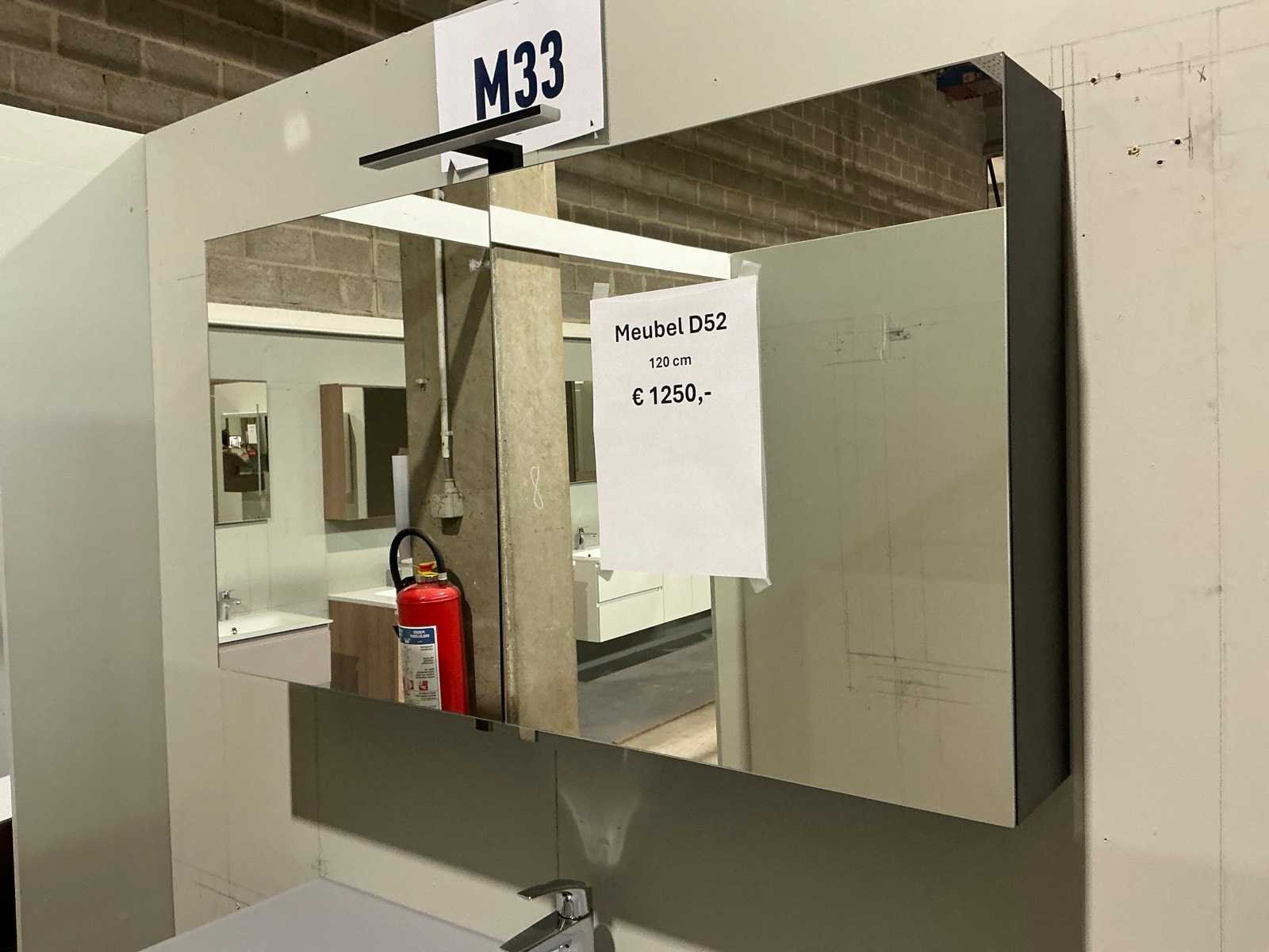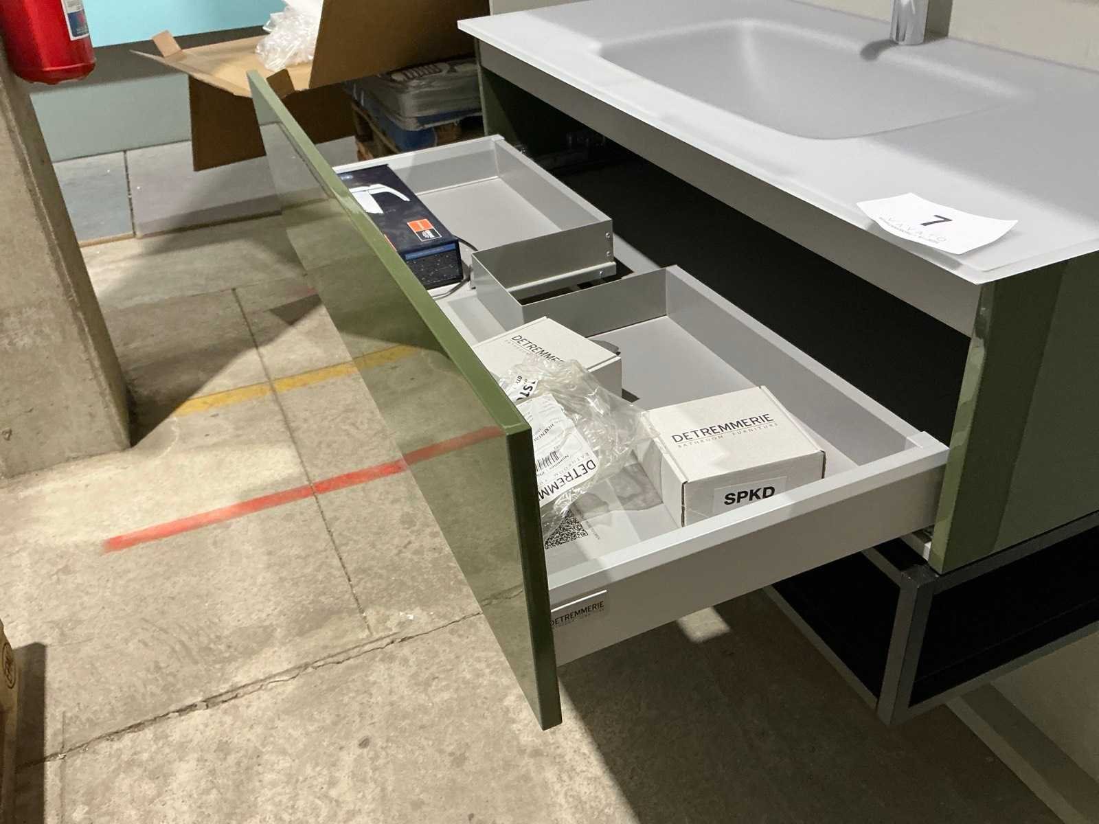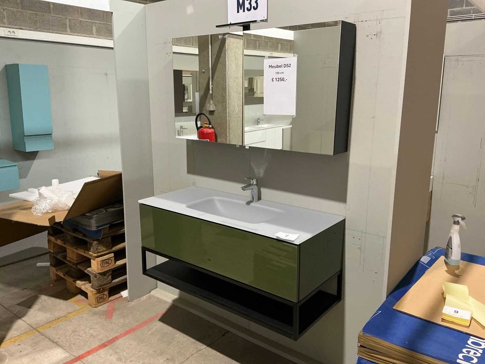 Voorzien van 1x schuiflade, 1x open opbergvak en enkele wastafel. Compleet met kraanwerk Grohe en spiegelkast (licht beschadigd) voorzien van 2x deur met afmetingen ca. 120 x 65 x 17cm. Door koper te demonteren van omgeving. Nee Merk: Detremmerie Lengte: 120cm Breedte: 51cm Hoogte: 52cm