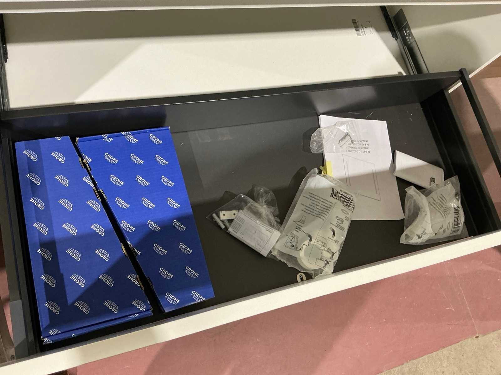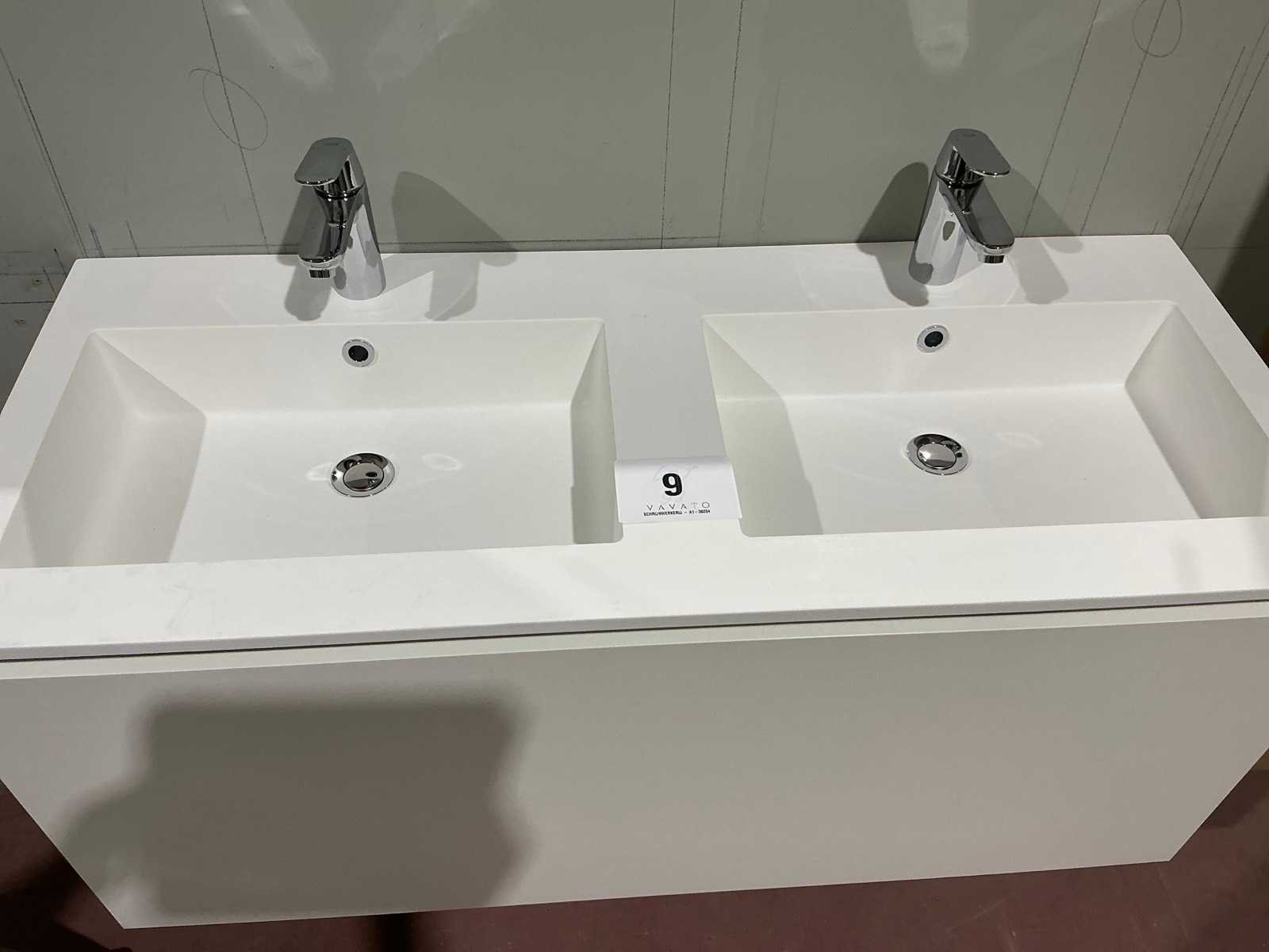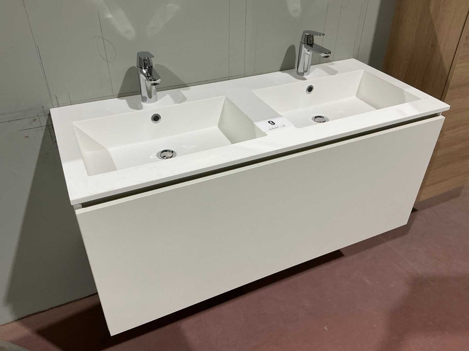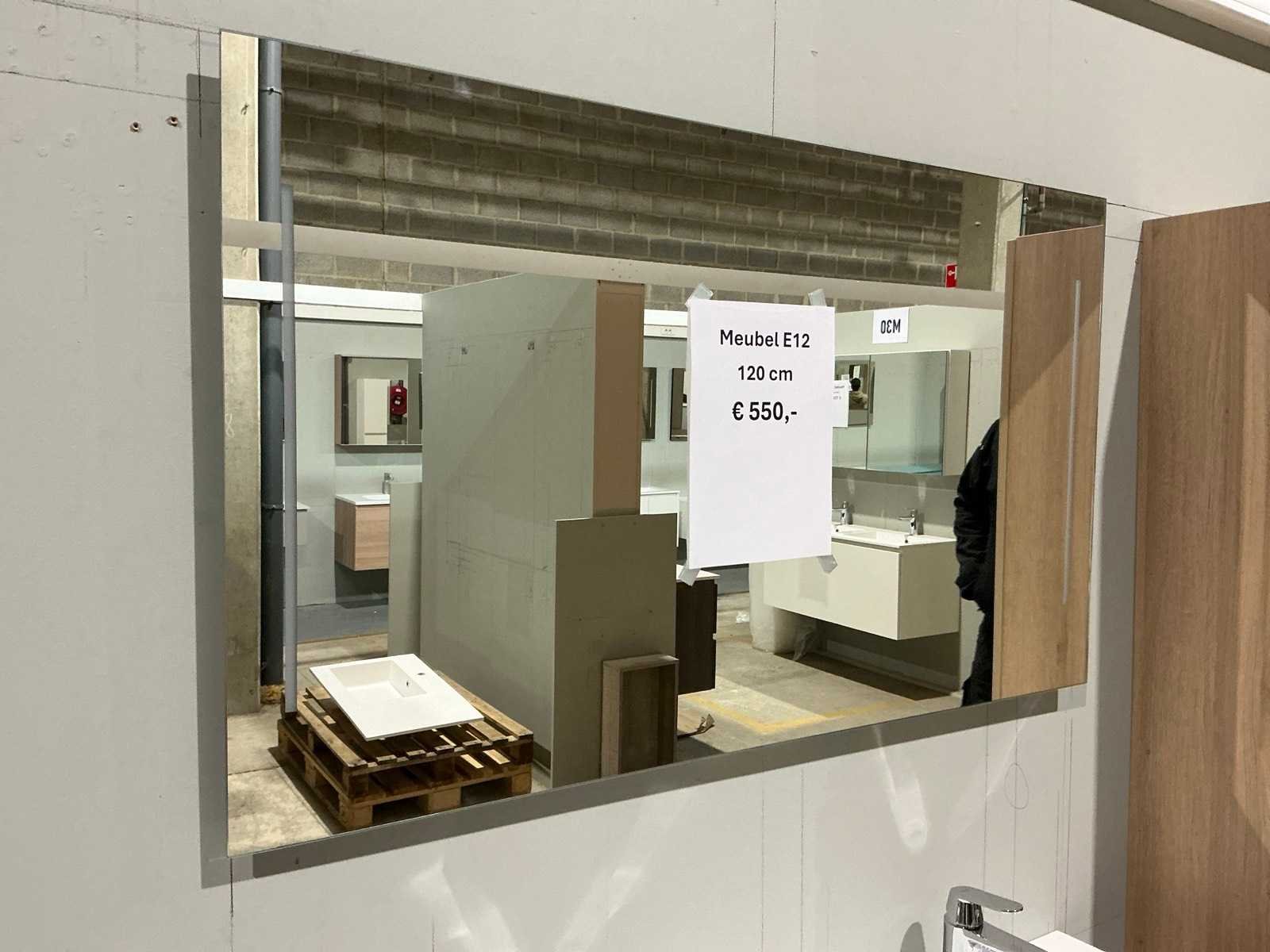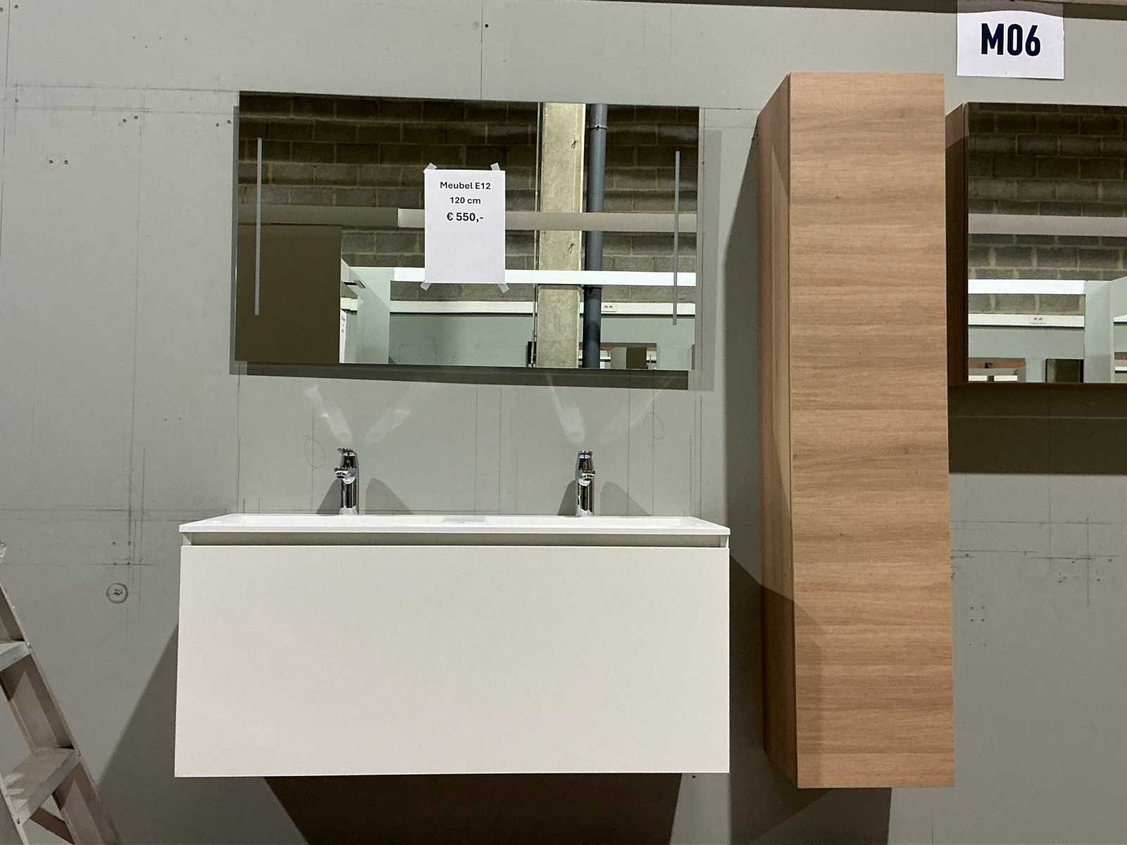 Voorzien van 1x schuiflade en dubbele wastafel. Compleet met kraanwerk Grohe en spiegel voorzien van ledverlichting met afmetingen ca. 120 x 70cm. Compleet met kolomkast met afmetingen ca. 37 x 35 x 168cm. Door koper te demonteren van omgeving. Nee Lengte: 120cm Breedte: 50cm Hoogte: 53cm