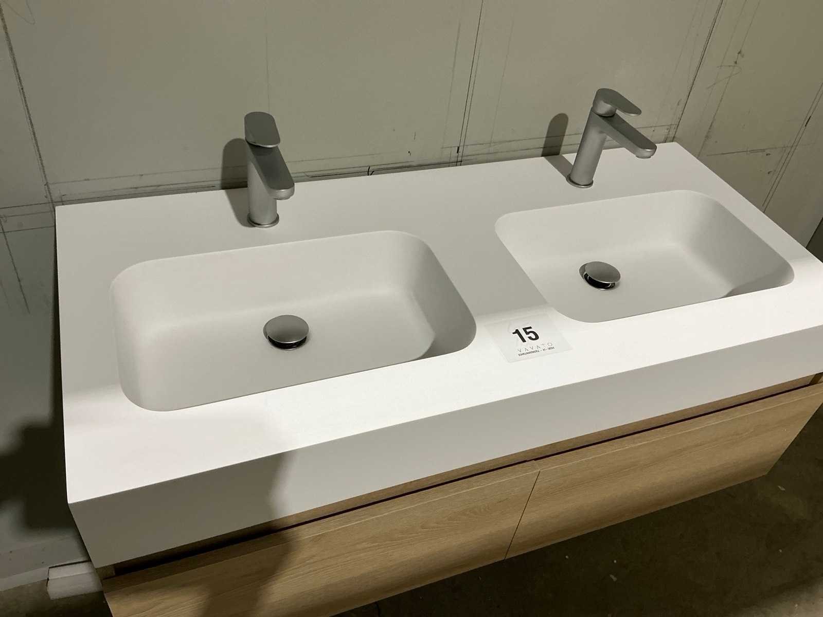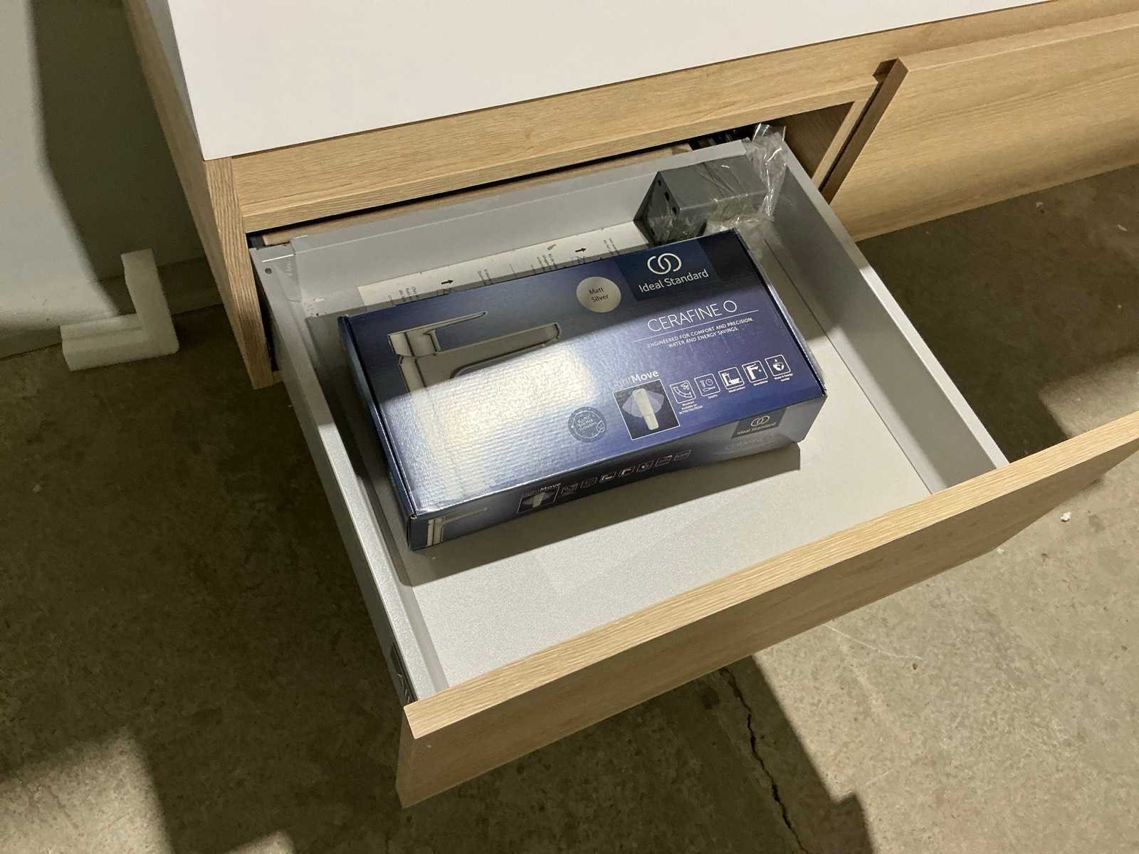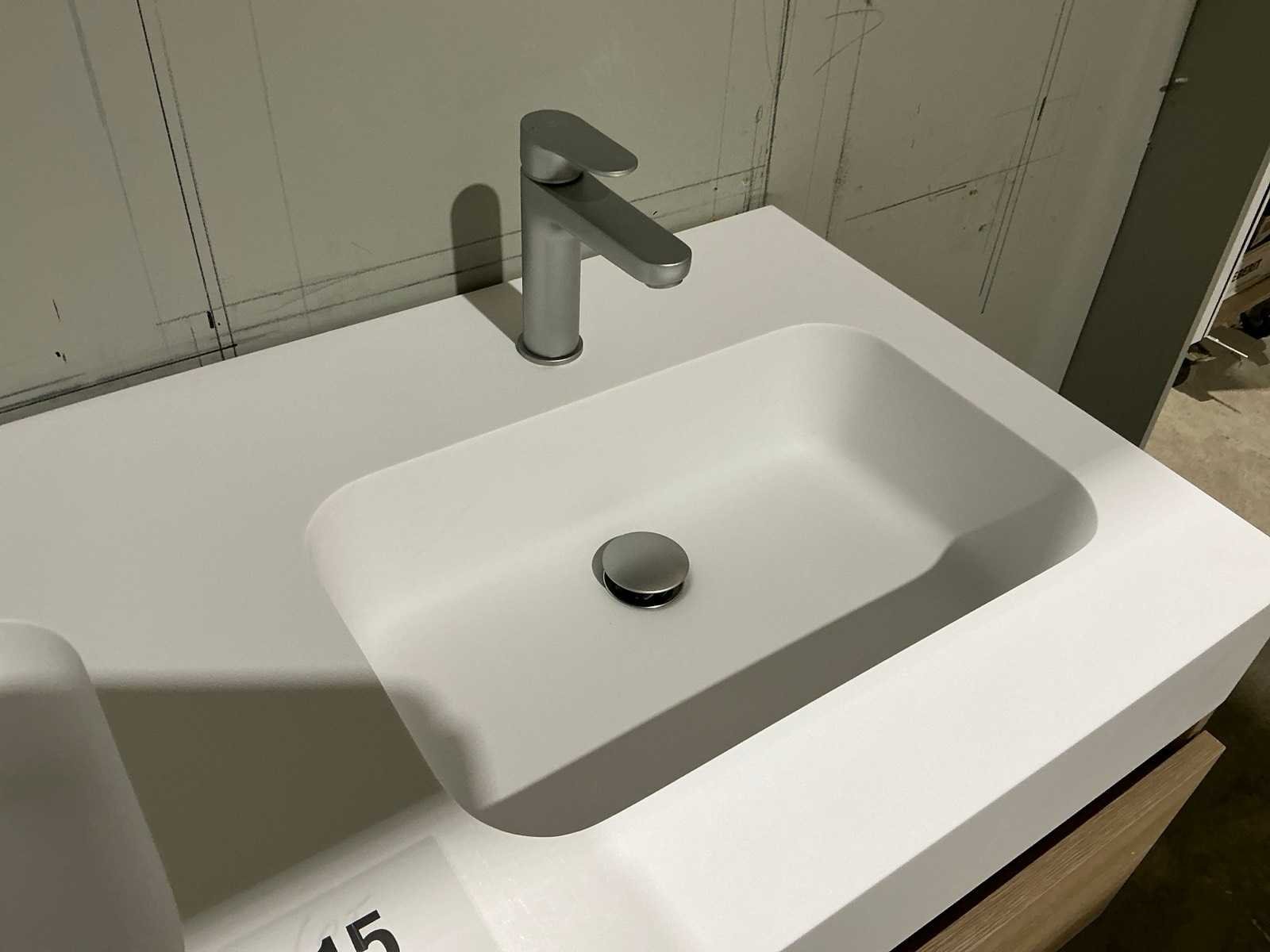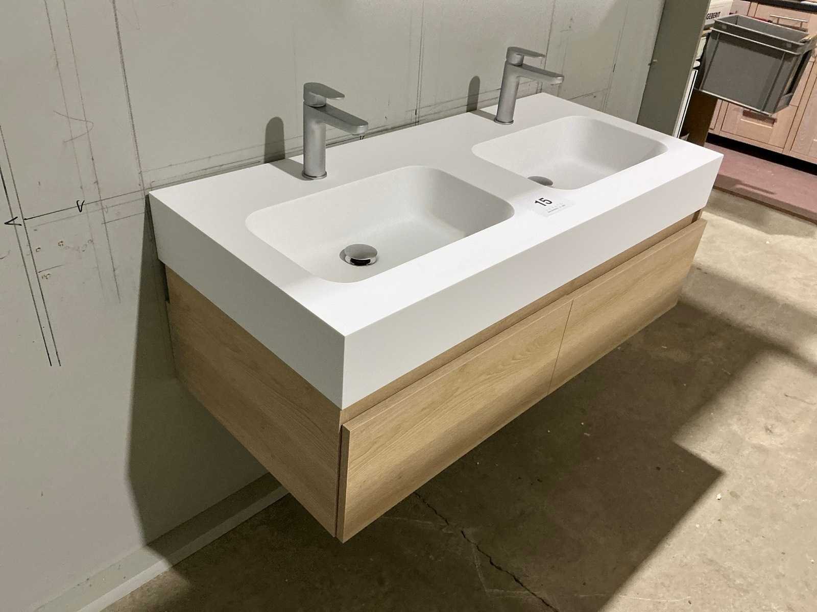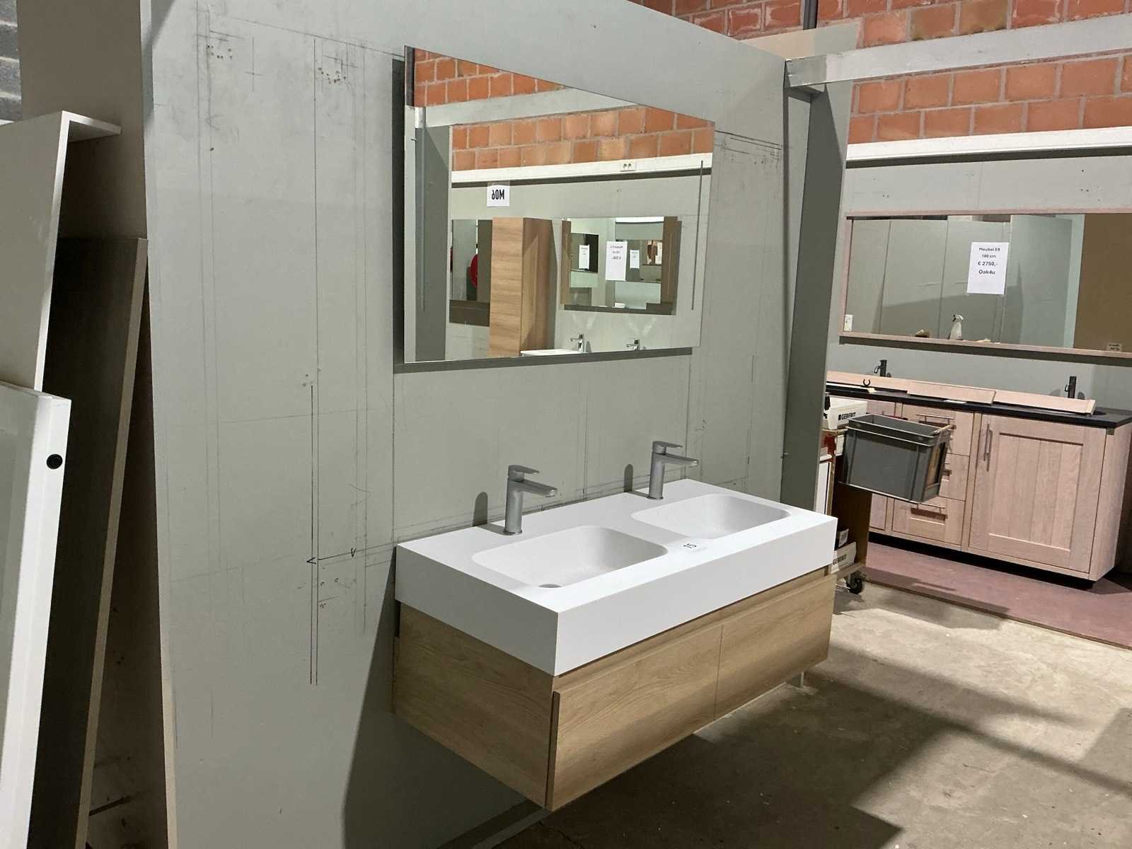 Voorzien van 2x schuiflade en dubbele wastafel. Compleet met kraanwerk Ideal Standard en spiegel voorzien van ledverlichting met afmetingen ca. 120 x 70cm. Door koper te demonteren van omgeving. Nee Merk: Alke Lengte: 120cm Breedte: 57cm Hoogte: 45cm