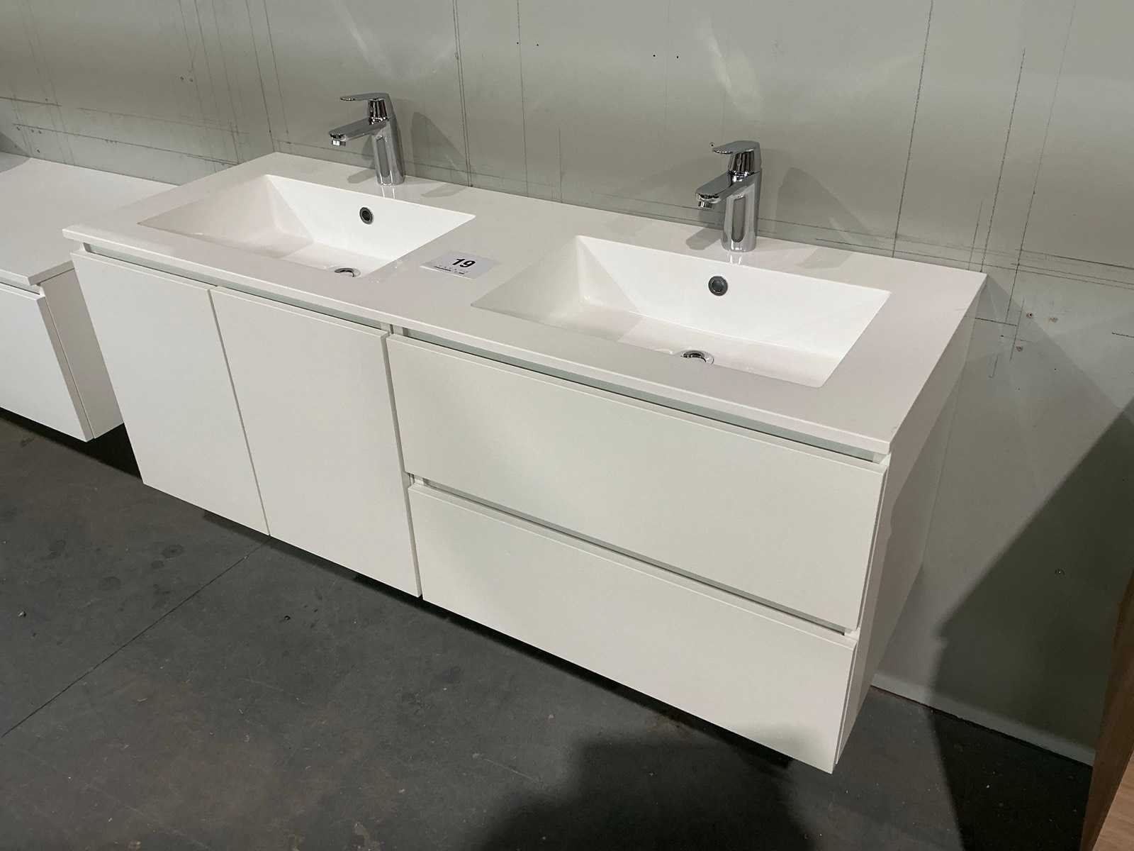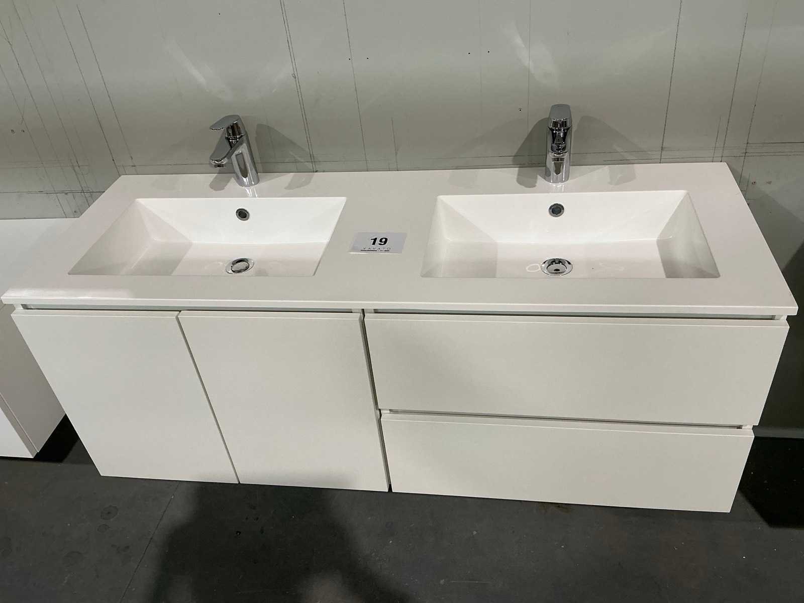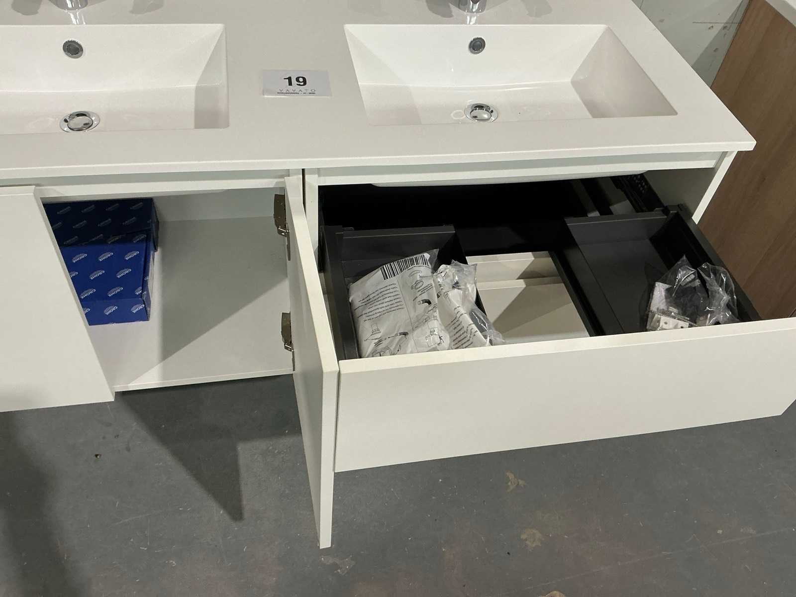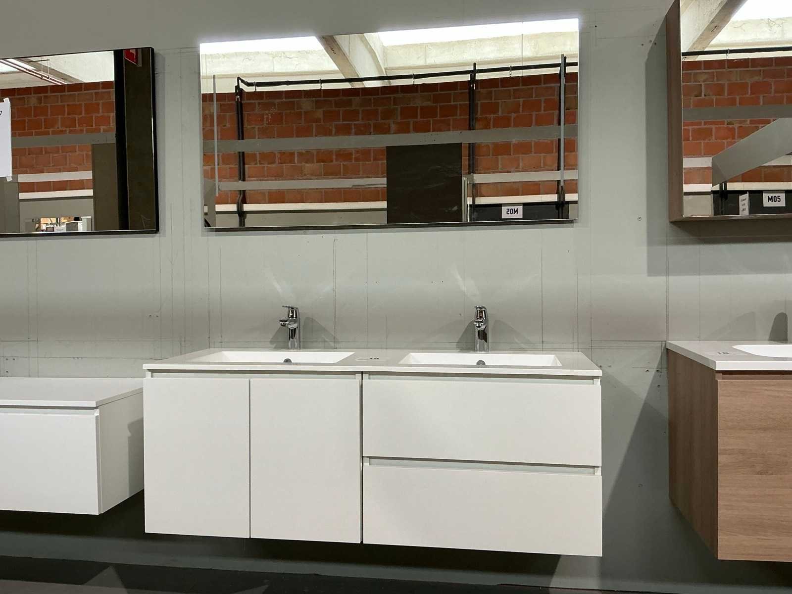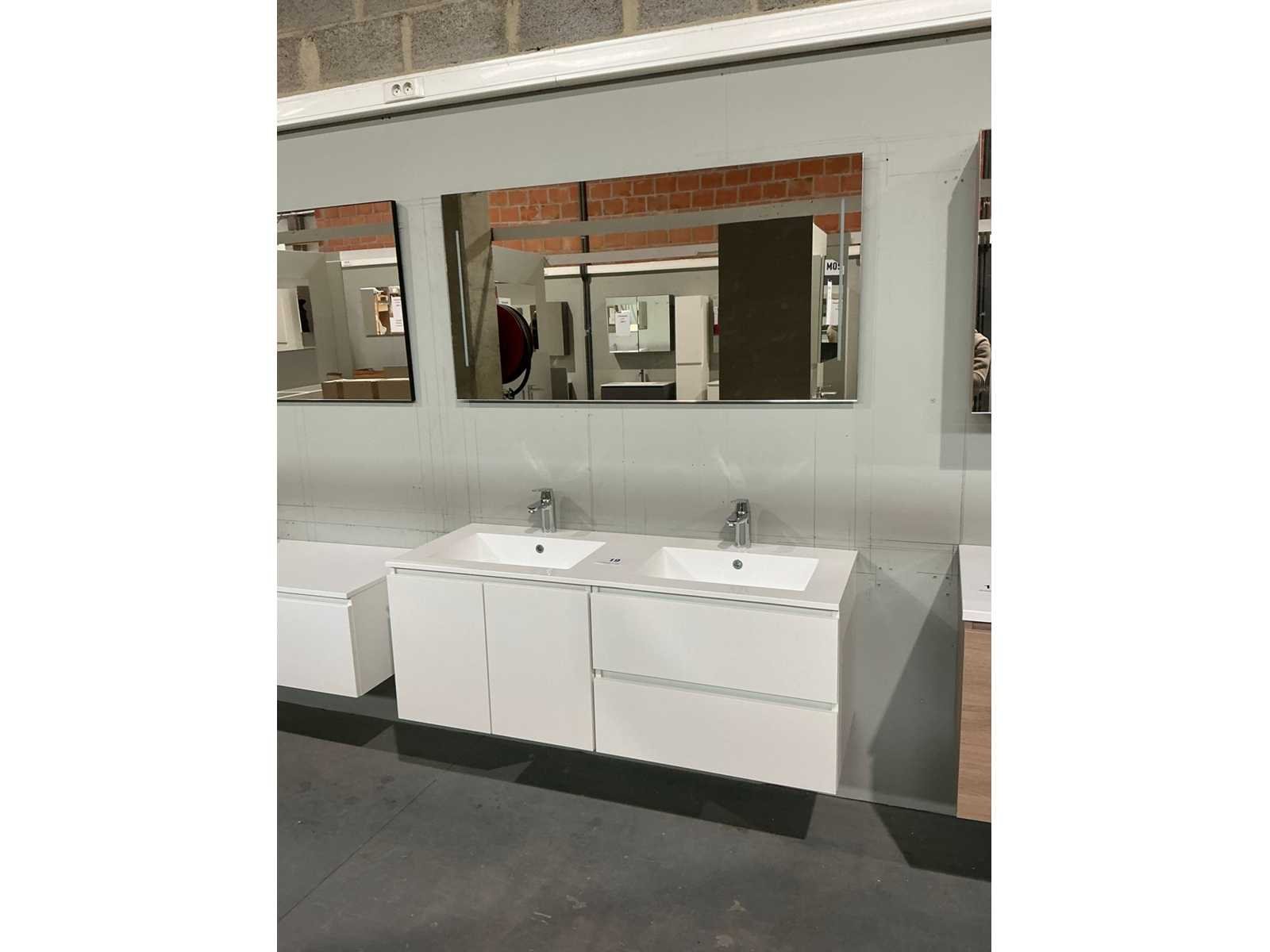 Voorzien van 2x onderkast waaronder 1x met 2x schuiflade en 1x met 2x kastdeur en afmetingen ca. 70 x 50 x 52cm kastdeur en dubbele wastafel. Compleet met kraanwerk Grohe en 2x spiegel met Ledverlichting met afmetingen ca. 140 x 70cm. Door koper te demonteren van omgeving. Nee Lengte: 140cm Breedte: 50cm Hoogte: 52cm