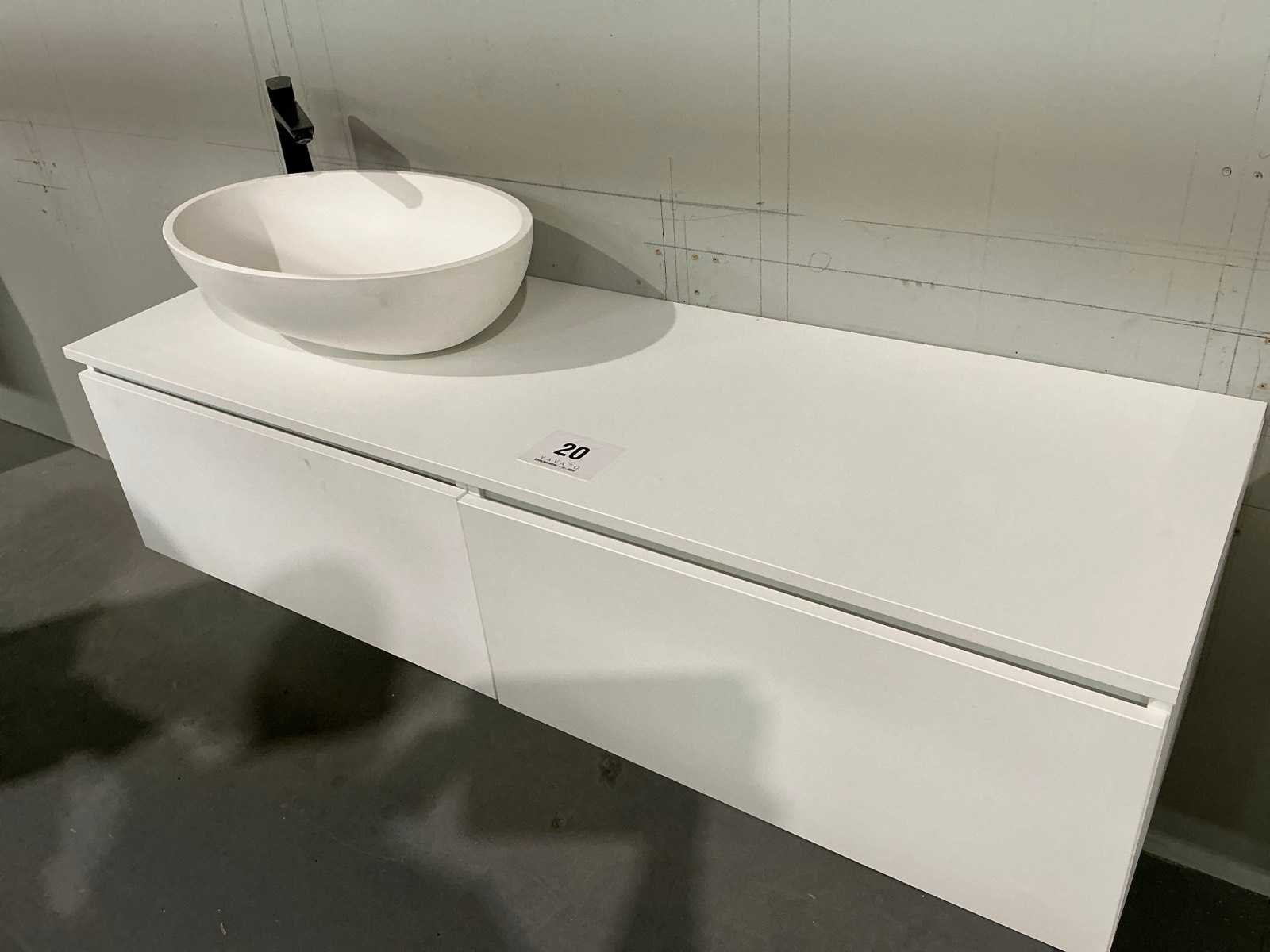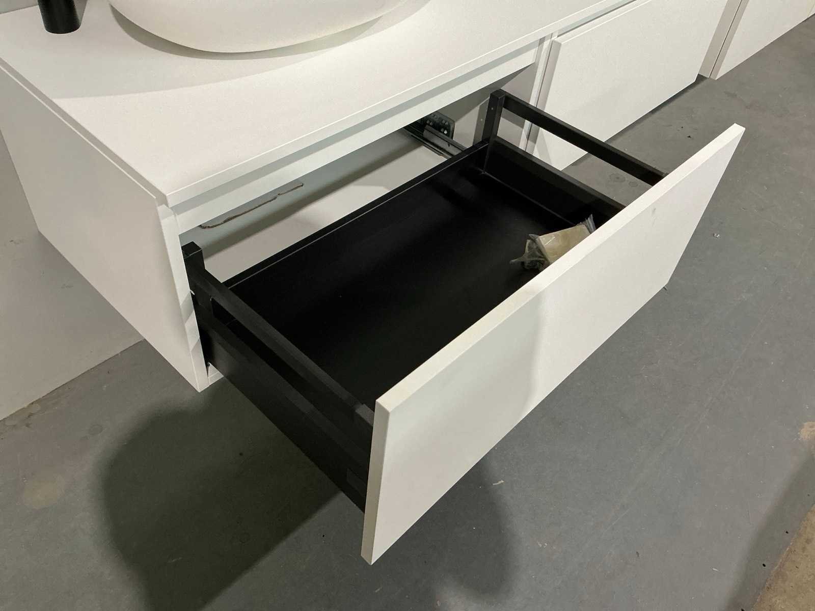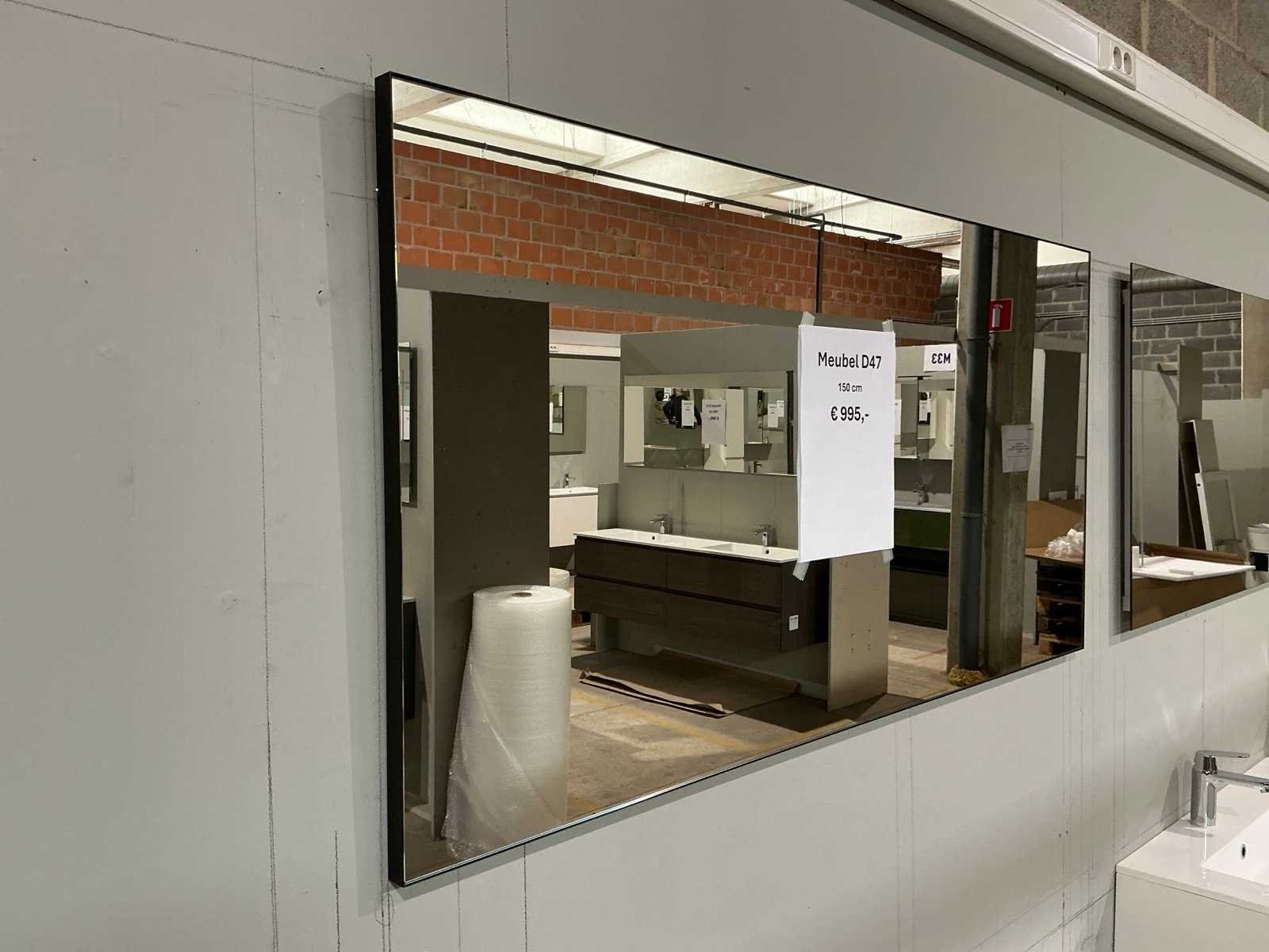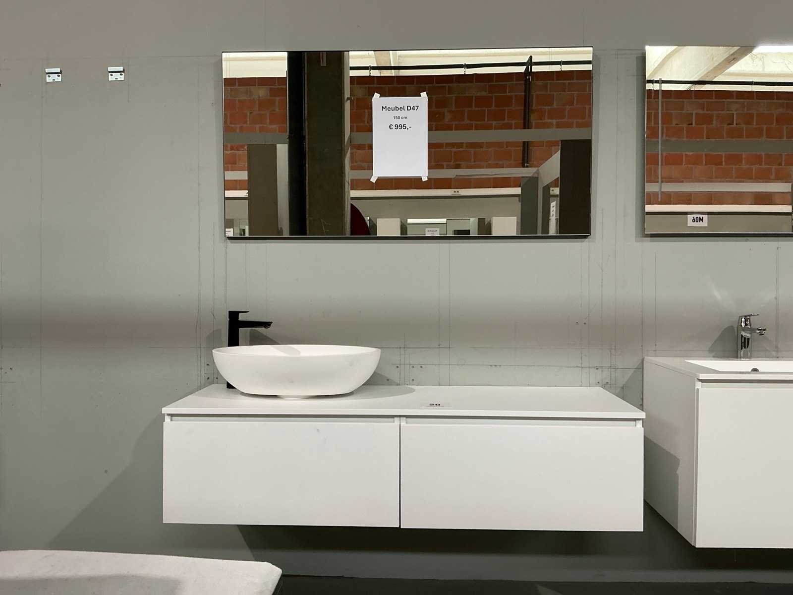 Voorzien van 2x schuiflade. Compleet met opbouw waskom, kraanwerk Hansgrohe en spiegel met afmetingen ca. 140 x 70cm. Door koper te demonteren van omgeving. Nee Lengte: 140cm Breedte: 50cm Hoogte: 37cm