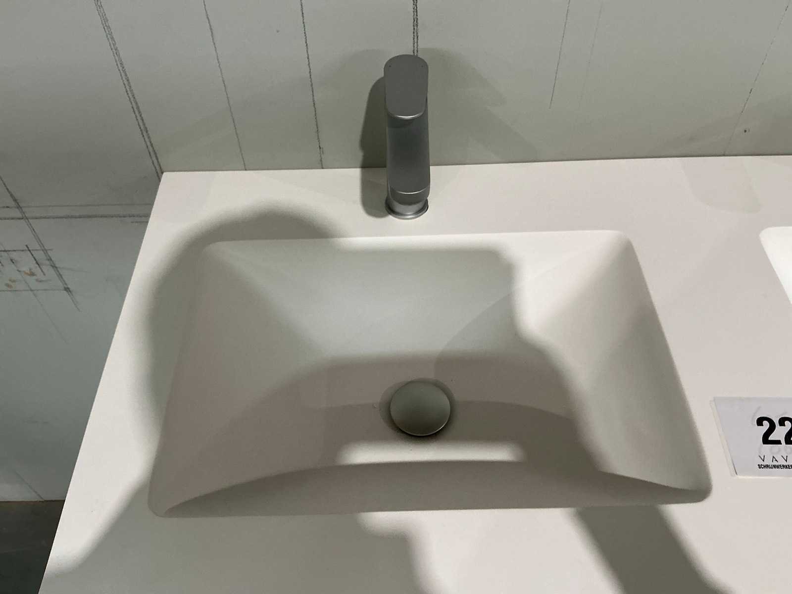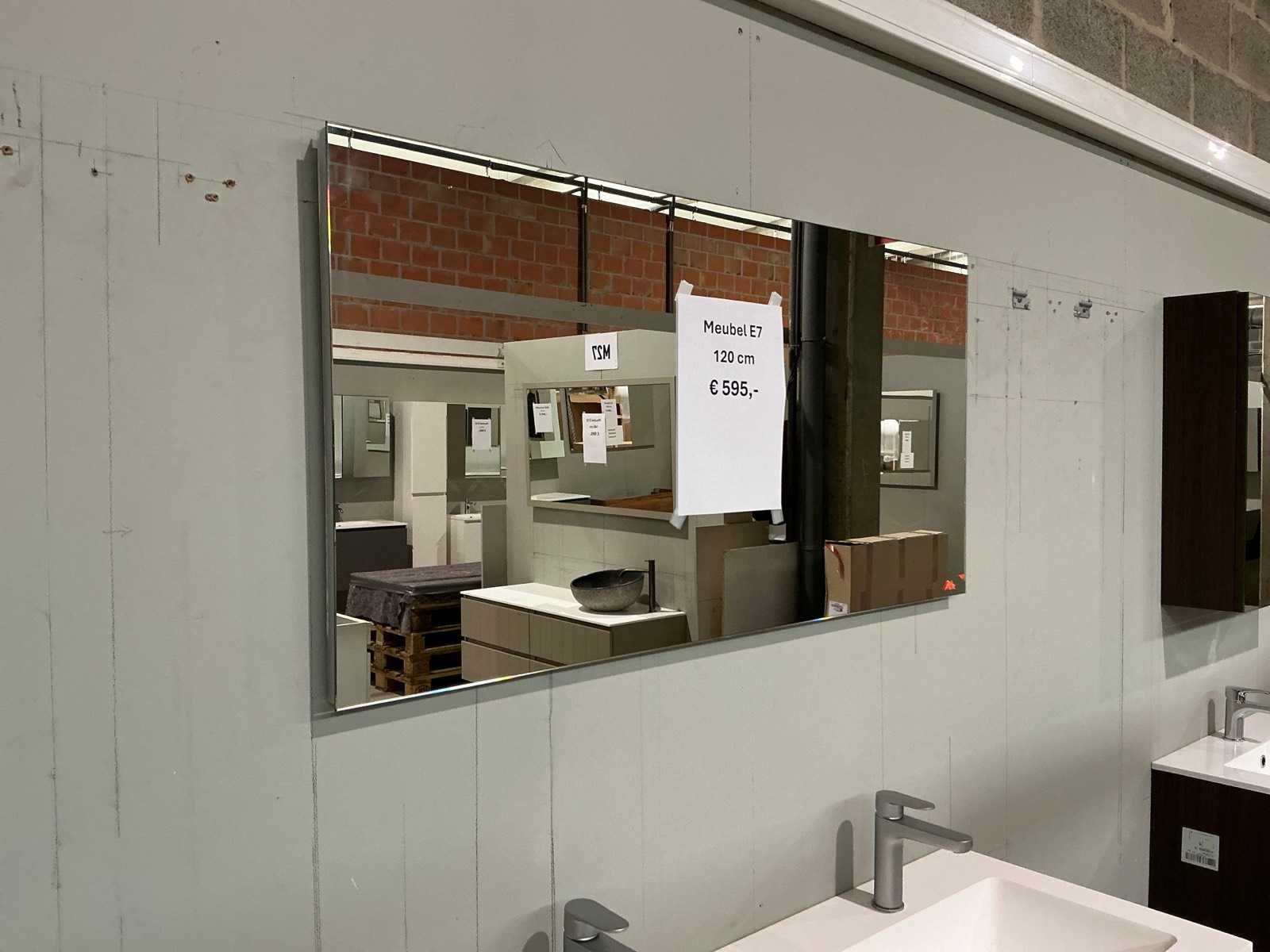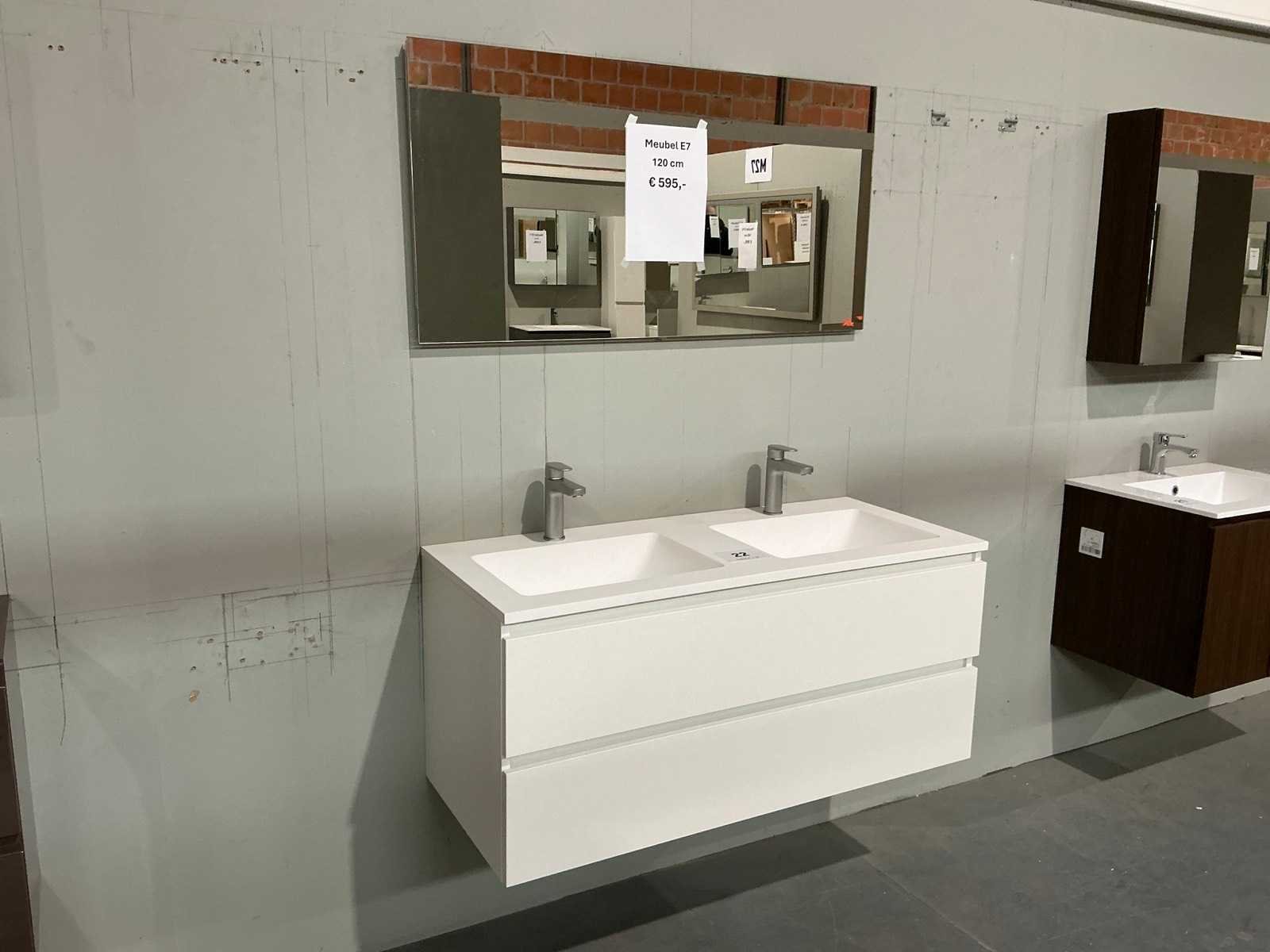 Voorzien van 2x schuiflade en dubbele wastafel. Compleet met kraanwerk Ideal Standard en spiegel met afmetingen ca. 120 x 60cm. Door koper te demonteren van omgeving. Nee Lengte: 120cm Breedte: 50cm Hoogte: 54cm